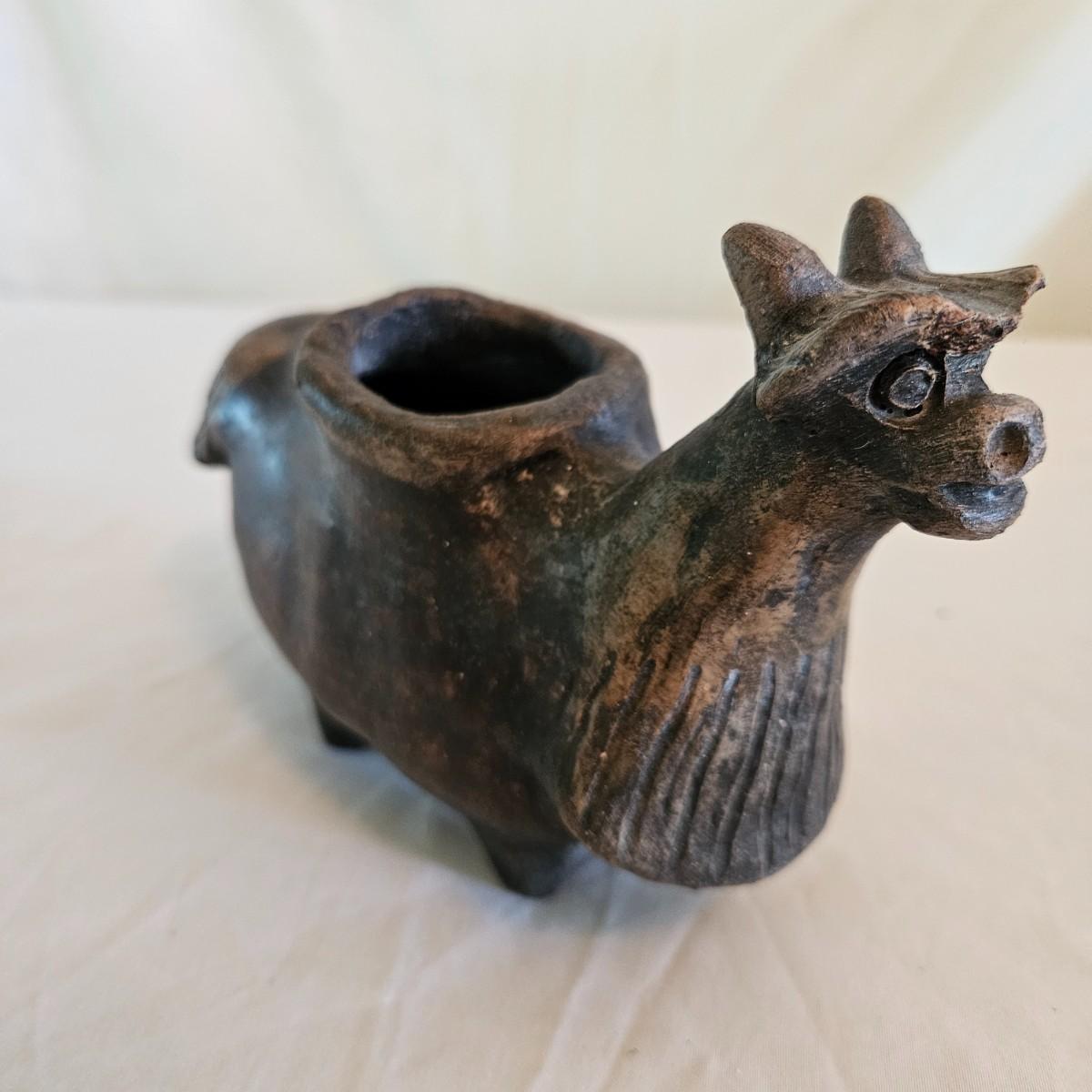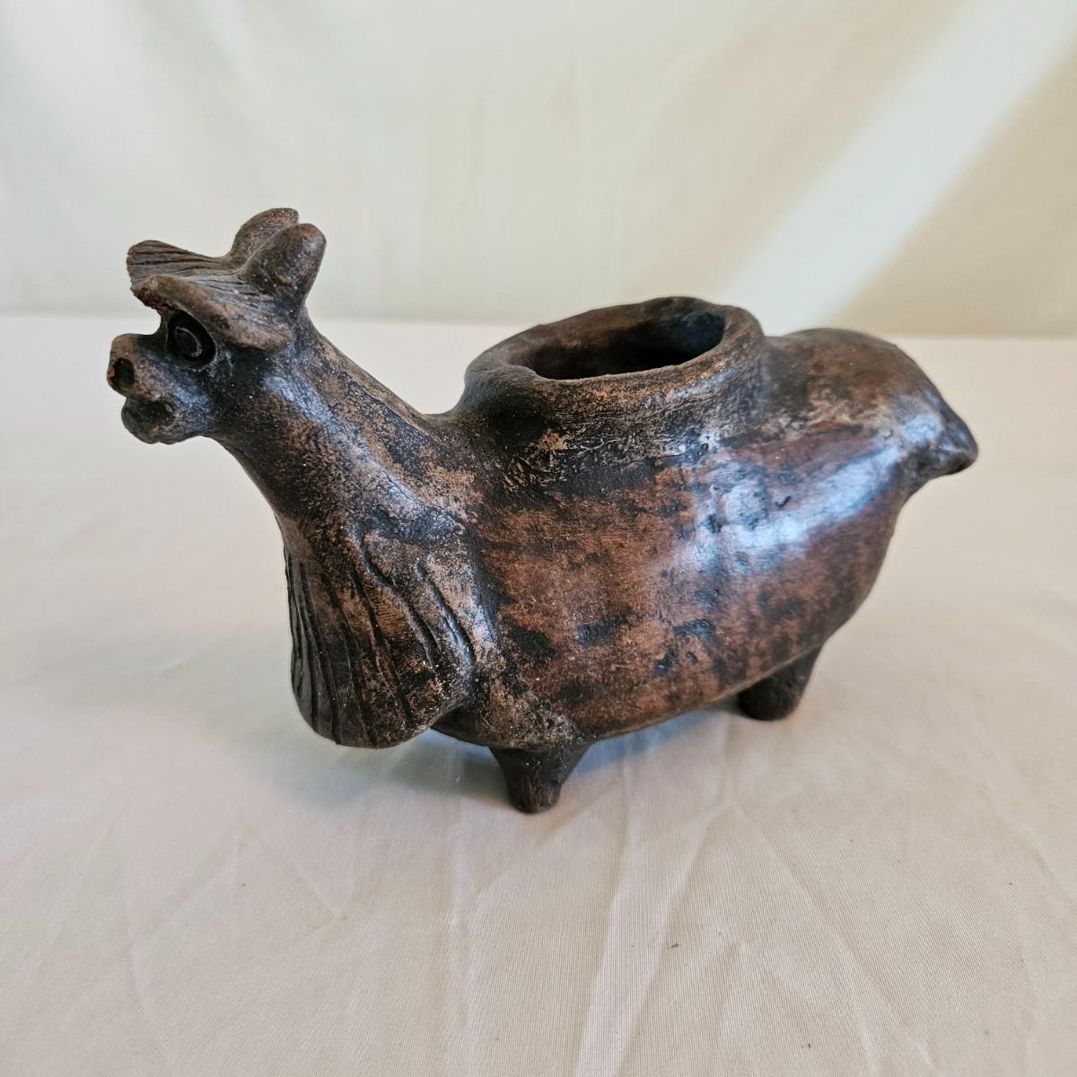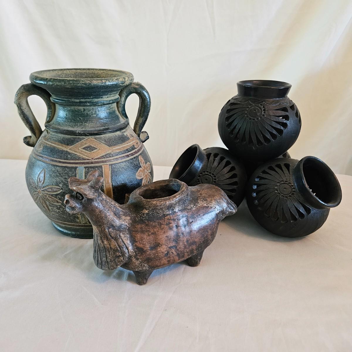 A trio of pottery pieces that includes a primitive llama vase, a pottery vase with handles and a floral motif. Also includes a dark colored set of four stacked vases that are all connected together and measures approximately 8"D x 7.5"H. Shipping available