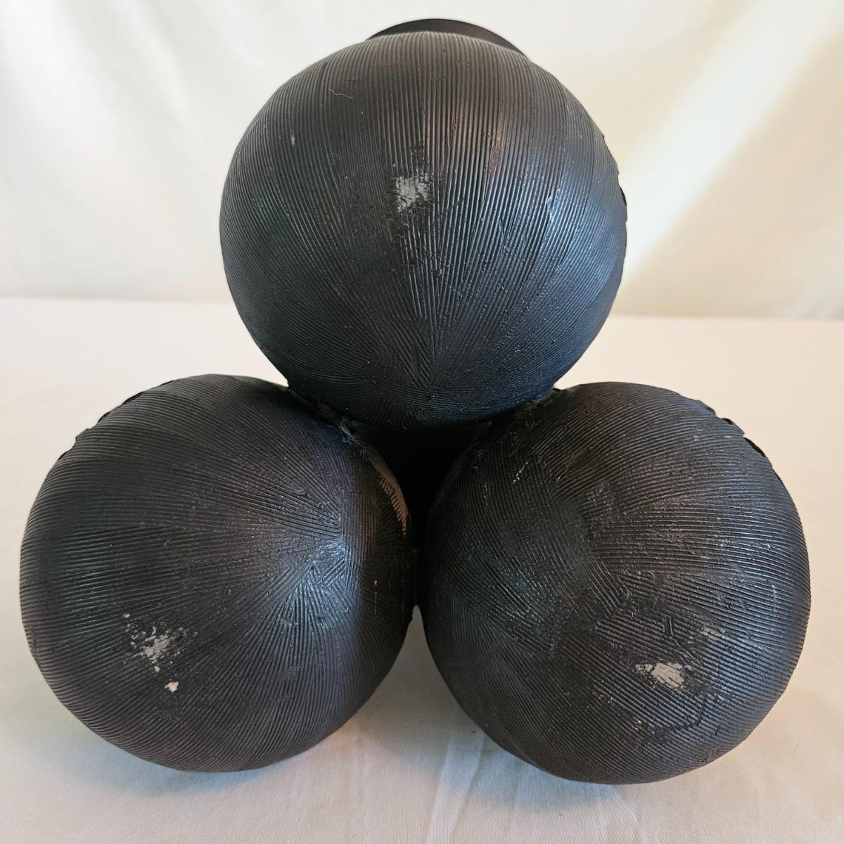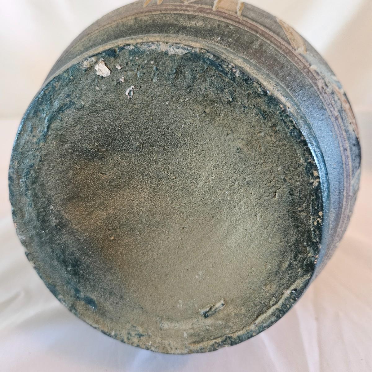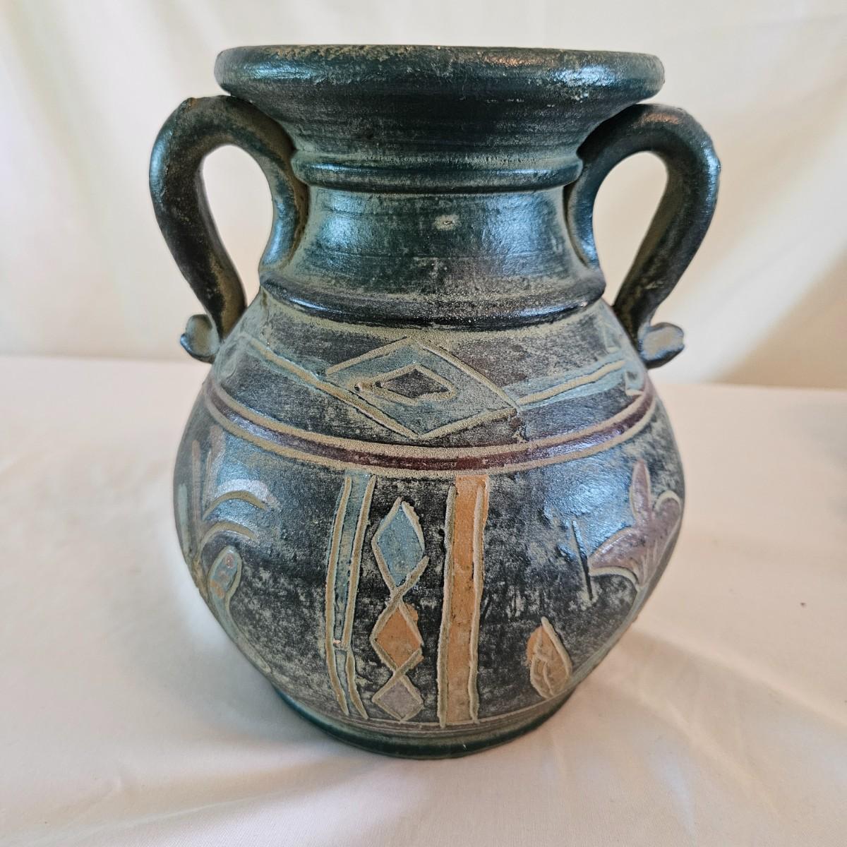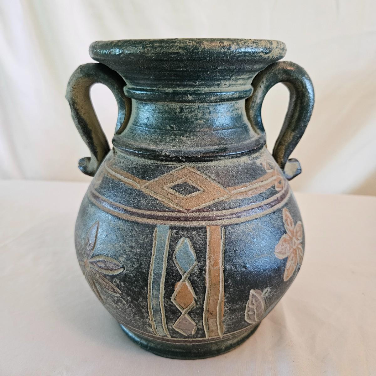 A trio of pottery pieces that includes a primitive llama vase, a pottery vase with handles and a floral motif. Also includes a dark colored set of four stacked vases that are all connected together and measures approximately 8"D x 7.5"H. Shipping available