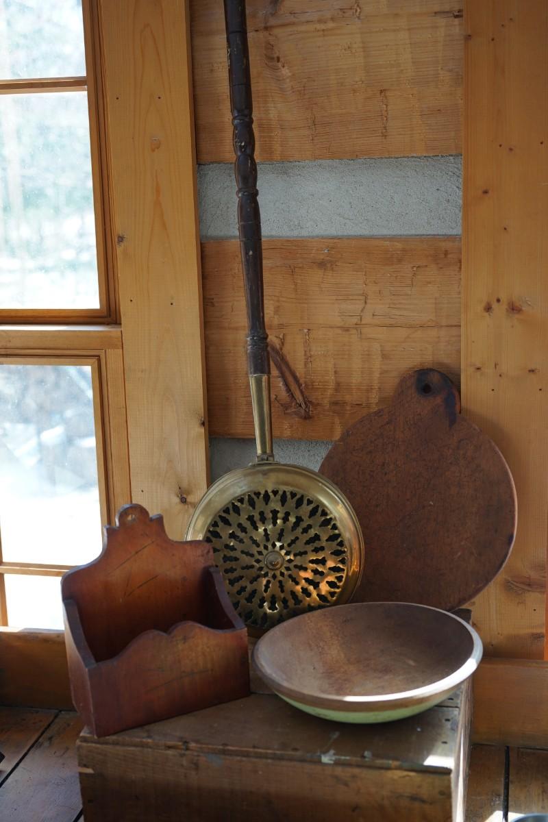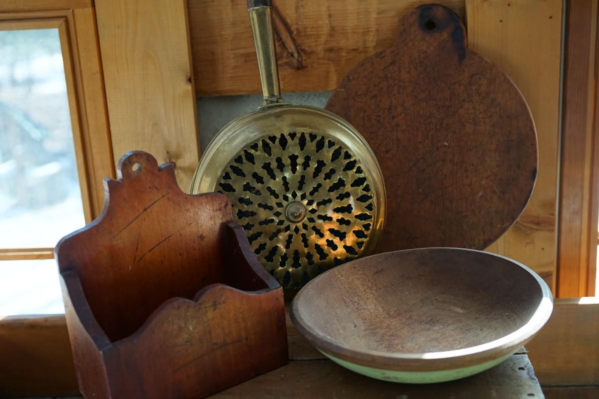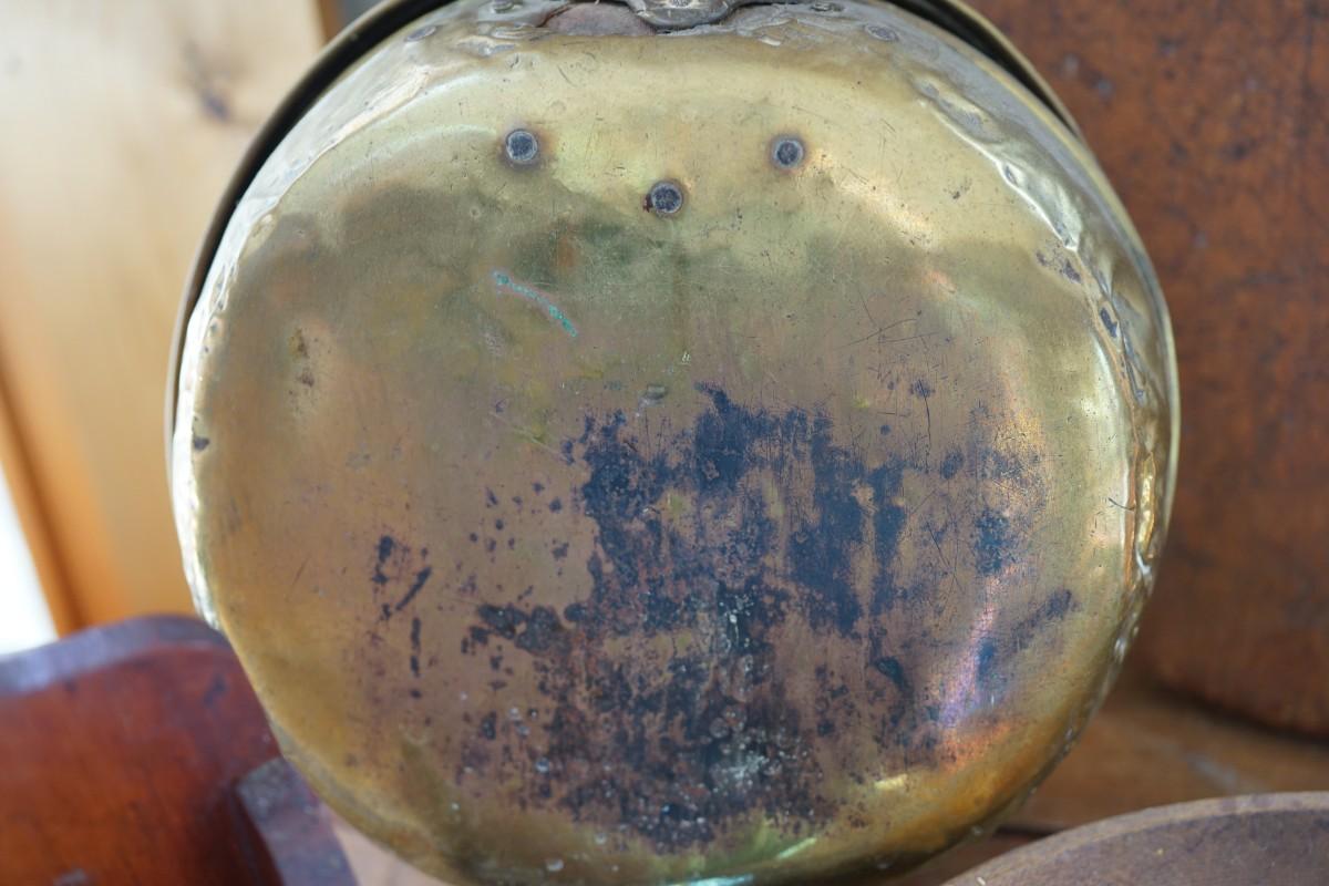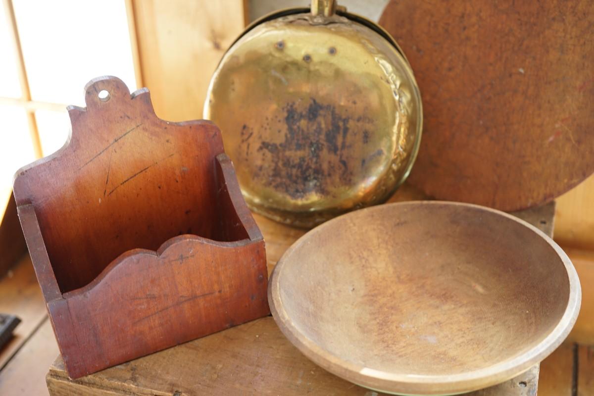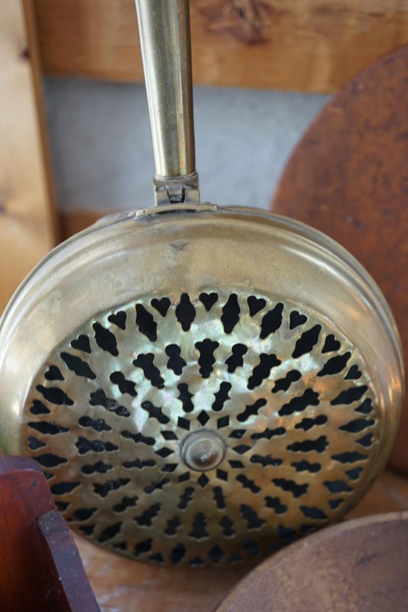 grouping of primitive favorites to include a brass bed warmer with turned handle. all original. The brass coal holder has brass discoloration on the back, several dents noted. slight wear