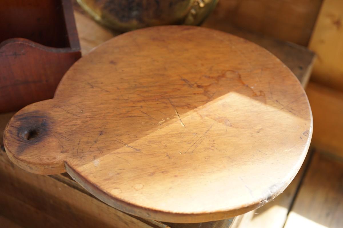 Antique round maple bread board with handle with hole to hang.