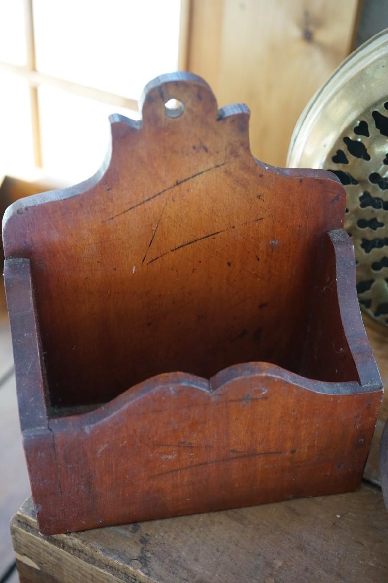 The hanging box has the original finish.. open cubby to place kitchen items. pretty cut out hand crafted frame. I think it is cherrywood. The back measures a height of 9" the front box part 7 1/2" by 3 1/2" the sides slant up to 5" good condition with hole to hang. there are some dark marks that may come out with wash. Some scratches noted but overall .. a great piece.