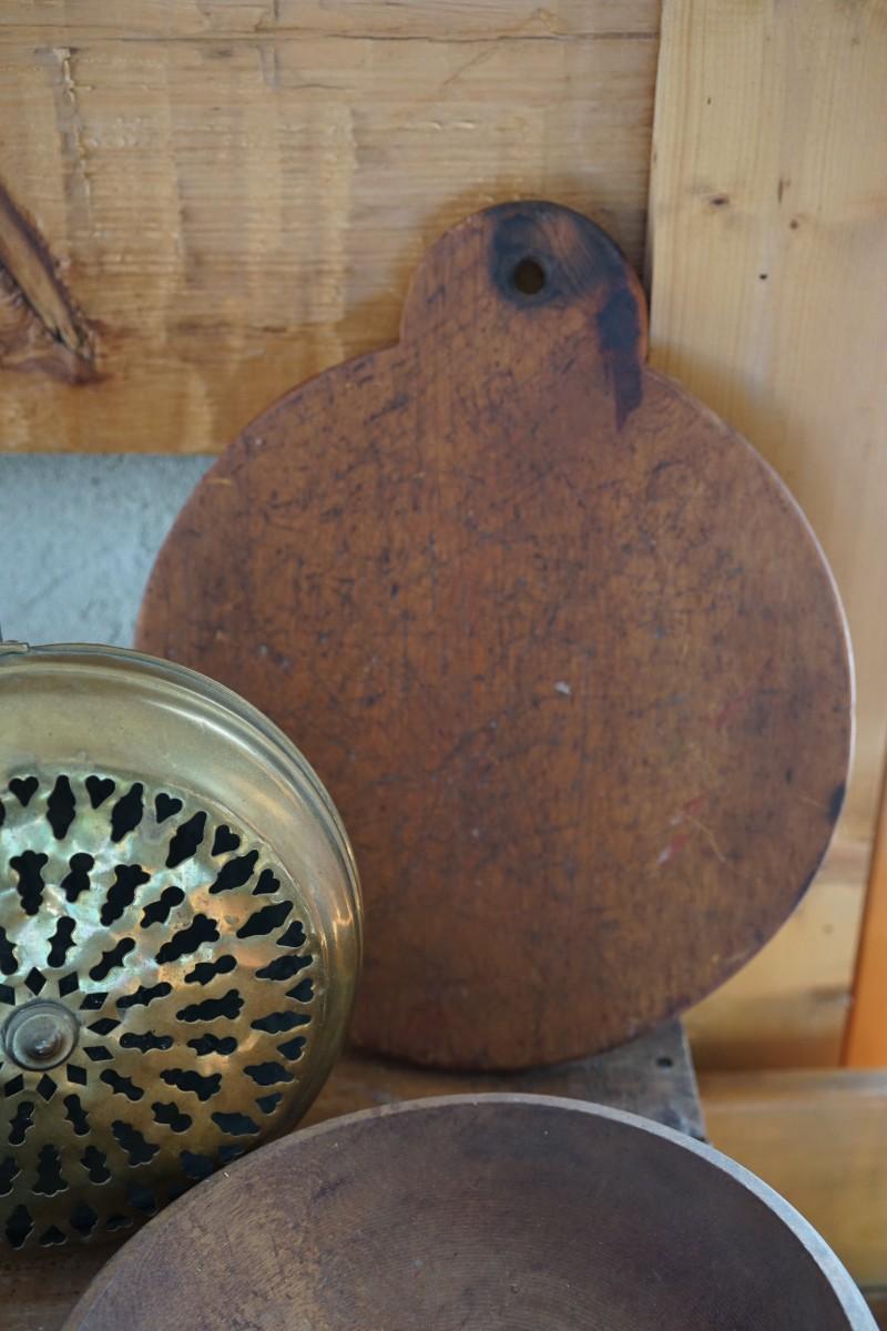 PRIMITIVE LOT TO INCLUDE BRASS BED WARMER/HANGING BOX/ ROUND HANDLED BREAD BOARD & WOOD BOWL W/ ORIGINAL GREEN PAINT