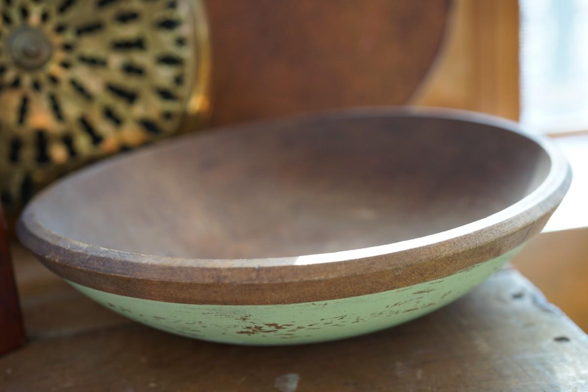 Last is a wooden bowl of 10 1/2" by 10" with a painted medium green. The bowl is a shallow bowl with a height of around 2 1/2" . It is all natural and has not been " restored" so it has a nice look to it.
