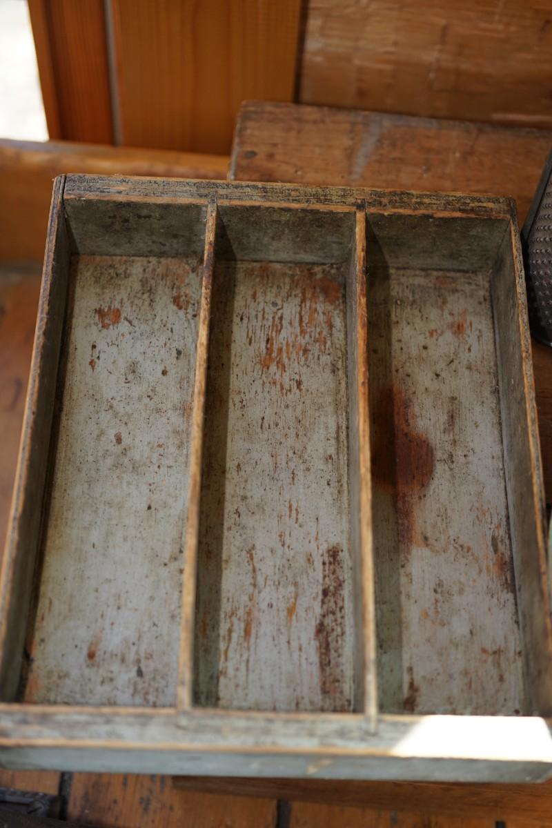 The silverware tray has the original grey paint. three compartments. It has wear. sturdy . it is hand made. Slightly rough but has a nice look for the country style kitchen