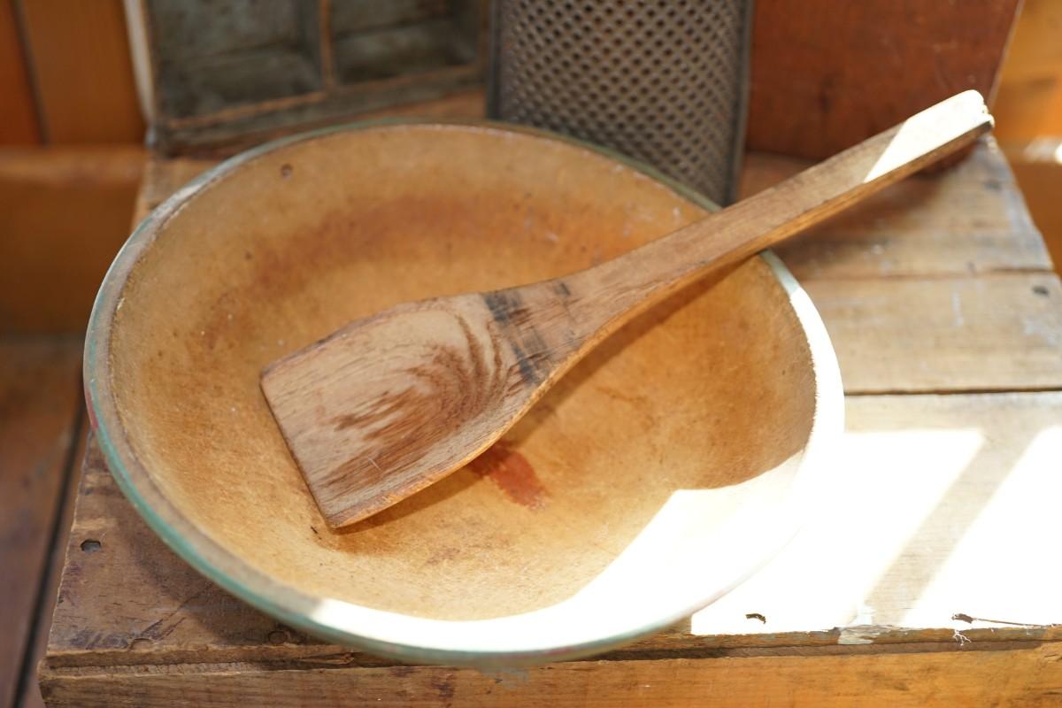 The wooden spoon has a scoop style bowl. 12" length. good condition. Natural wood and not restored . It may need some oil to bring out the patina
