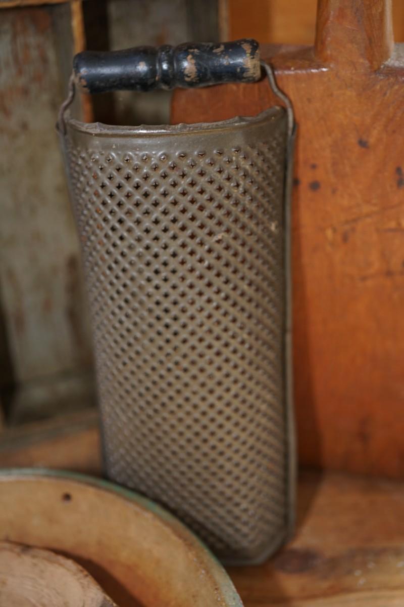 antique tin grater with wooden handle with curved front. good condition. original. measures 11" with handle and approximate 4 1/2" wear noted but sturdy.