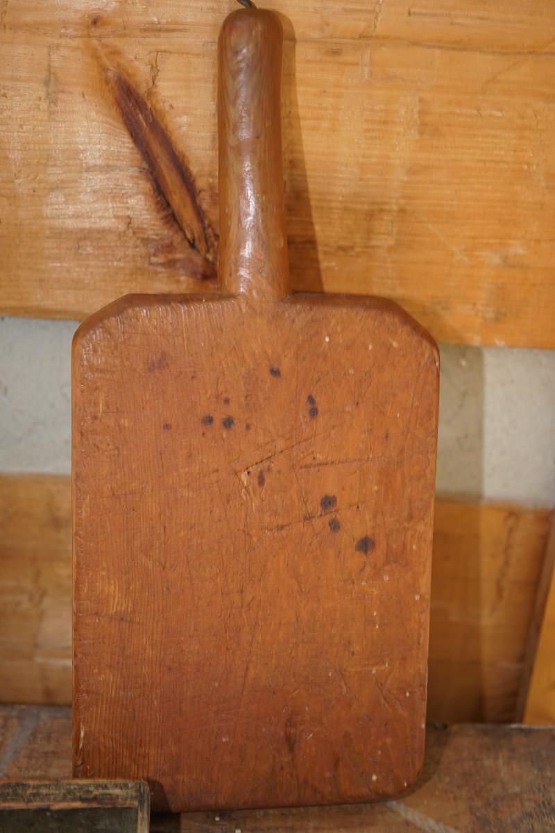 bread board height with handle 16" there is a hook at the end to hang. The width is 2" across length is 7 1/2" good patina and condition. there are dark stains and cutting marks.