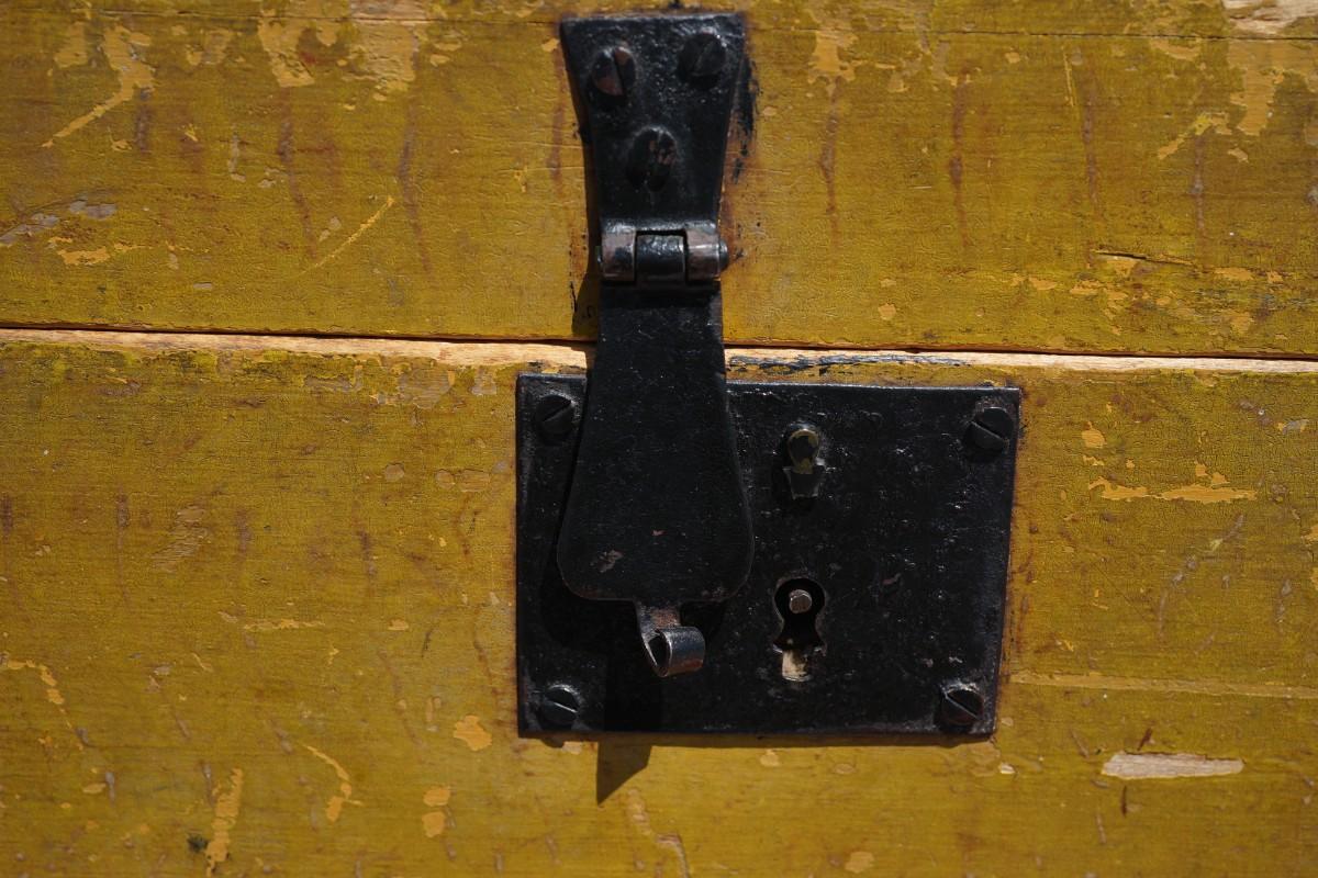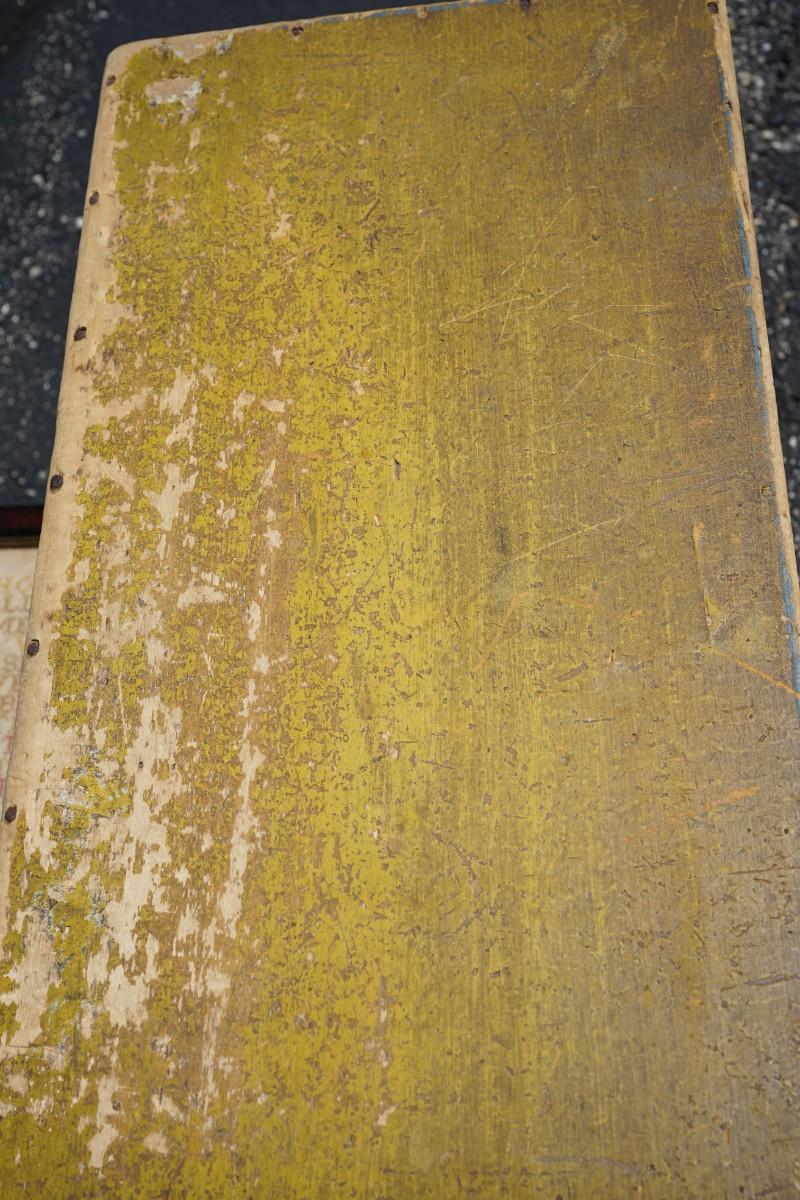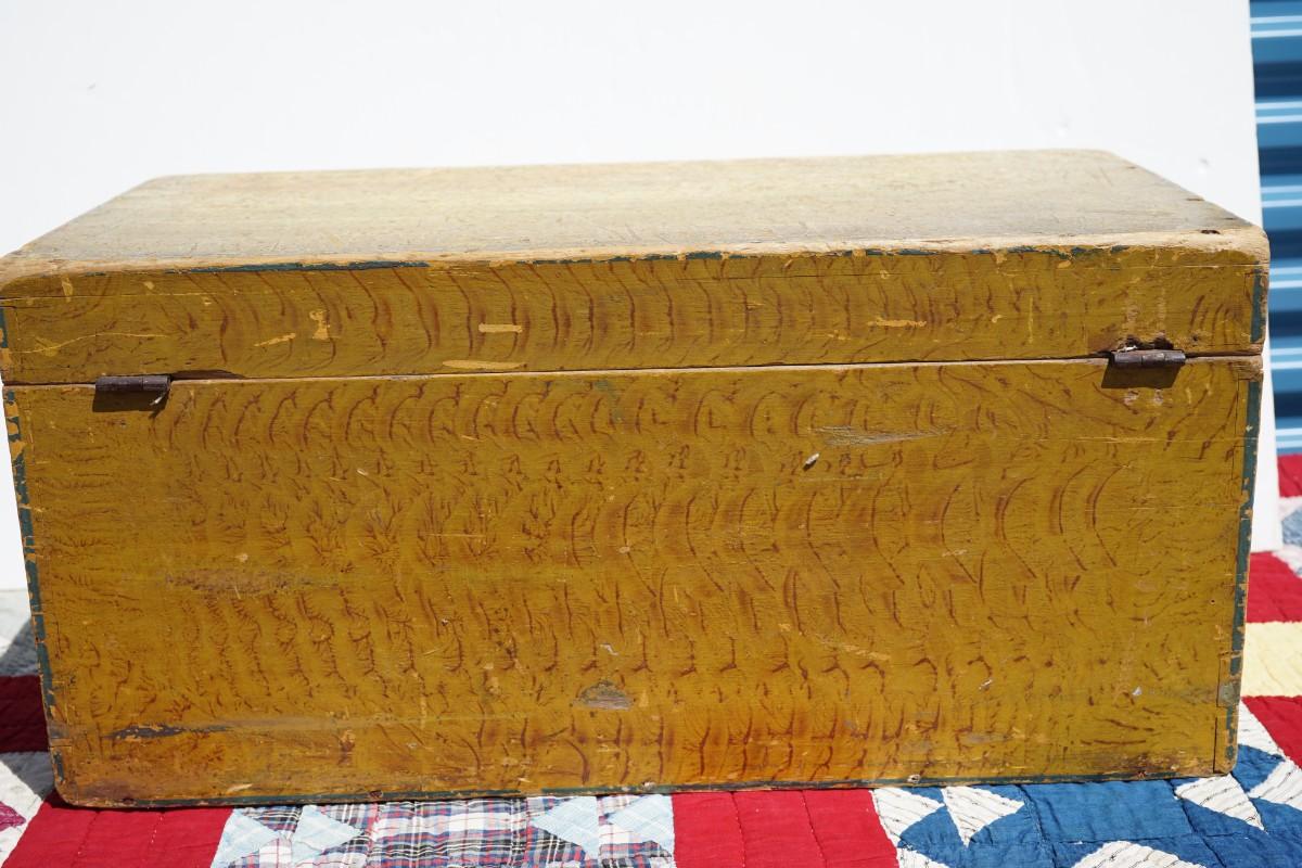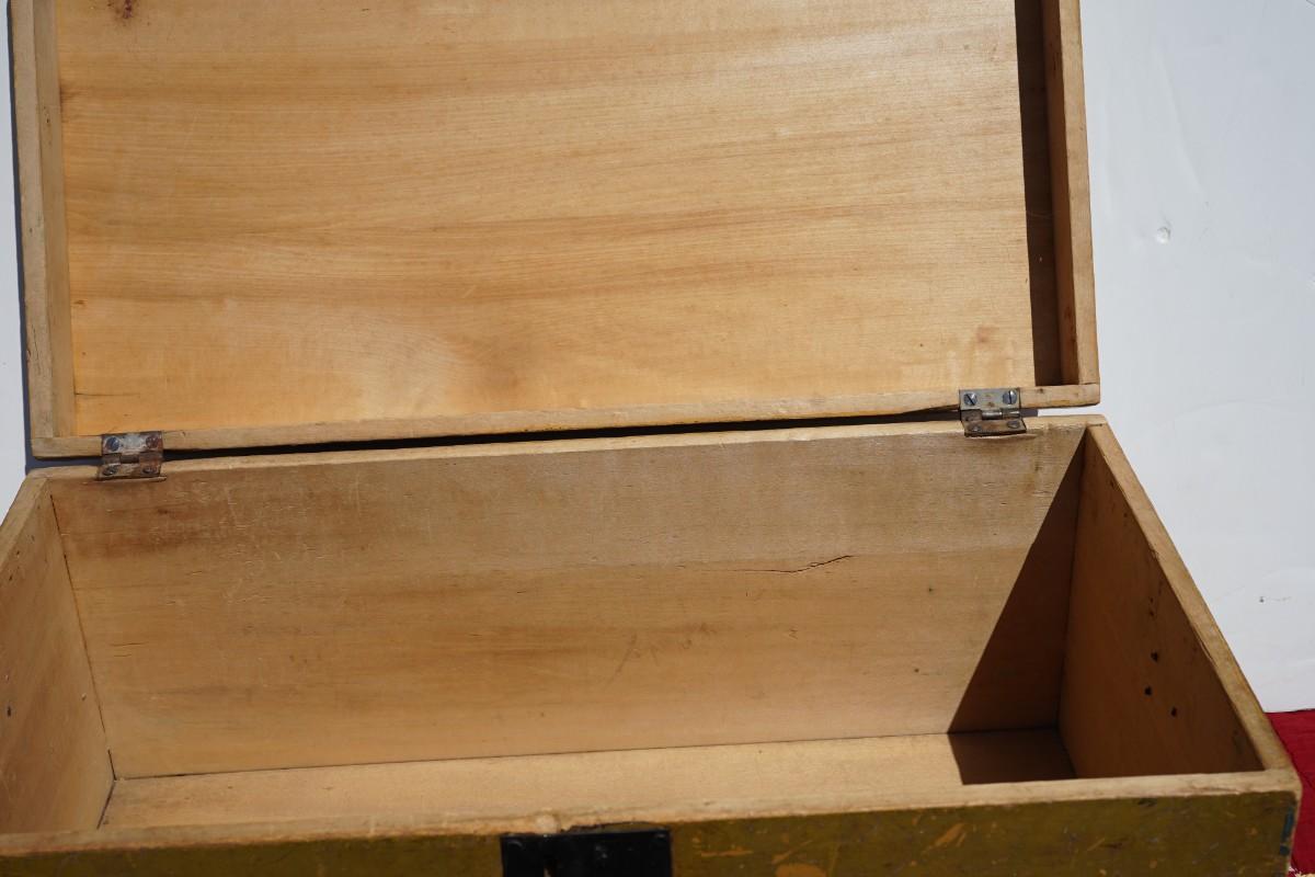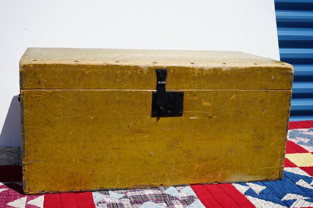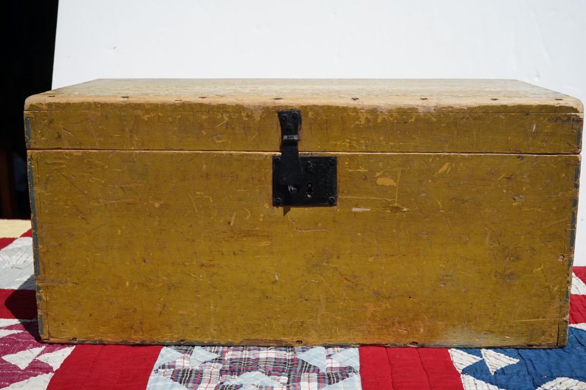 your classic mustard painted lidded box. used for storage or travel in the 19th century.