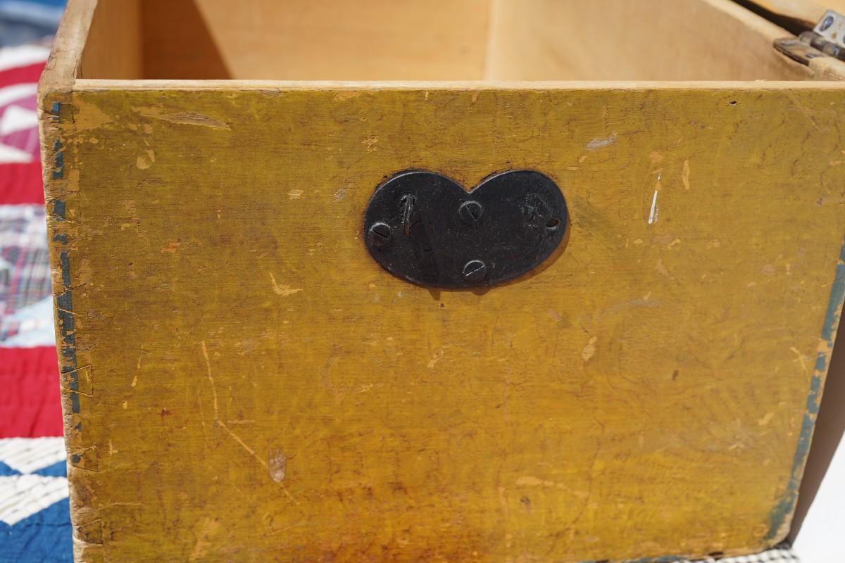 PRIMITIVE MUSTARD PAINTED SMALL BOX /HAND FORGED HEART SHAPED HANDLES