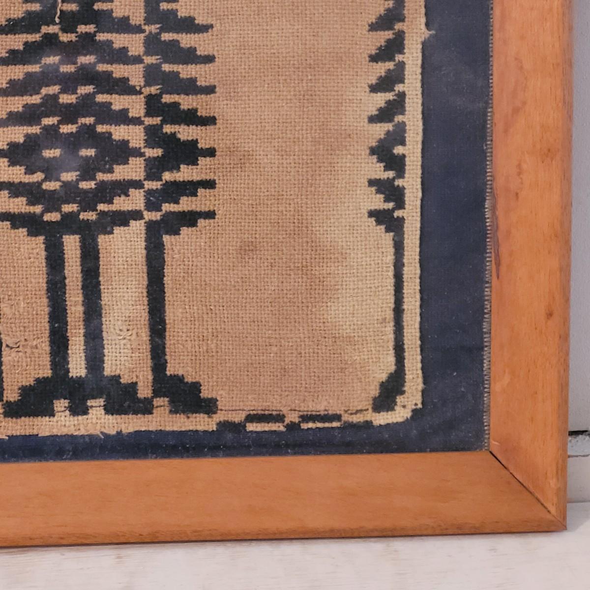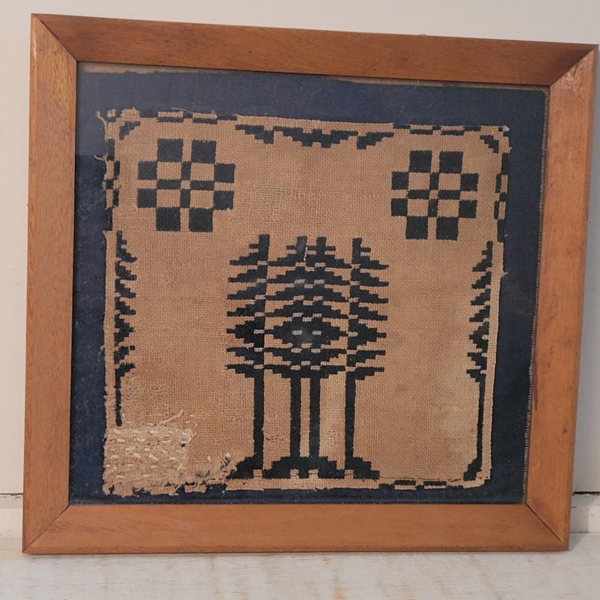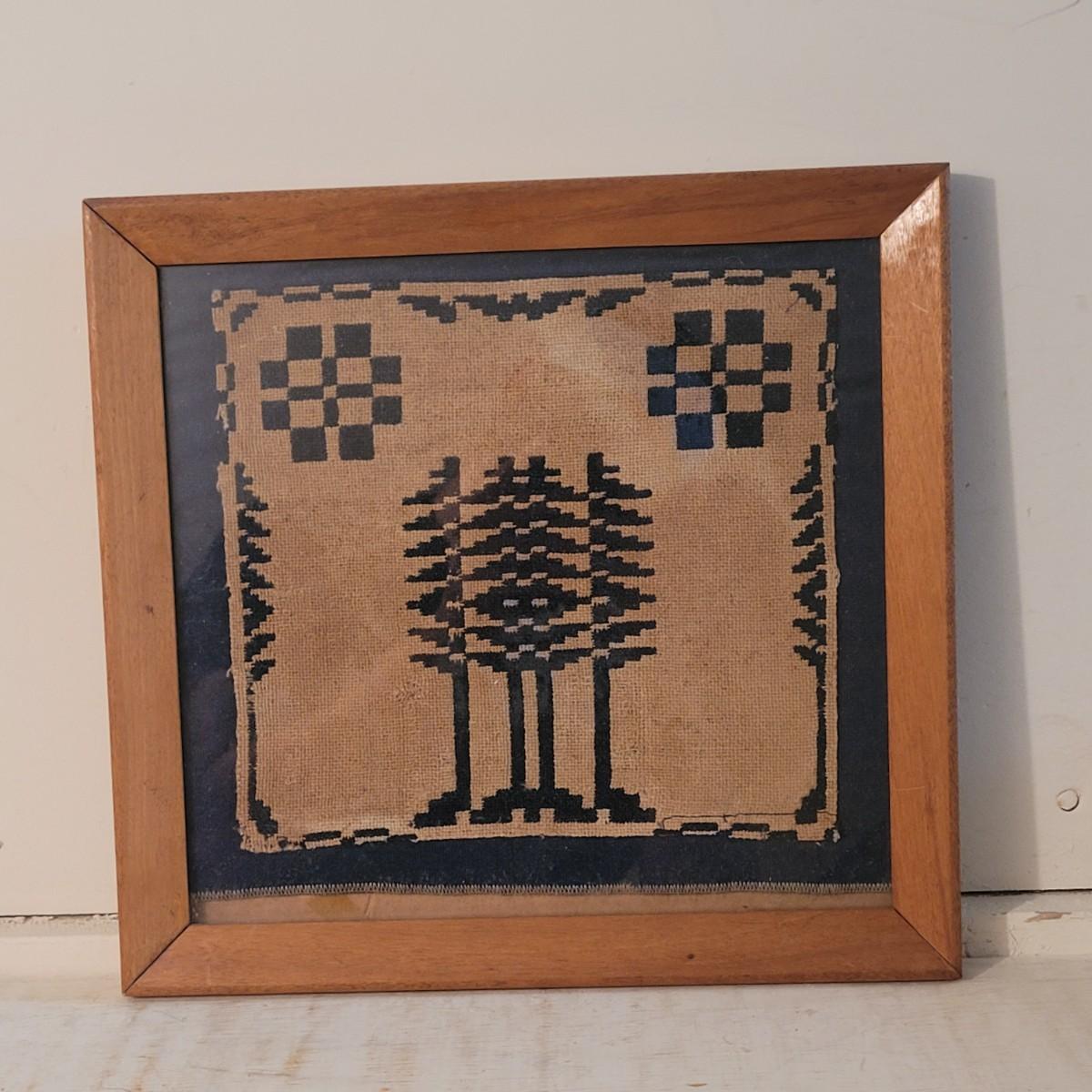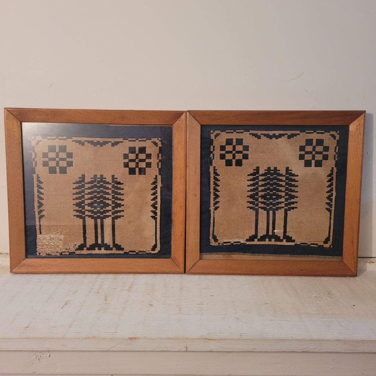 This lot includes a pair of primitive folk art pieces. These pieces are cross-stitched textiles placed in a frame. They appear to be very old and are likely antique. They depict symmetrical imagery of trees. One of the pieces has been patched in the bottom left corner. Individually the frames measure 12" x 12"H.