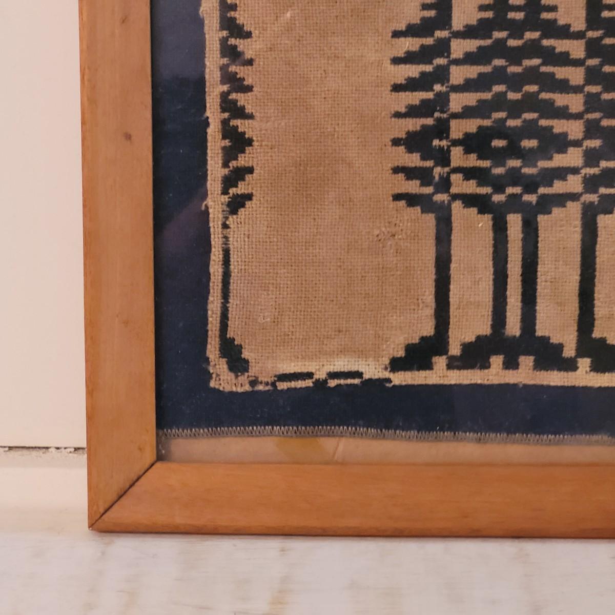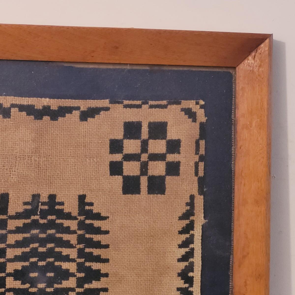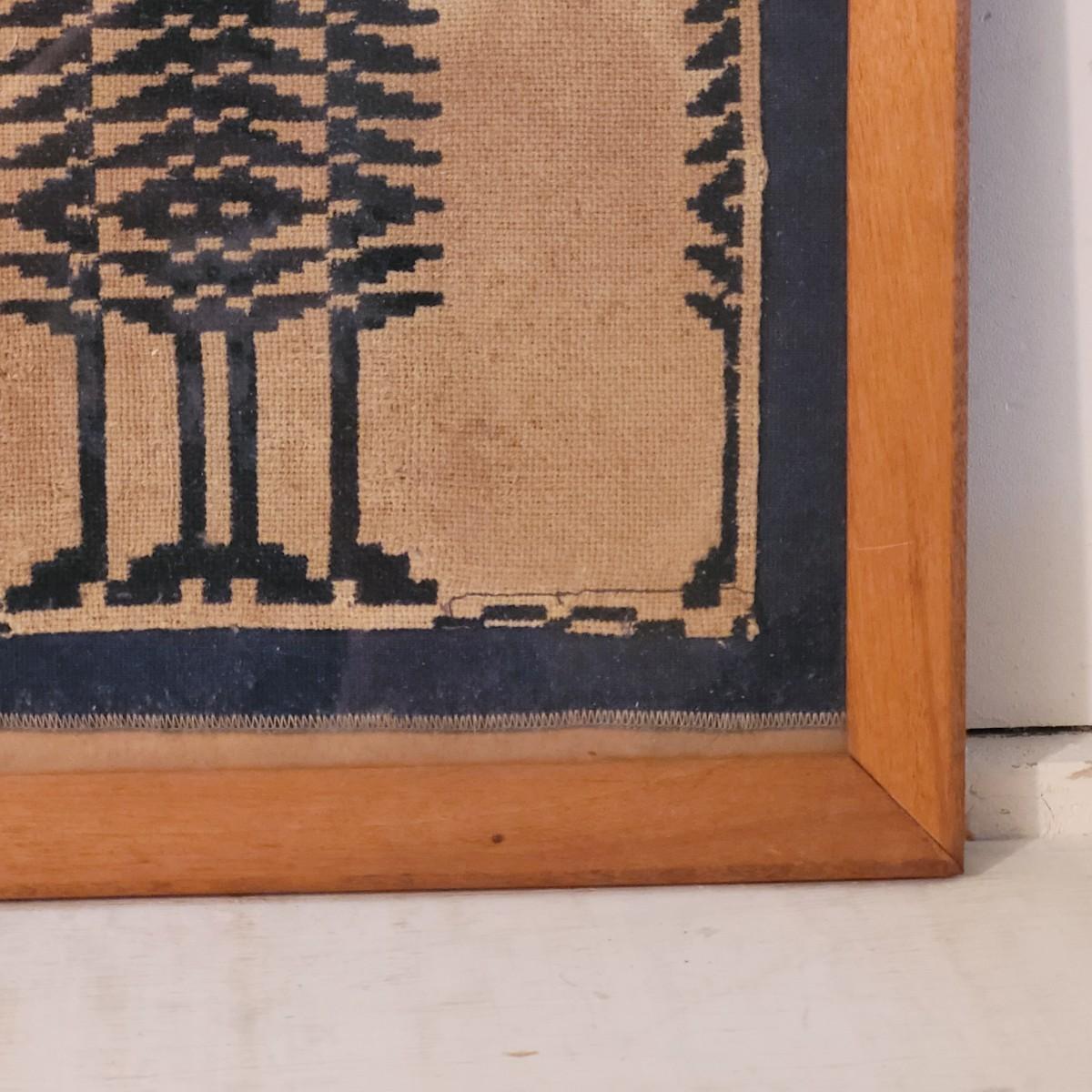 This lot includes a pair of primitive folk art pieces. These pieces are cross-stitched textiles placed in a frame. They appear to be very old and are likely antique. They depict symmetrical imagery of trees. One of the pieces has been patched in the bottom left corner. Individually the frames measure 12" x 12"H.