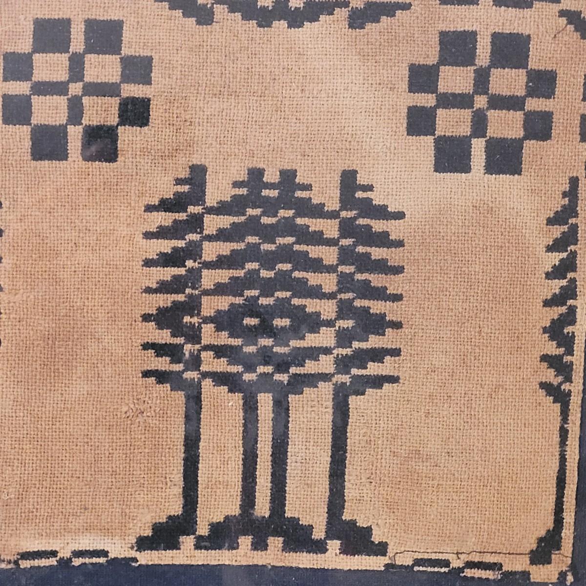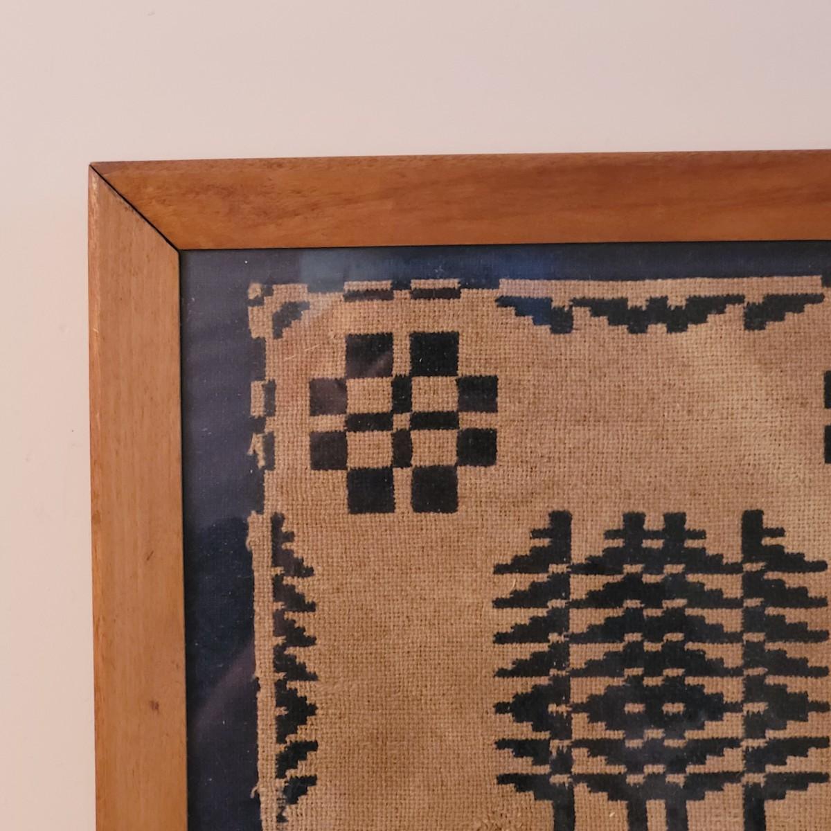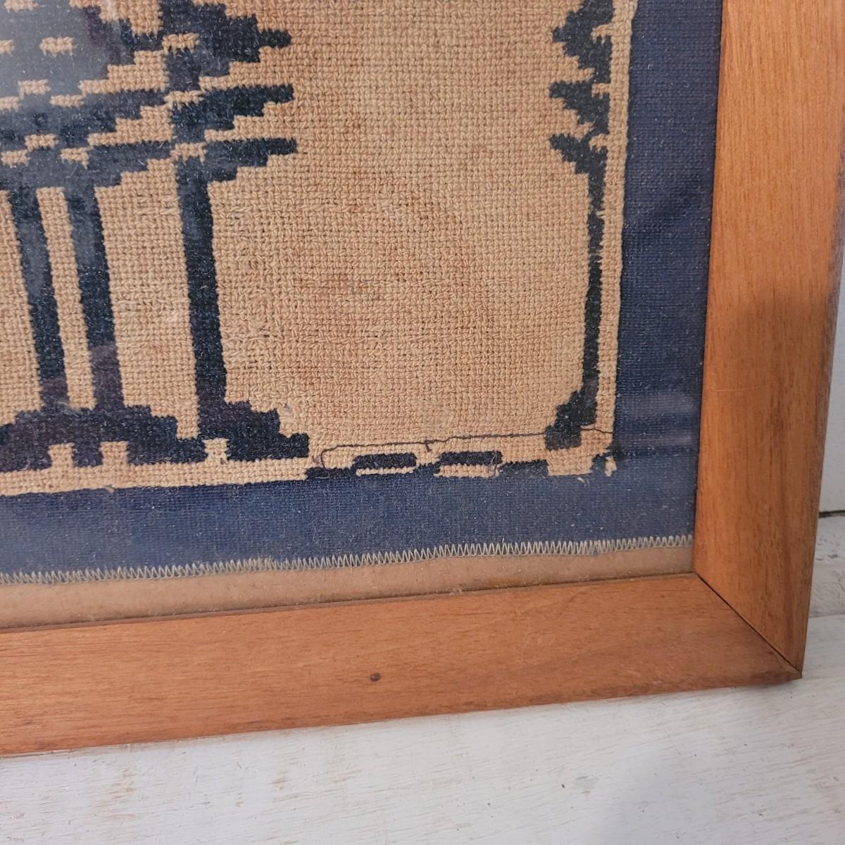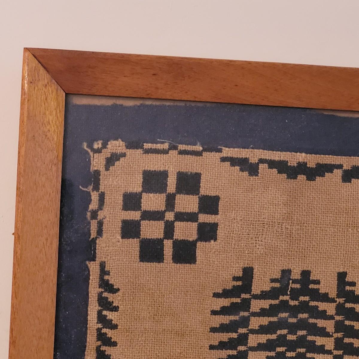 This lot includes a pair of primitive folk art pieces. These pieces are cross-stitched textiles placed in a frame. They appear to be very old and are likely antique. They depict symmetrical imagery of trees. One of the pieces has been patched in the bottom left corner. Individually the frames measure 12" x 12"H.