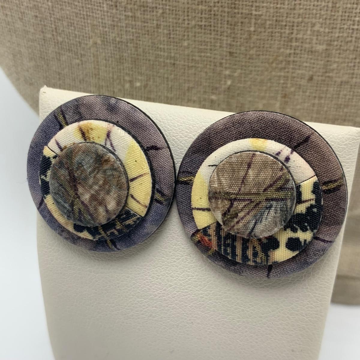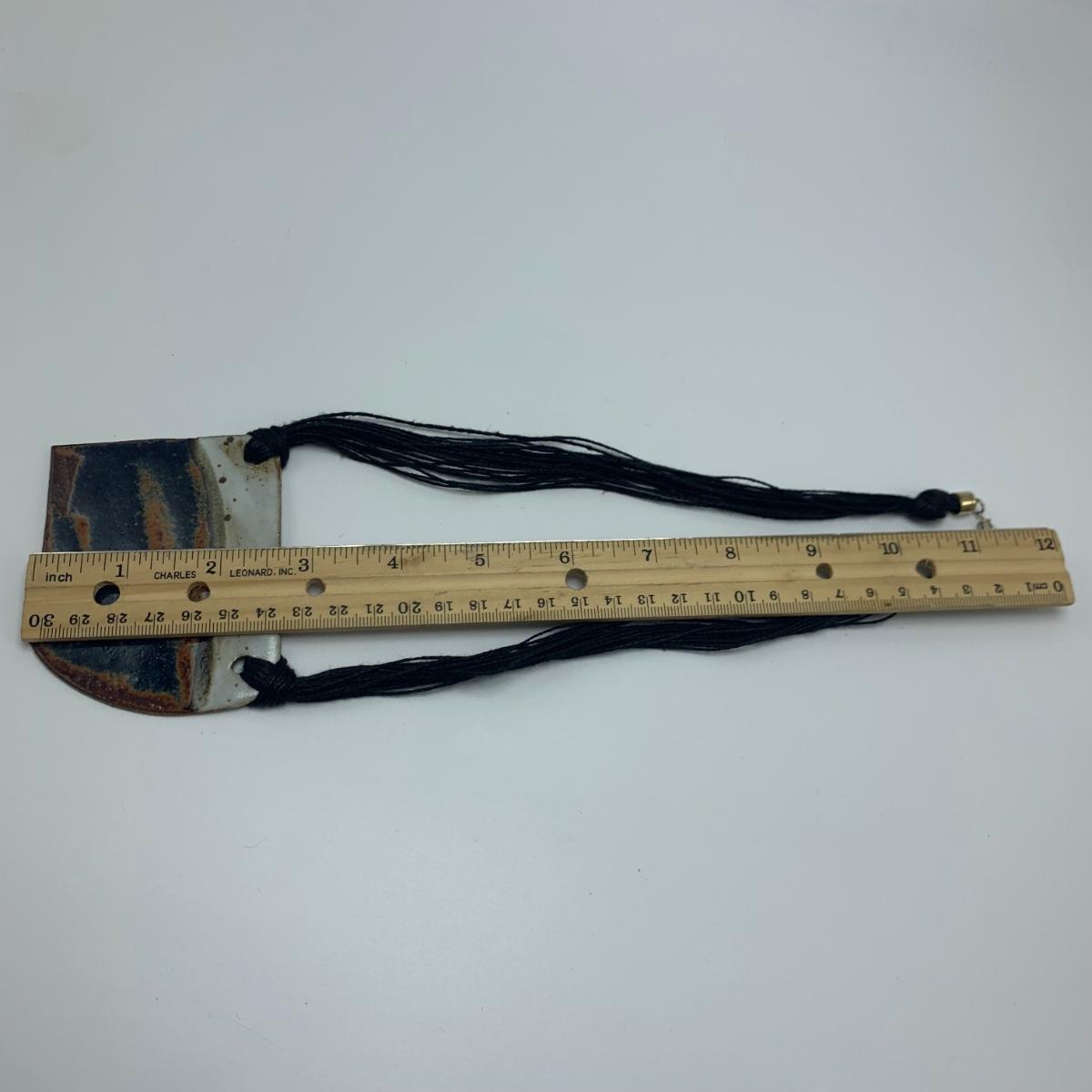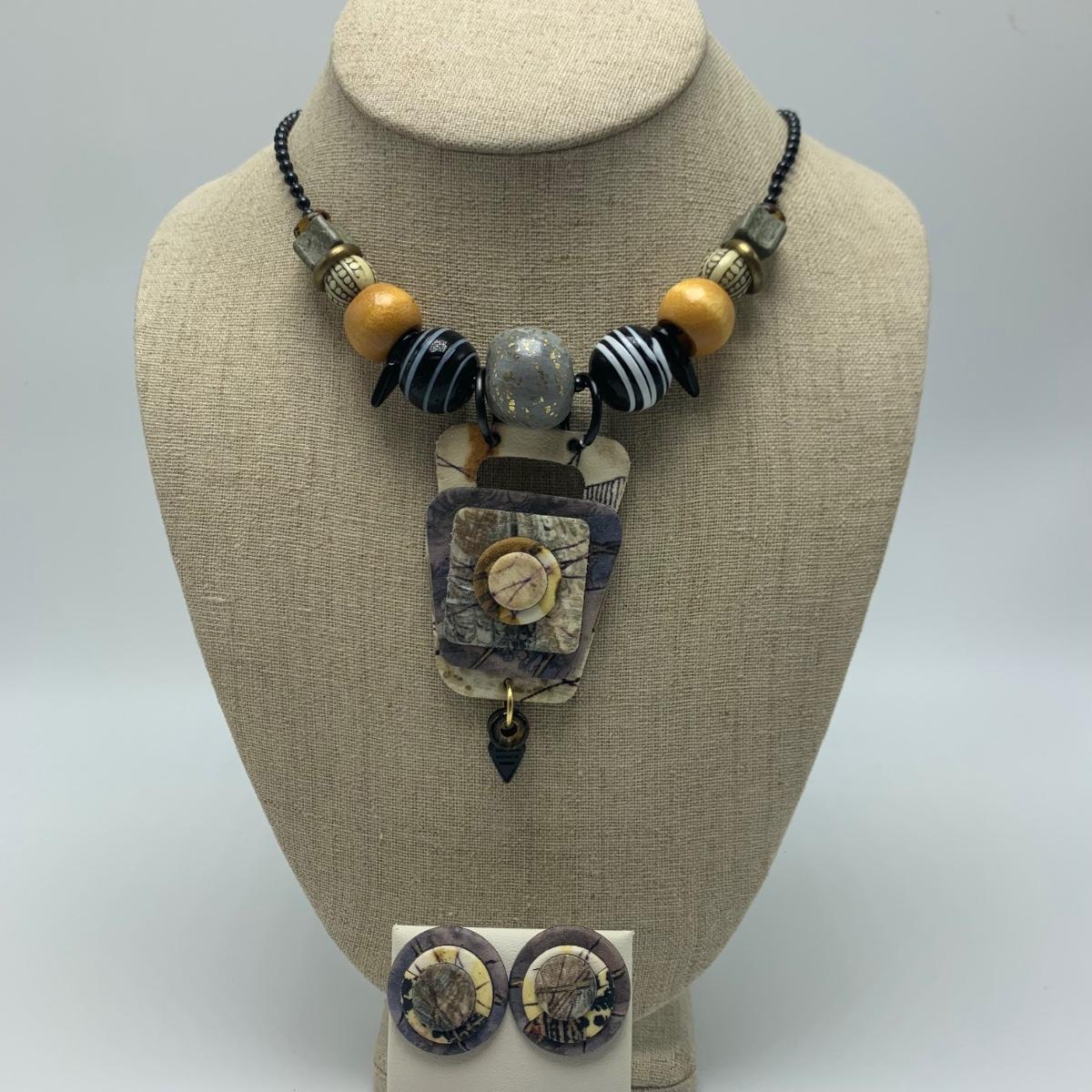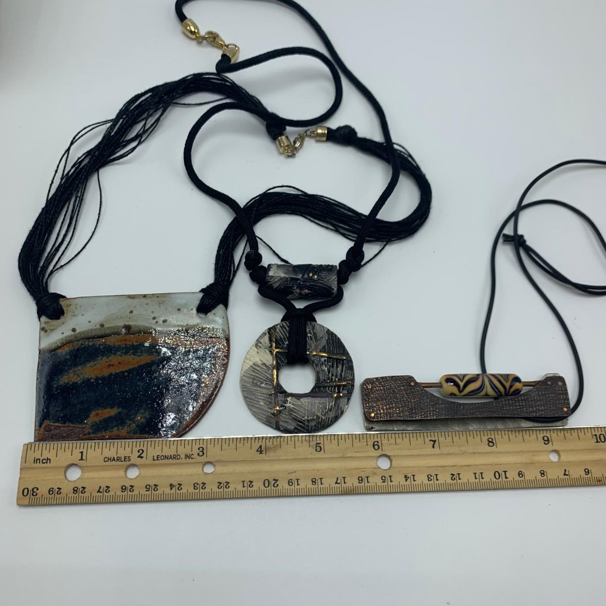 The style of art seen in this jewelry is reminiscent of earth’s elements. There are four necklaces, two of which have matching earrings, as well as a bracelet and earrings set, two pins, and one earring that is missing its mate, but could be transformed into a pin or used otherwise. The earrings with the gold accents are clip-on, and the other two pairs are for pierced ears. The set with gold accents is ceramic and the pendant is on a fabric cord, as is the large navy, rust, & ivory colored pendant. The two longest necklaces (with fabric pendant and metal pendant) are about 31”. The metal pendant with a bead is on a rubbery cord. The bracelet and earrings set have gray stones. All sales are final. No returns or refunds. Please bid accordingly.