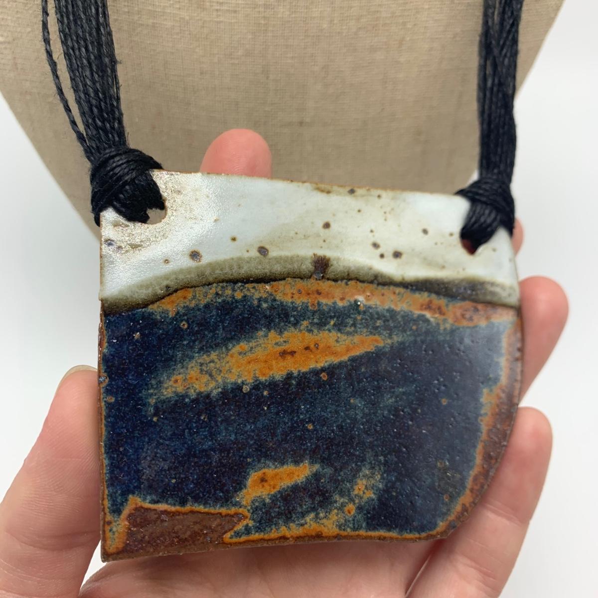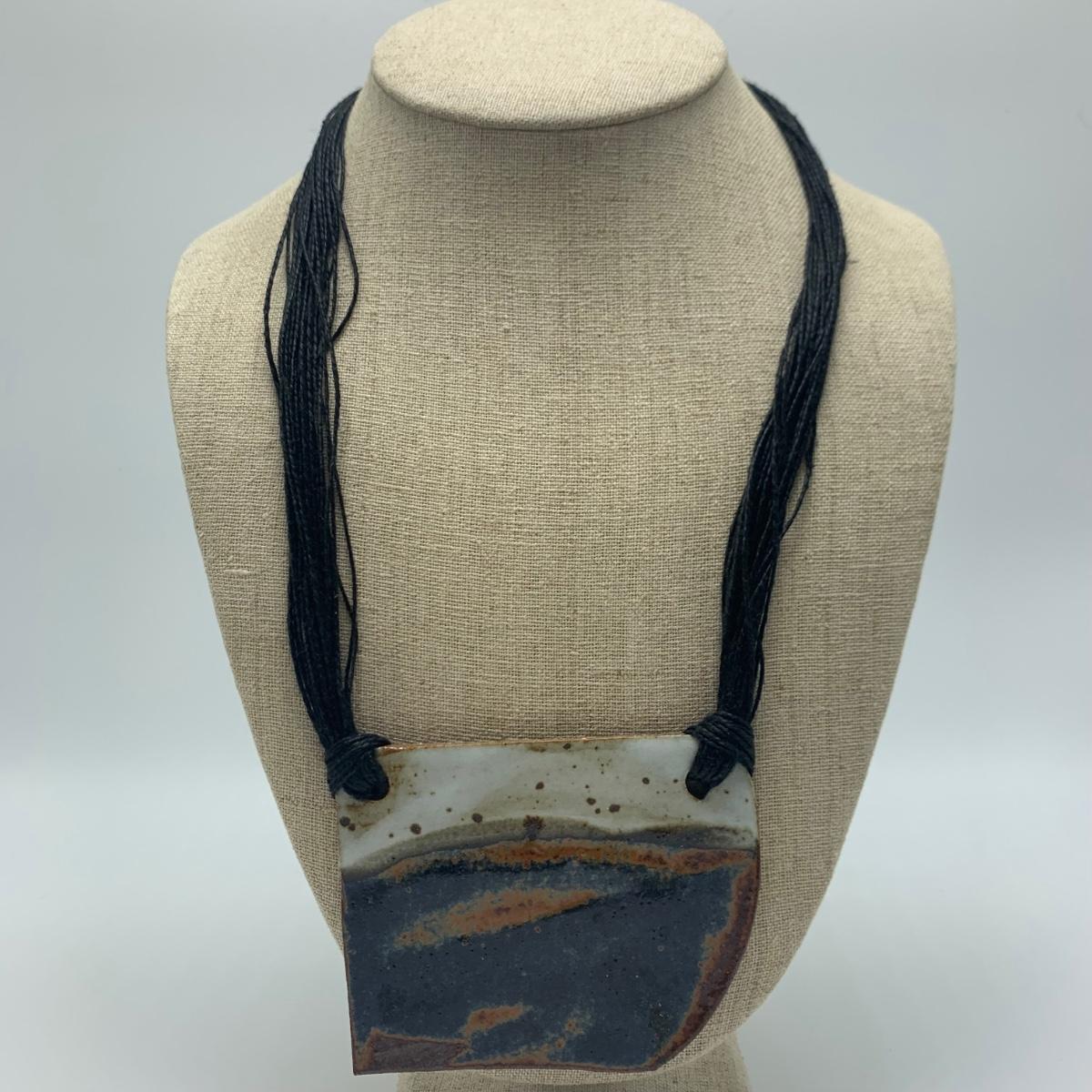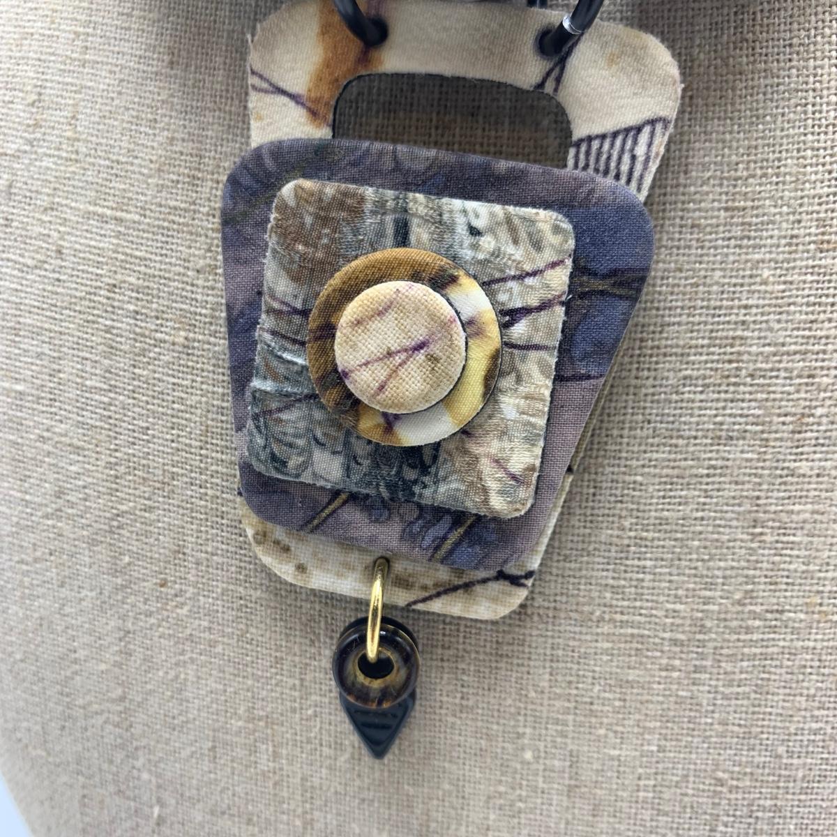 The style of art seen in this jewelry is reminiscent of earth’s elements. There are four necklaces, two of which have matching earrings, as well as a bracelet and earrings set, two pins, and one earring that is missing its mate, but could be transformed into a pin or used otherwise. The earrings with the gold accents are clip-on, and the other two pairs are for pierced ears. The set with gold accents is ceramic and the pendant is on a fabric cord, as is the large navy, rust, & ivory colored pendant. The two longest necklaces (with fabric pendant and metal pendant) are about 31”. The metal pendant with a bead is on a rubbery cord. The bracelet and earrings set have gray stones. All sales are final. No returns or refunds. Please bid accordingly.