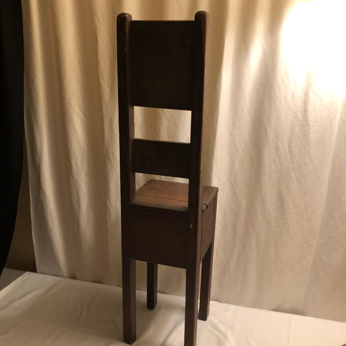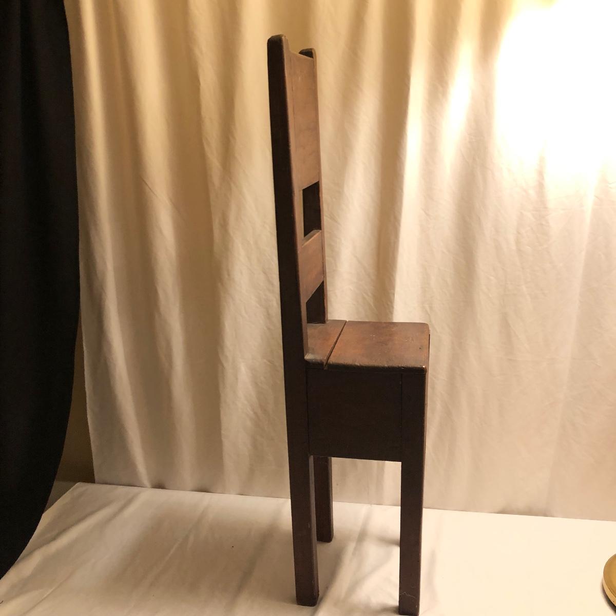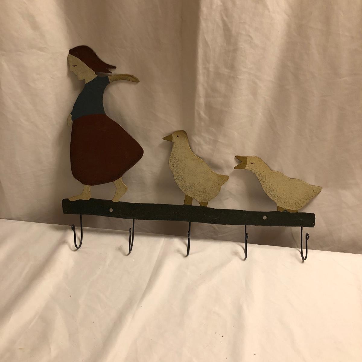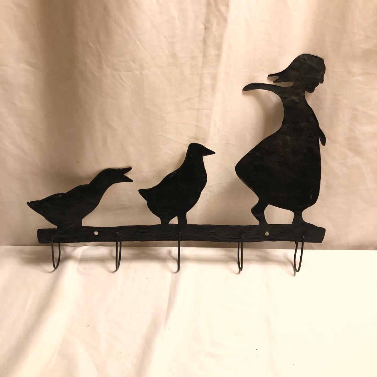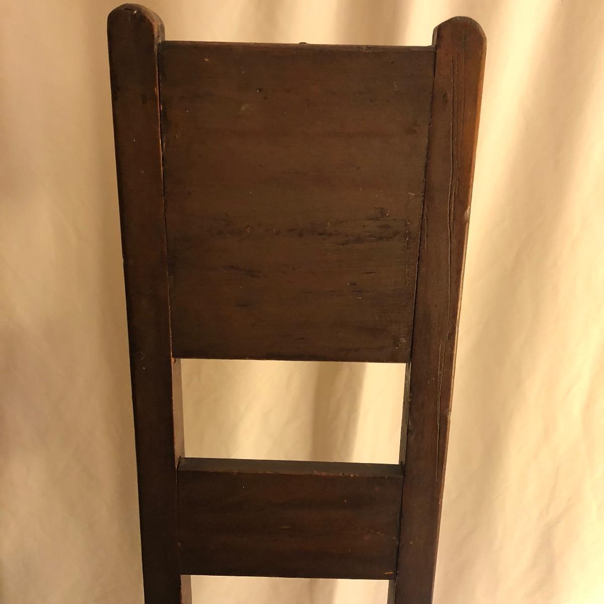 Lot includes a primitive style wooden chair and a metal folk art hat rack that measures 20” x 15”. Chair measures 10” x 10” x 41” with a 20” seat height.