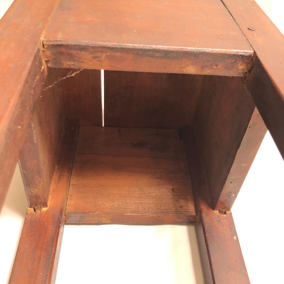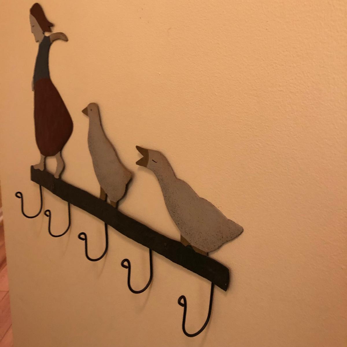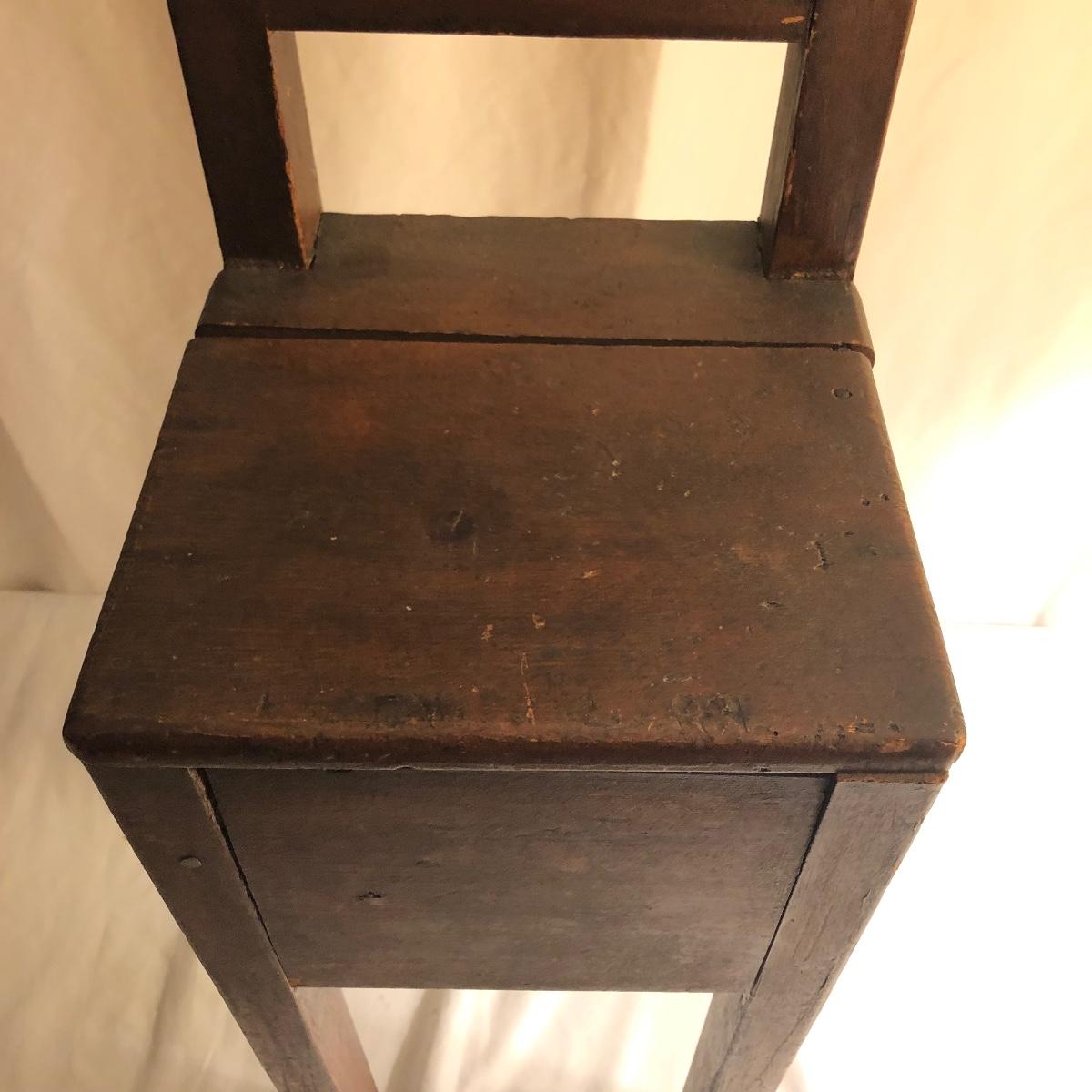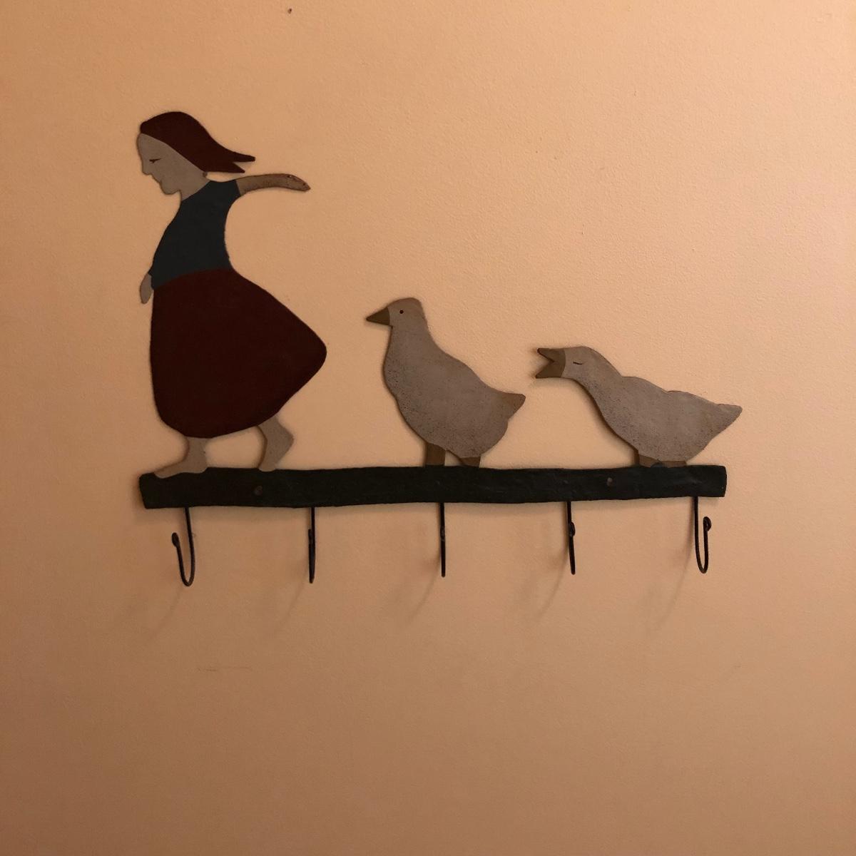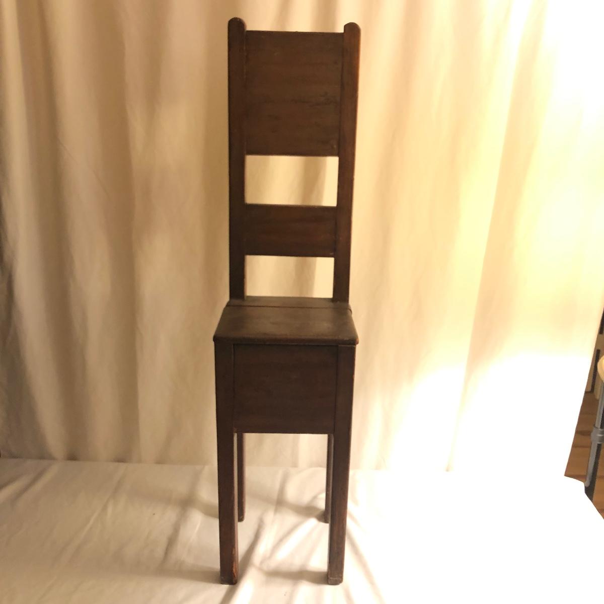 Lot includes a primitive style wooden chair and a metal folk art hat rack that measures 20” x 15”. Chair measures 10” x 10” x 41” with a 20” seat height.