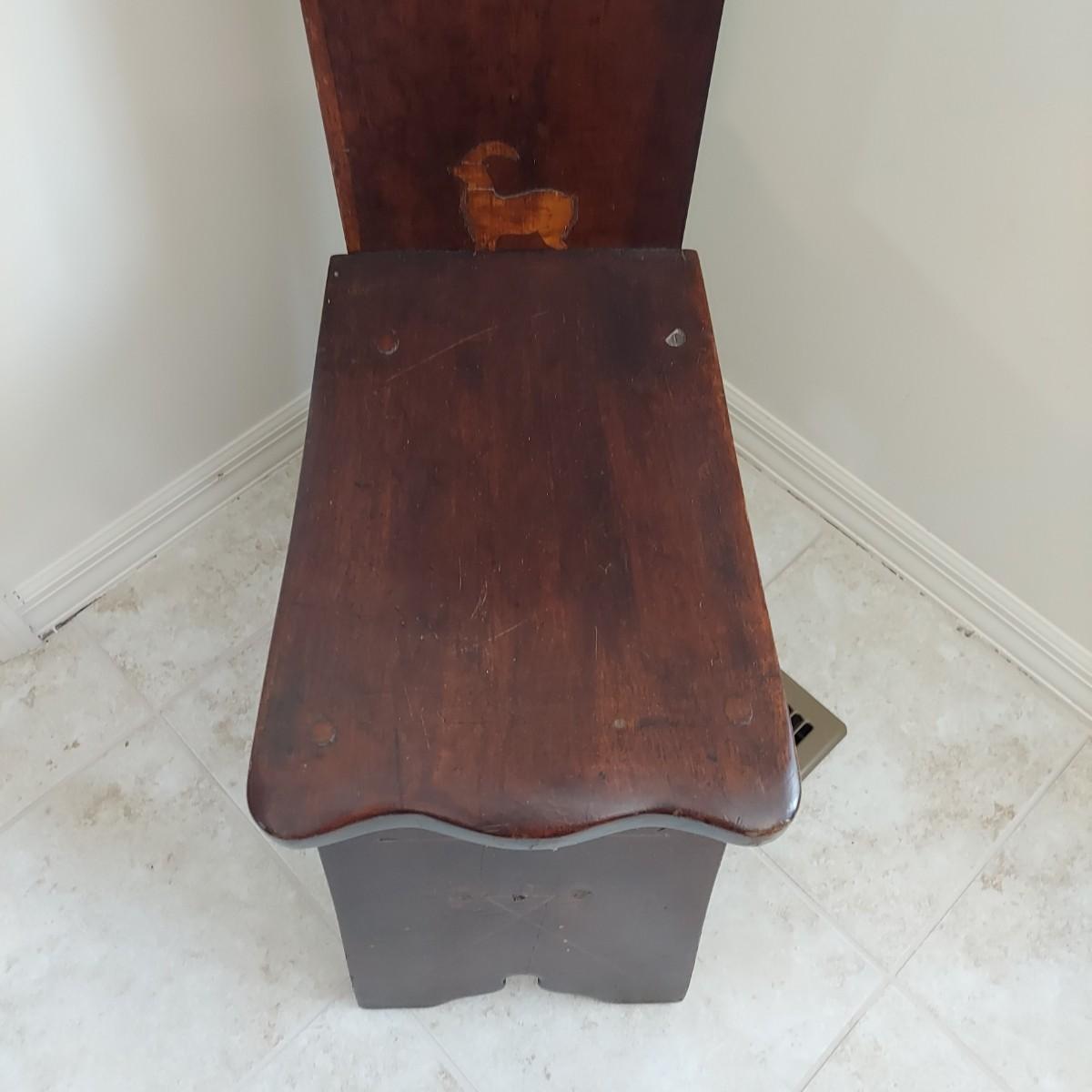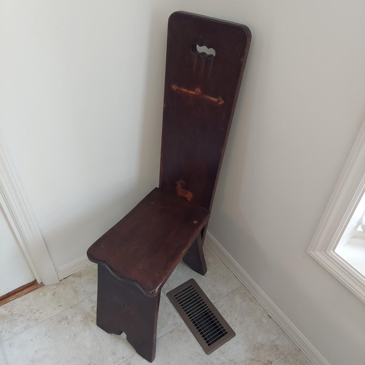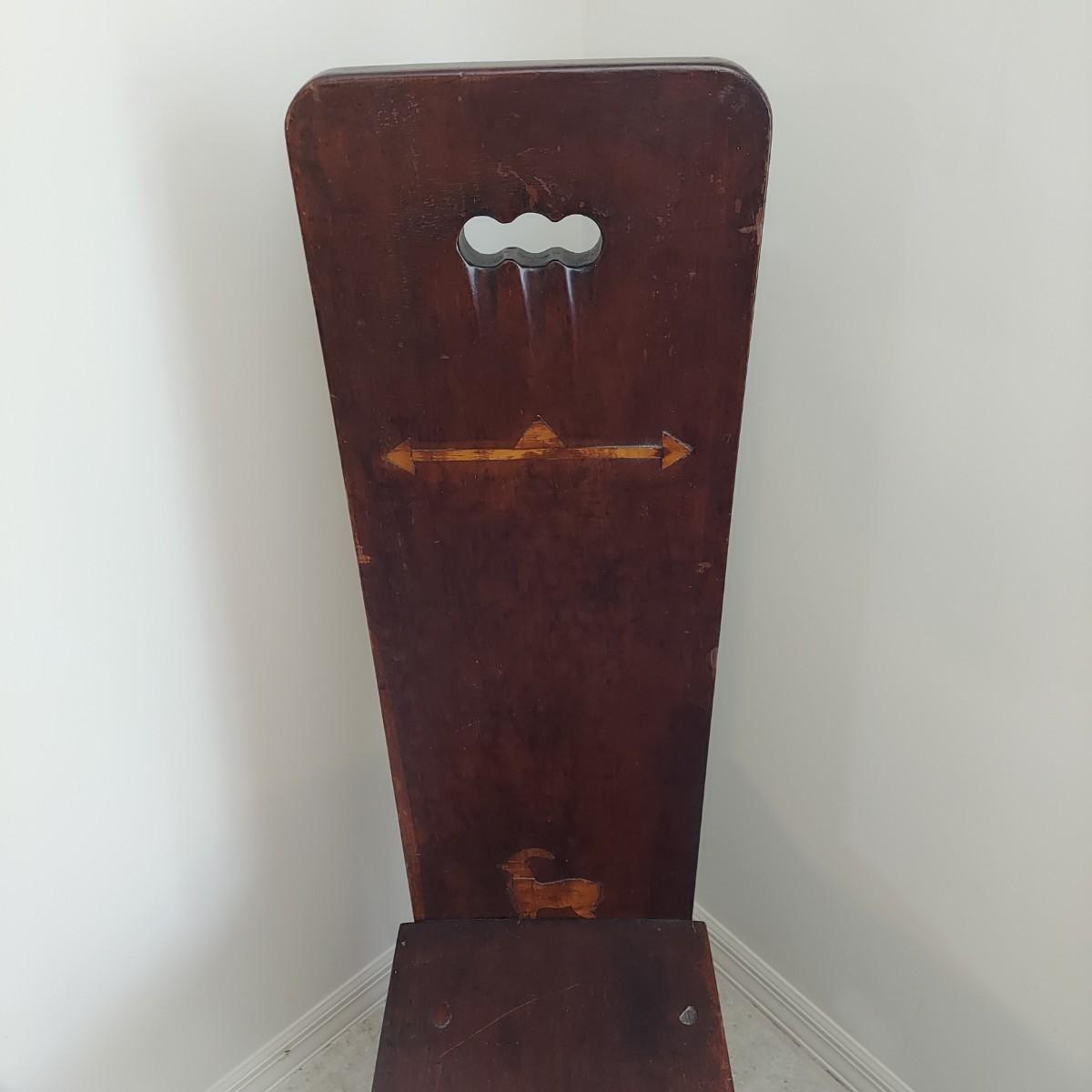 Solid wood Primitive style chair with decorative inlay details. Smaller, great for an entry way. Measures approximately 10.5" x 17.5" x 40.5"H. Seat height is 17". Local Pickup Only.