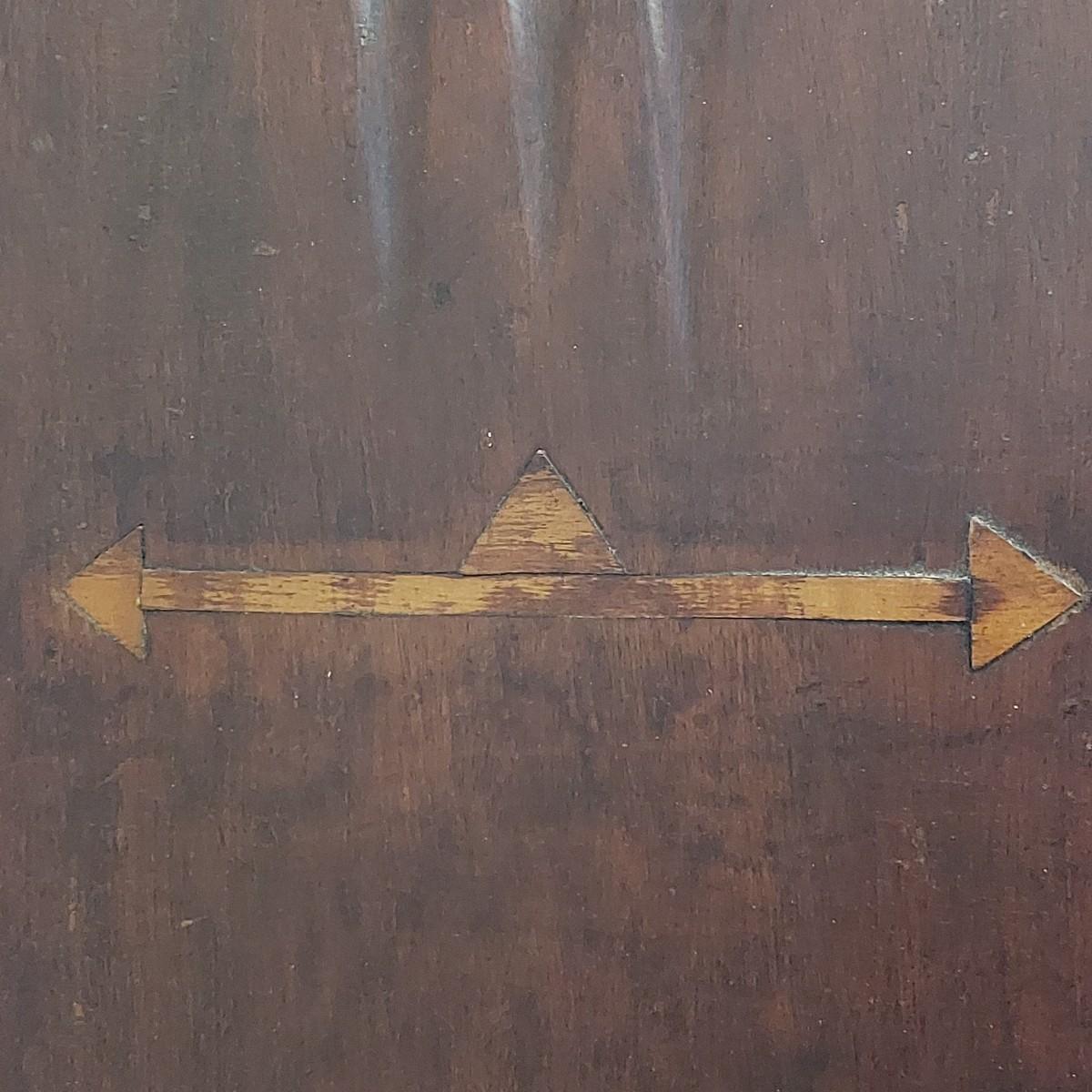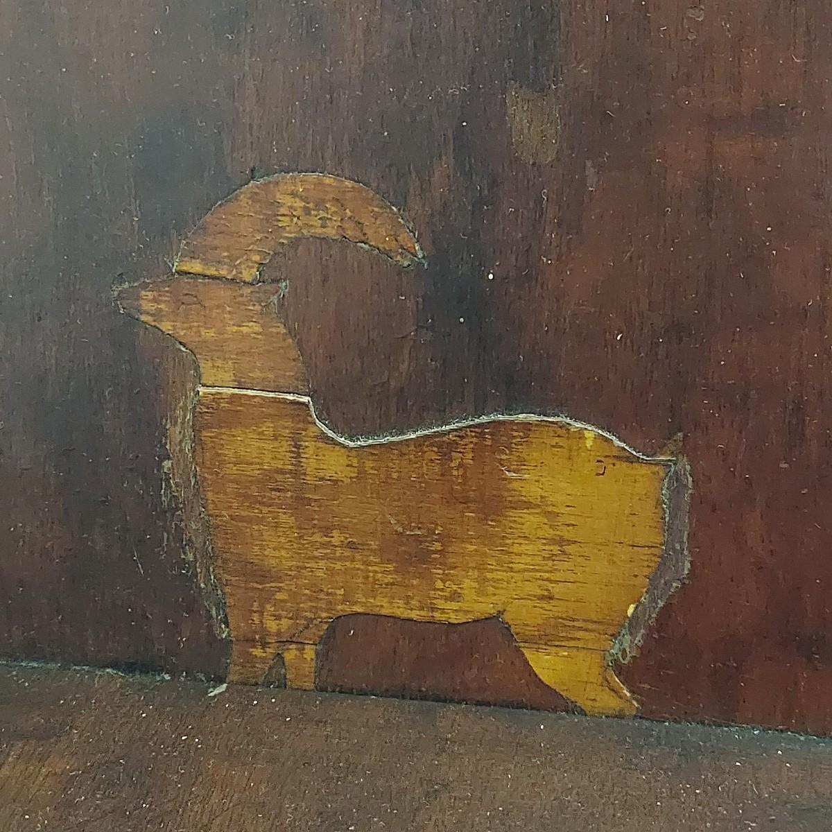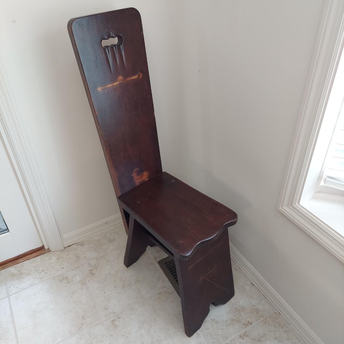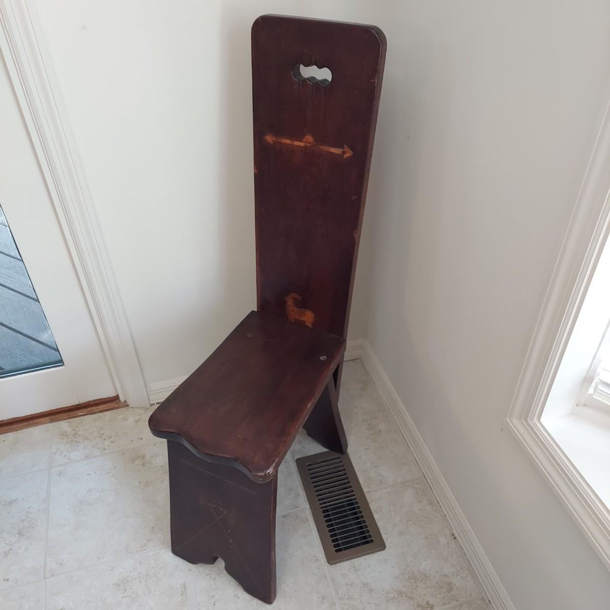 Solid wood Primitive style chair with decorative inlay details. Smaller, great for an entry way. Measures approximately 10.5" x 17.5" x 40.5"H. Seat height is 17". Local Pickup Only.