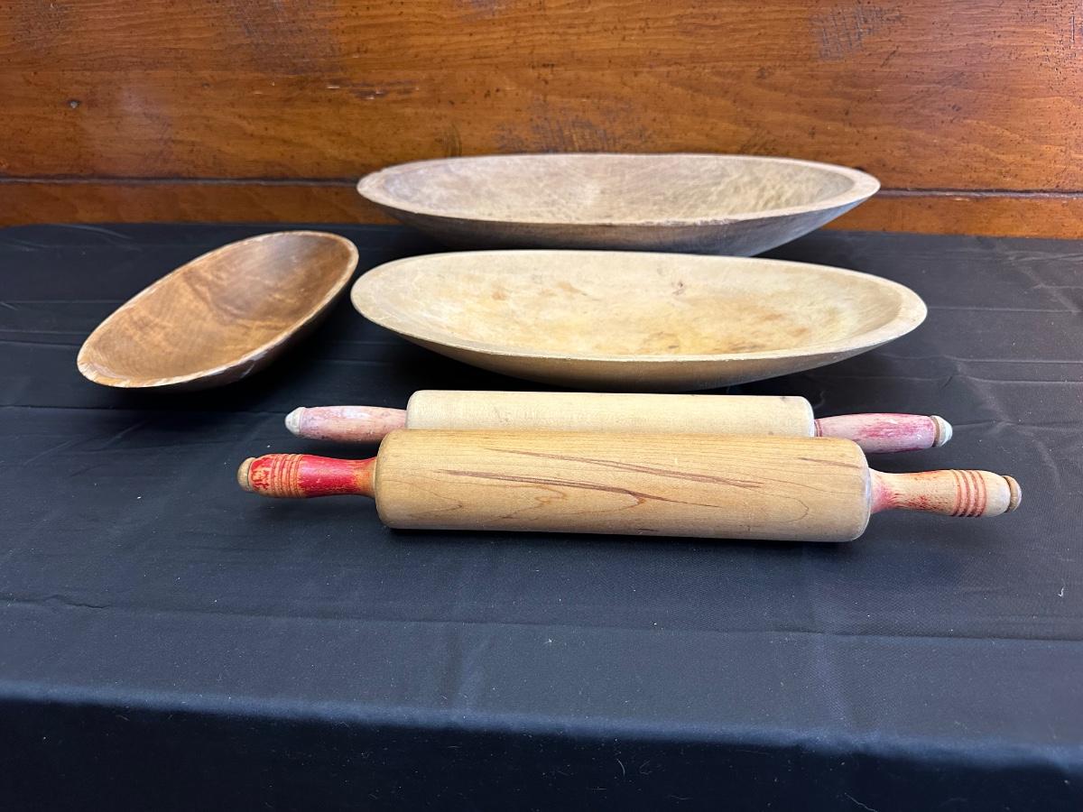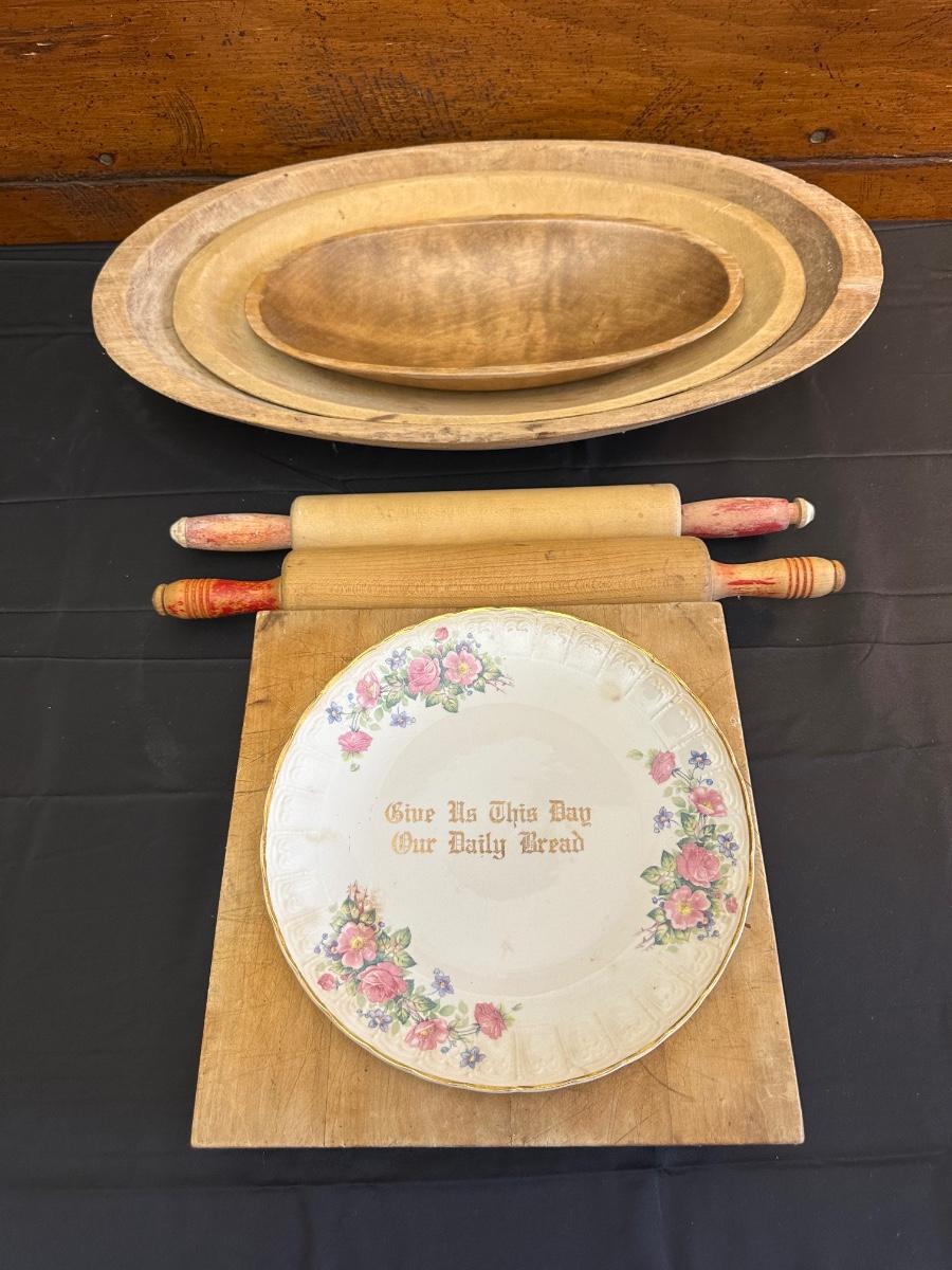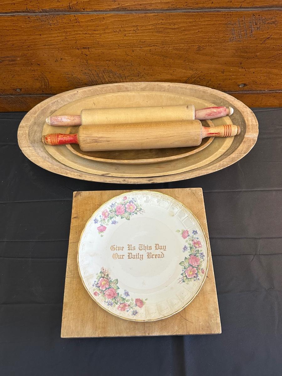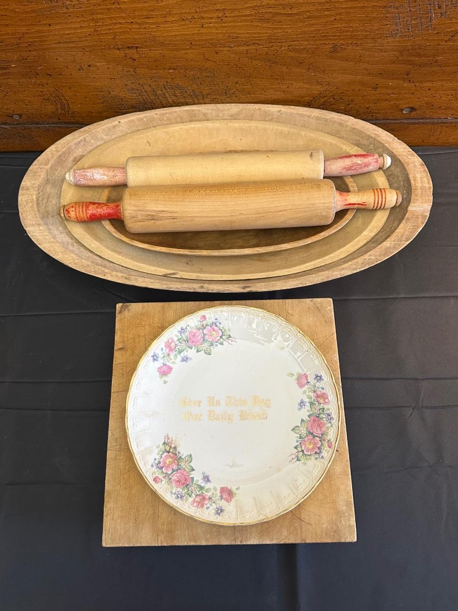 Primitive Wood Bowls, Rolling Pins, Cutting Board and China Plate