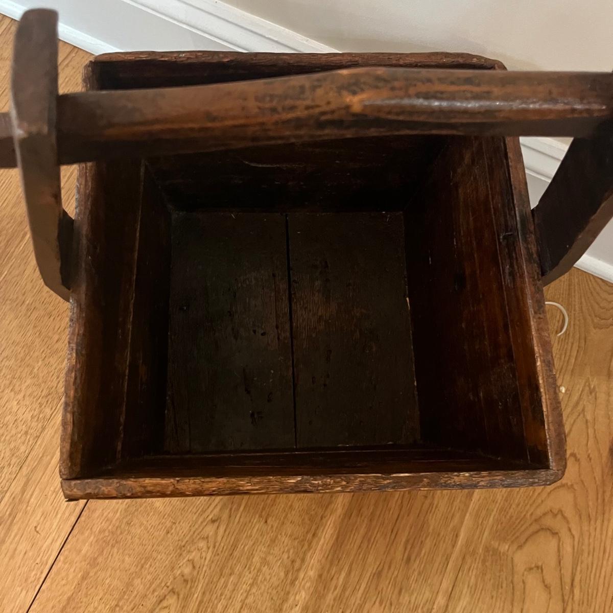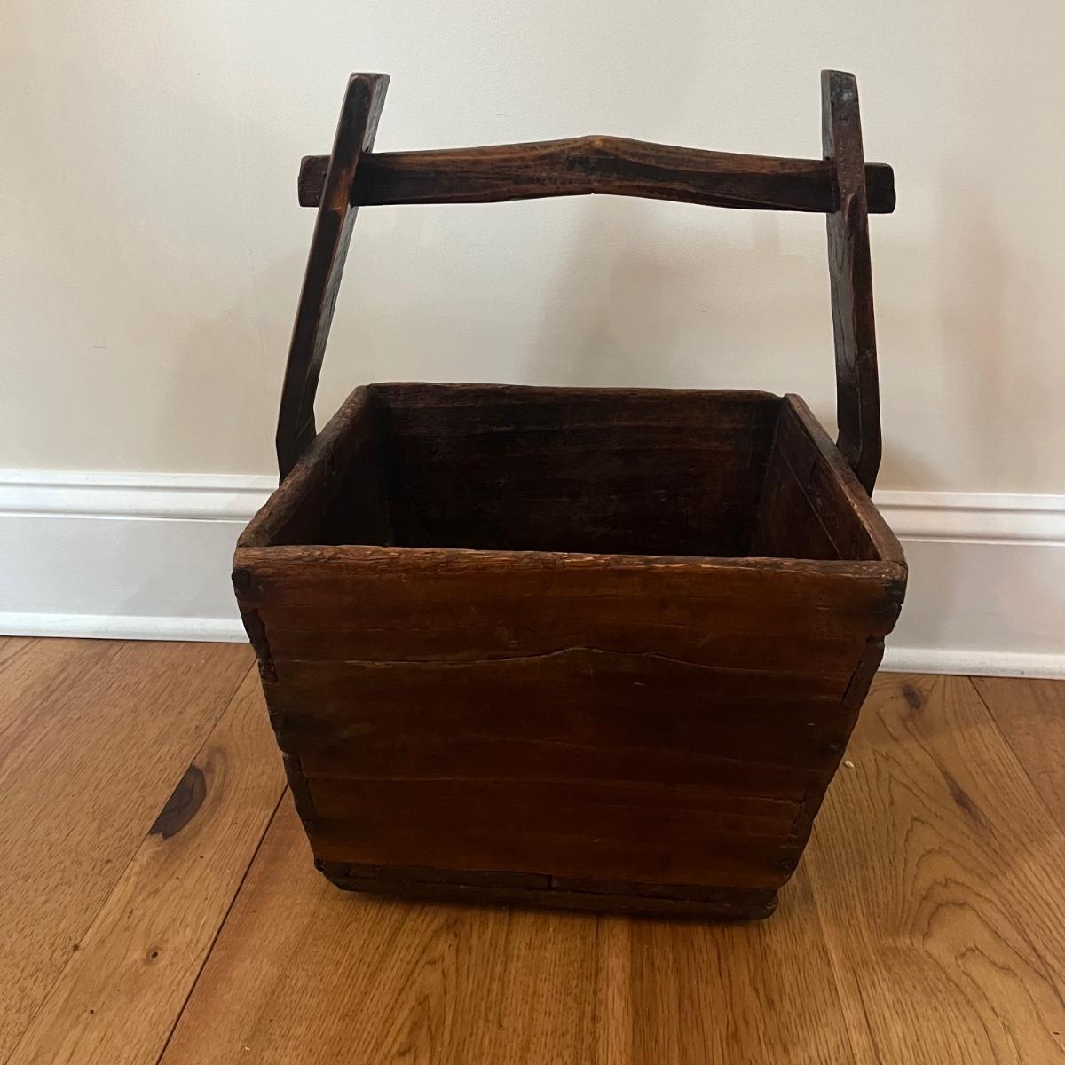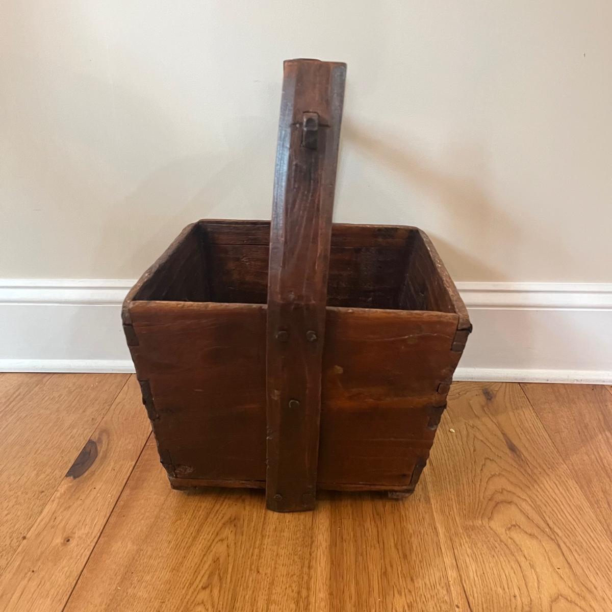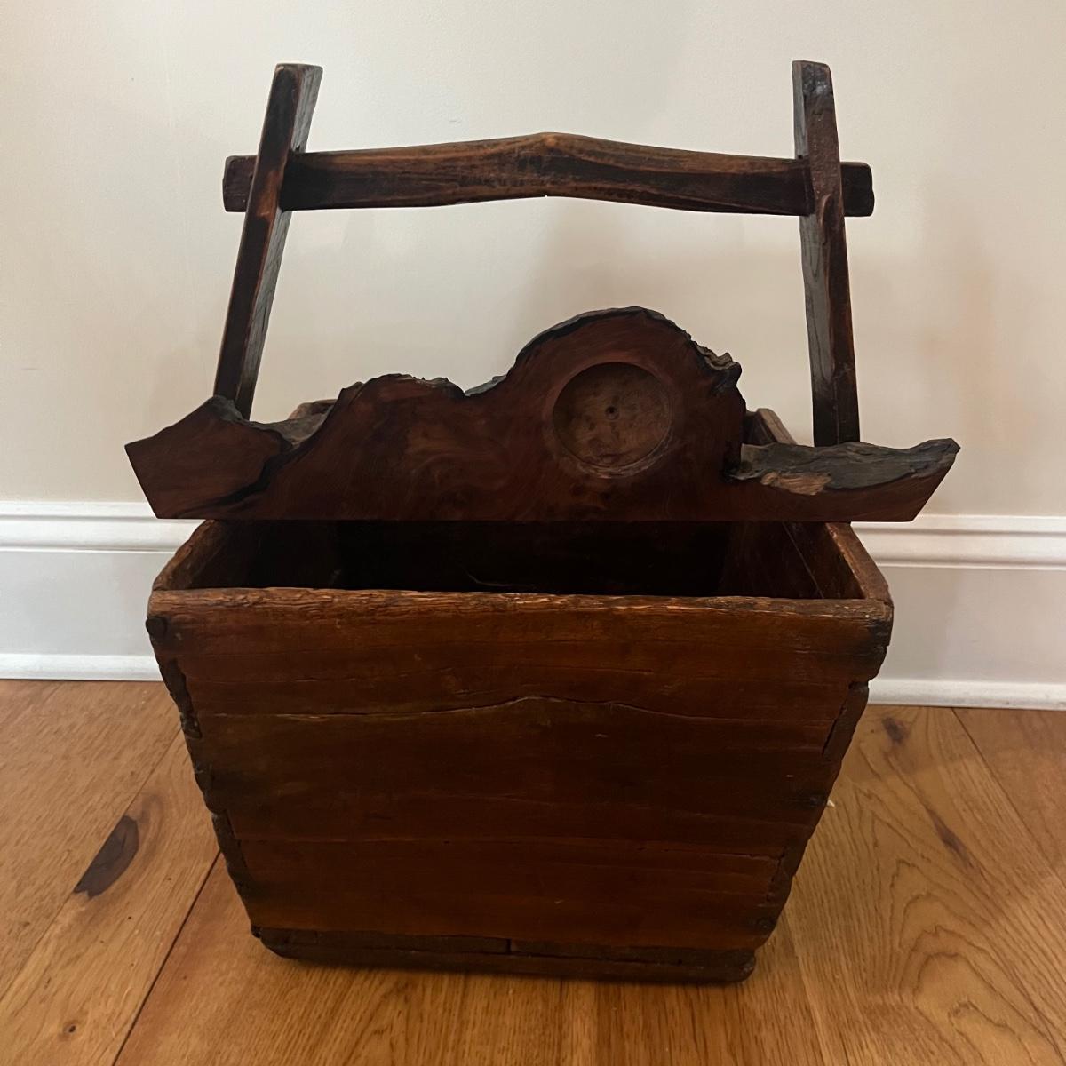 Lot includes a primitive wooden basket that appears to be made with Dowels not nails also includes a piece of wood that could hold a clock. Basket measures 13.5” x 14” x 19.5”H.