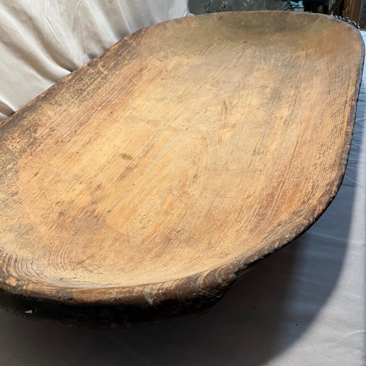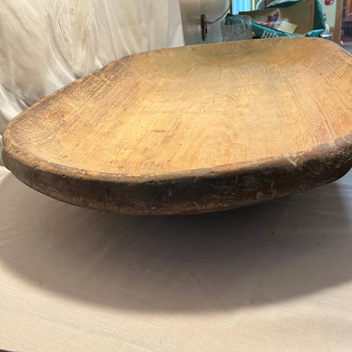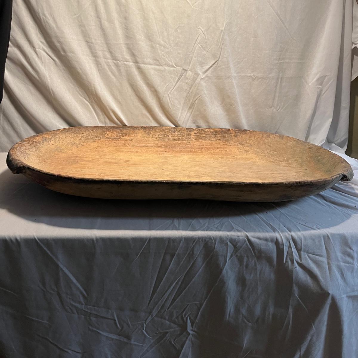 Lot includes a wooden dough bowl that measures 45” x 26” x 5.5”H. Bowl has nicks, scratches and water marks.