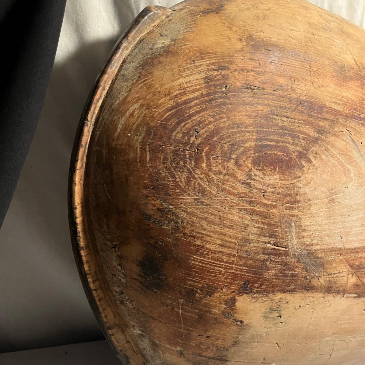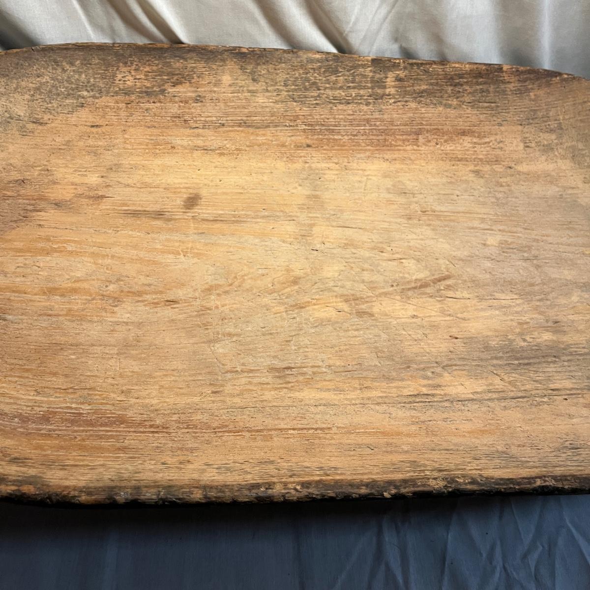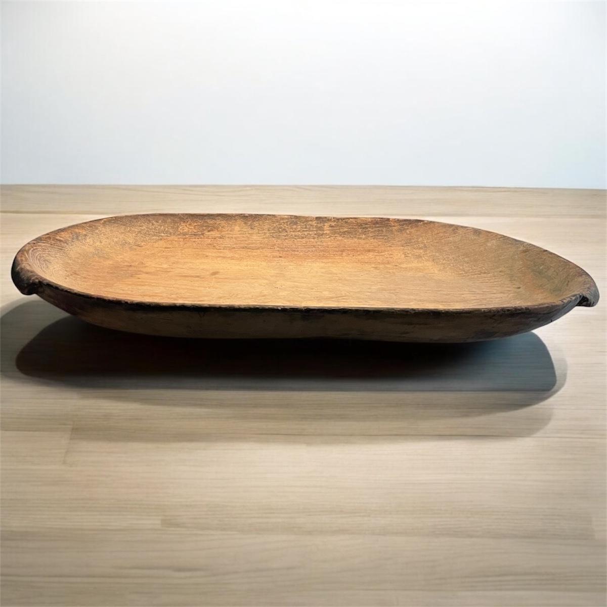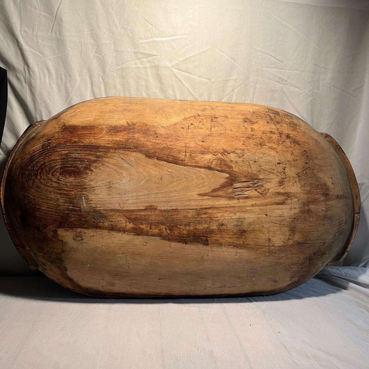 Lot includes a wooden dough bowl that measures 45” x 26” x 5.5”H. Bowl has nicks, scratches and water marks.