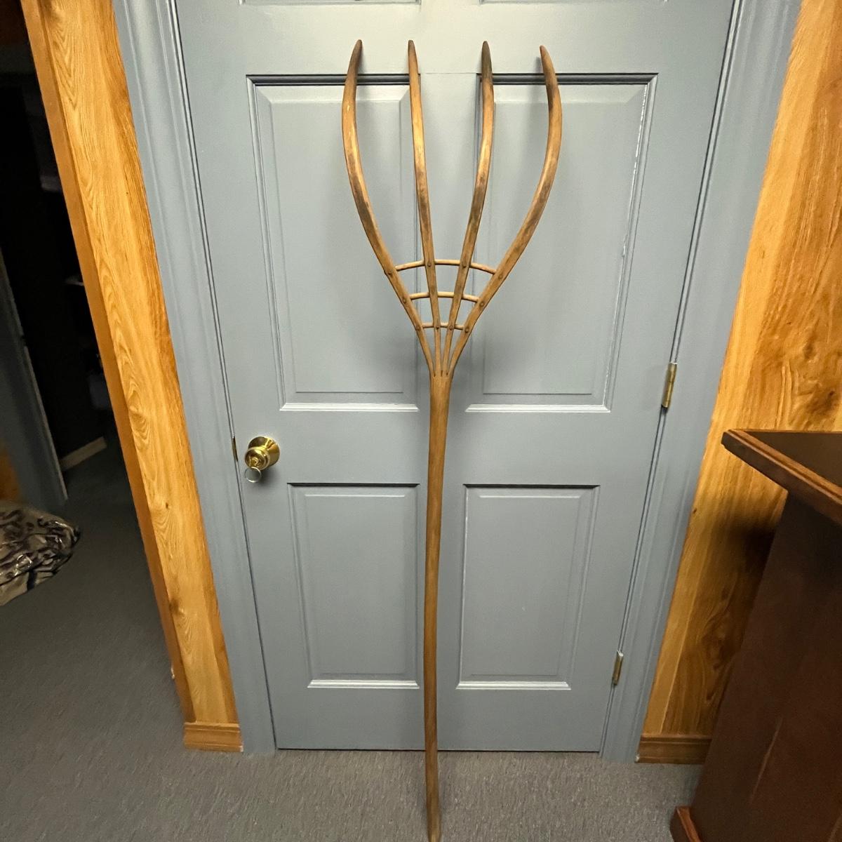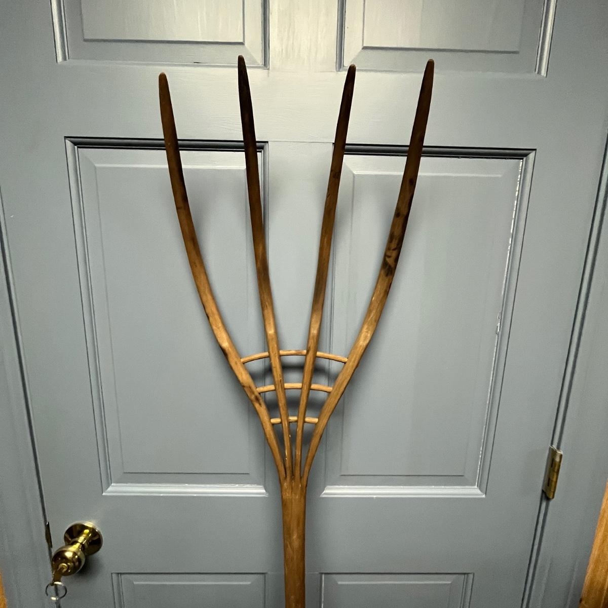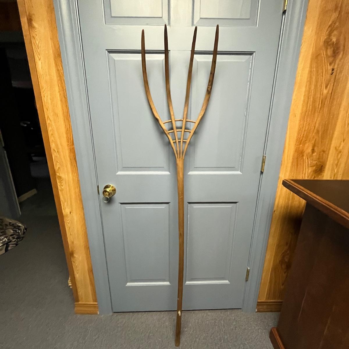 Lot includes a primitive wooden hay fork with four tines and wooden peg construction. Fork measures 12.5” x 6” x 66.5”H.