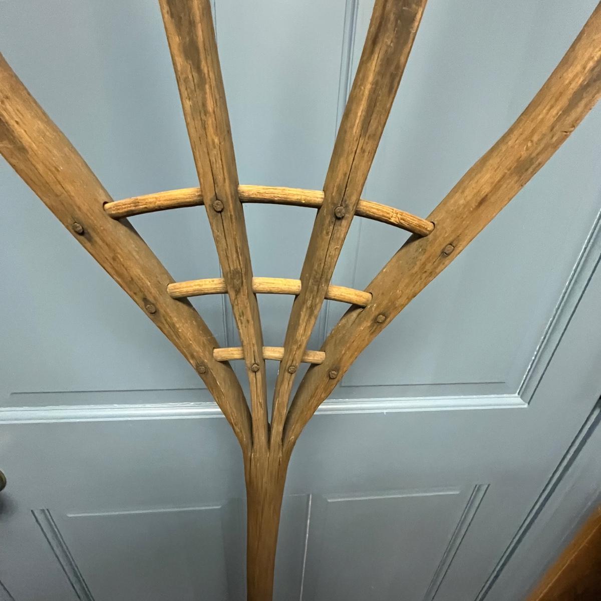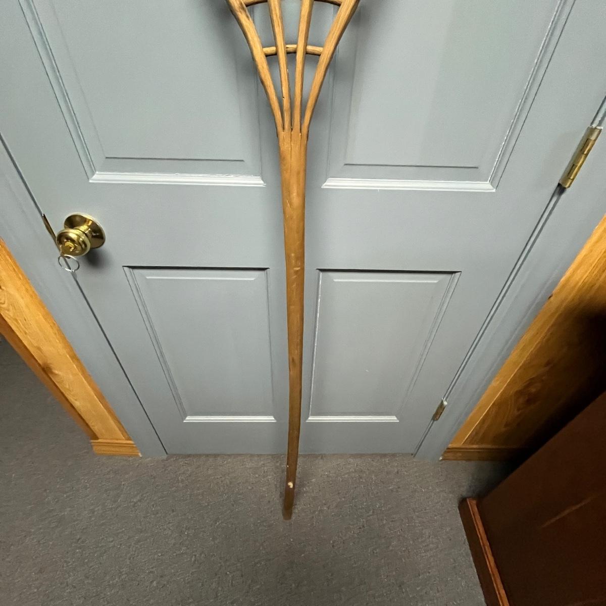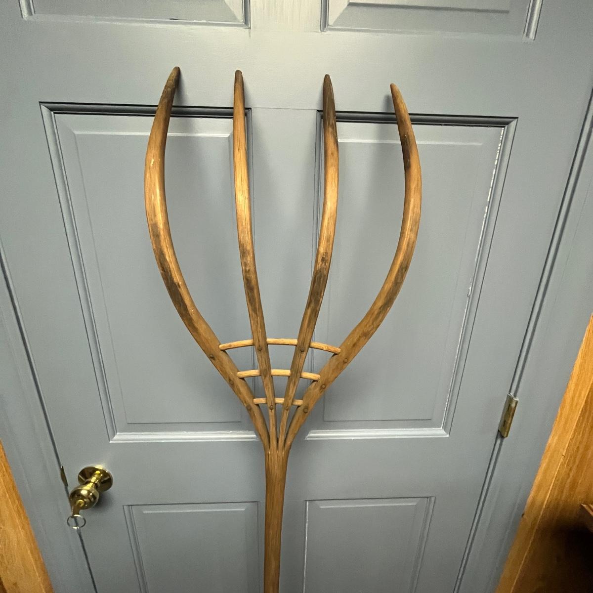 Lot includes a primitive wooden hay fork with four tines and wooden peg construction. Fork measures 12.5” x 6” x 66.5”H.
