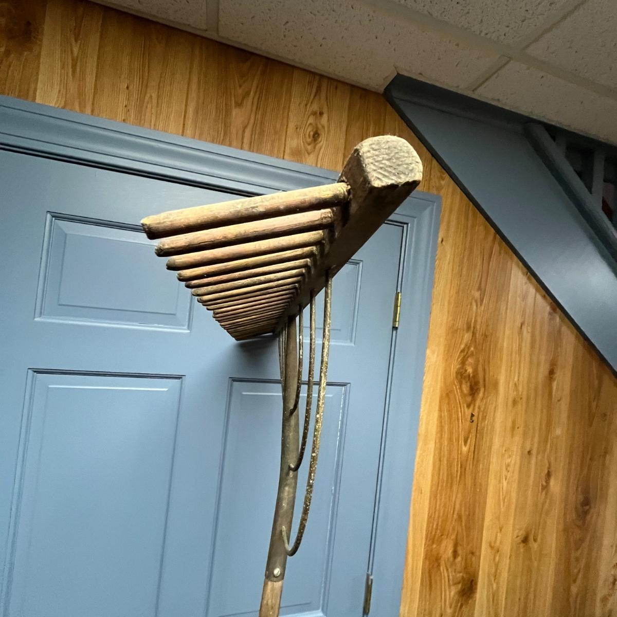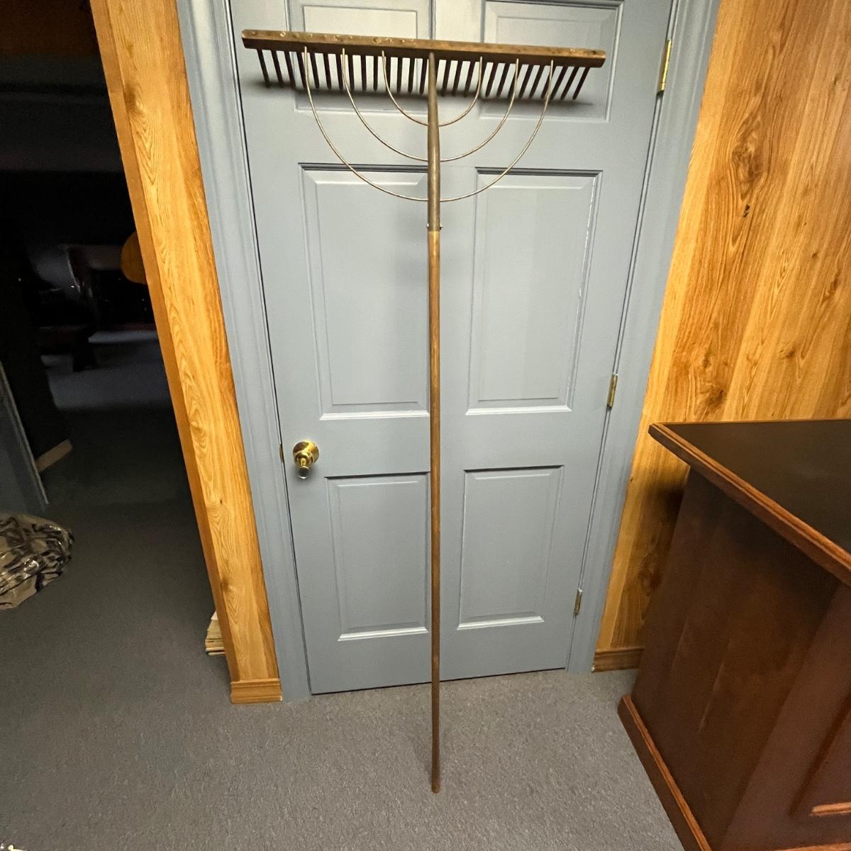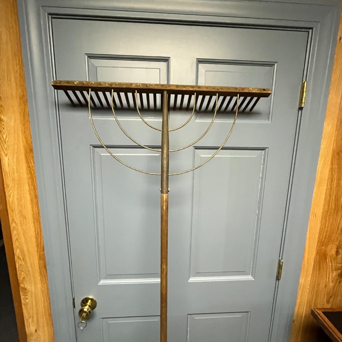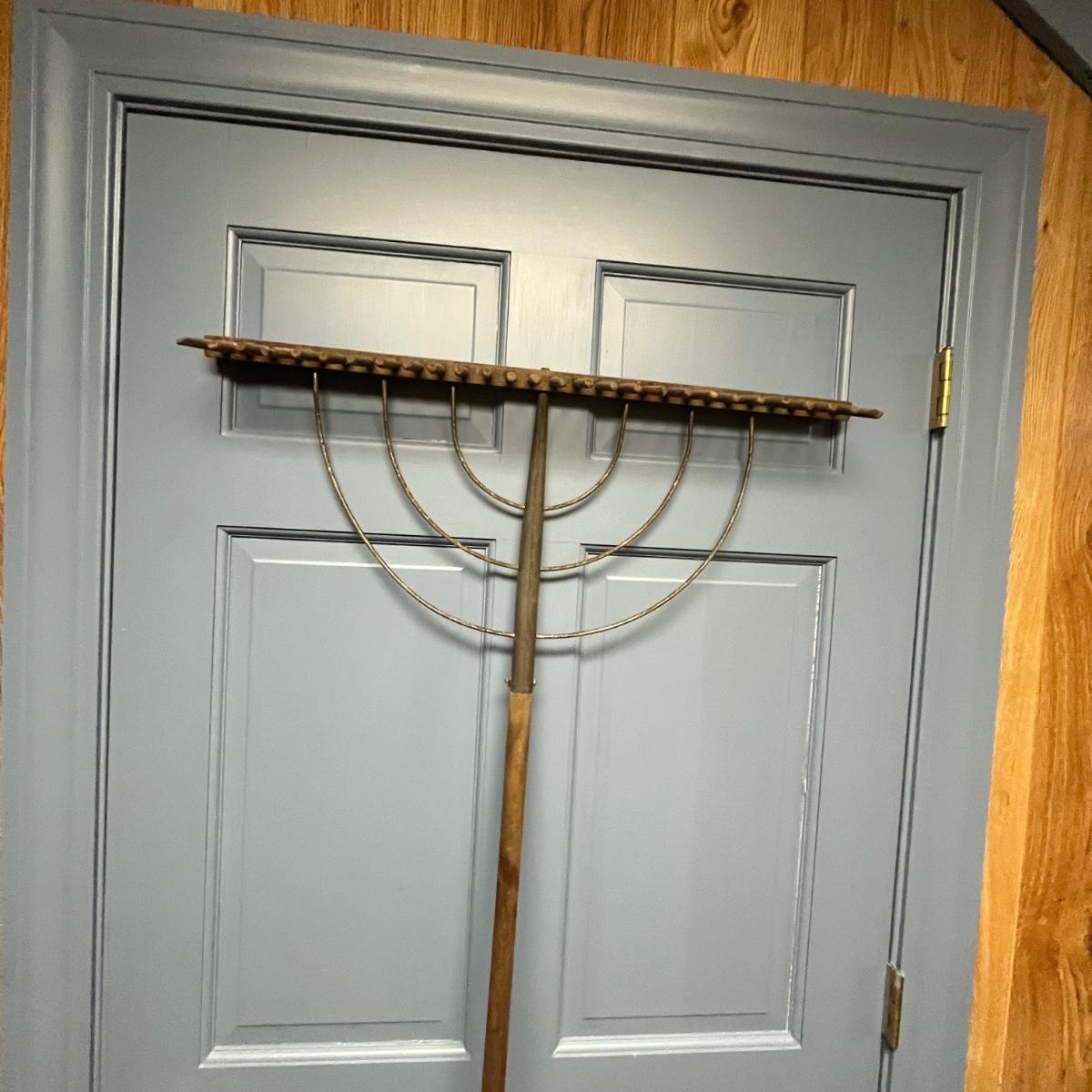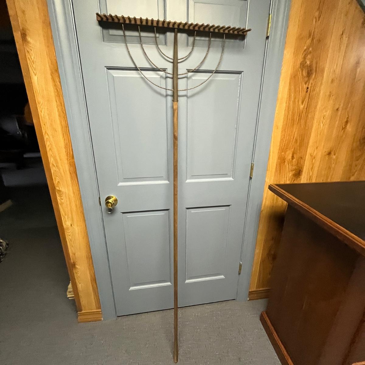 Lot includes a primitive wooden rake with metal supports. Rake measures 28” x 4” x 72” long.