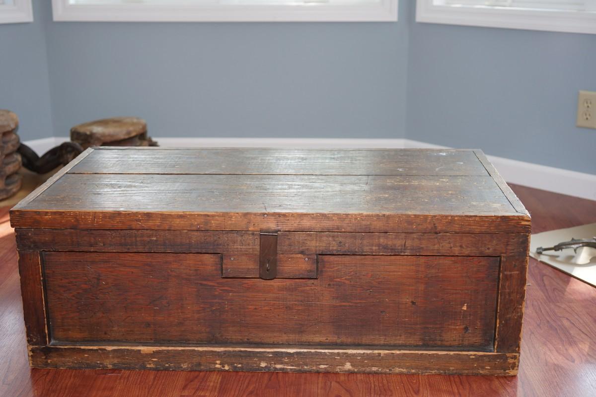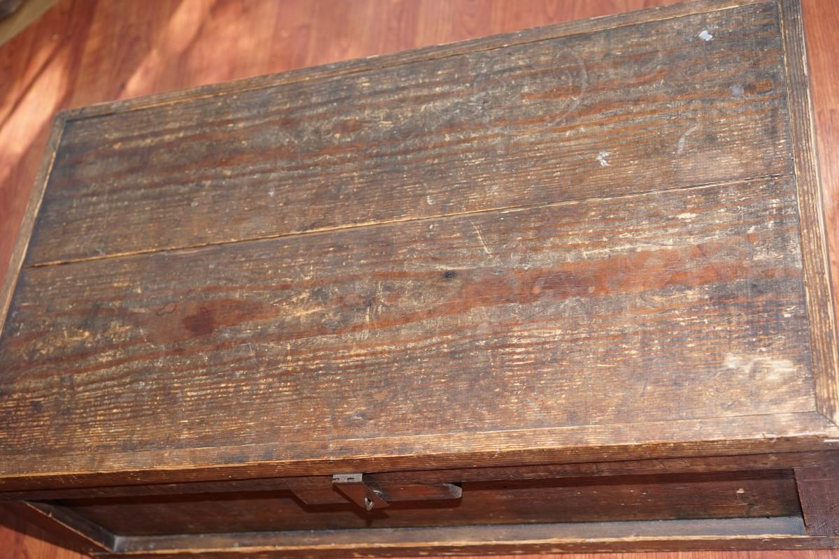 PRIMITIVE WOODEN TOOL CHEST /TWO BOARD PINE TOP. NO INSERT /CLEAN INTERIOR