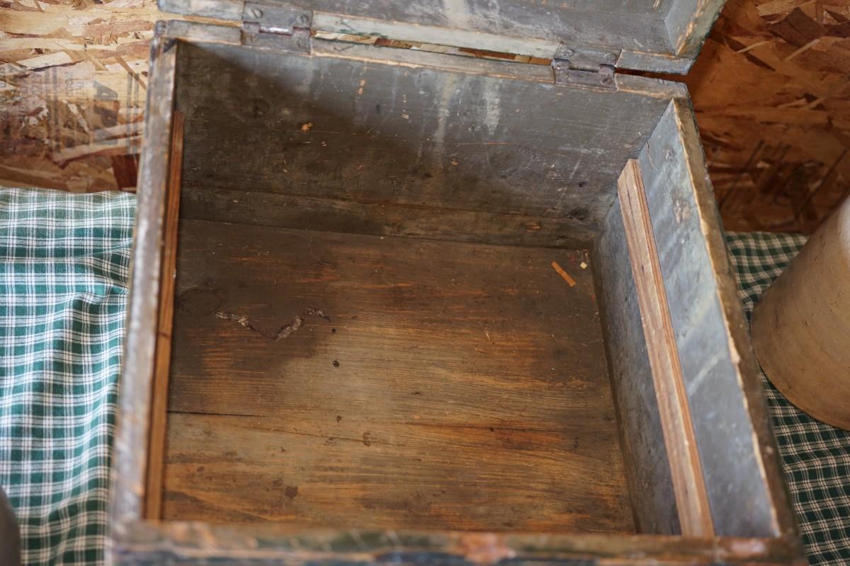 The box is heavy oak/rustic painted older green paint. nice storage at 16 1/2" by 16" by 11 1/2" in height. good condition and clean interior,