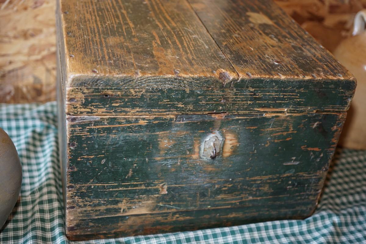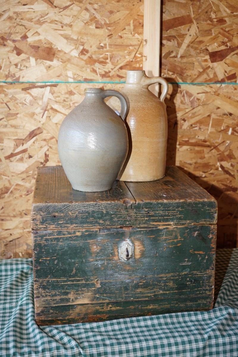 PRIMTIVE GROUPING OF GREEN PAINTED OAK BOX/ J. FISCHER LYONS N.Y STONEWARE JUG/OVOID GREY STONEWARE JUG