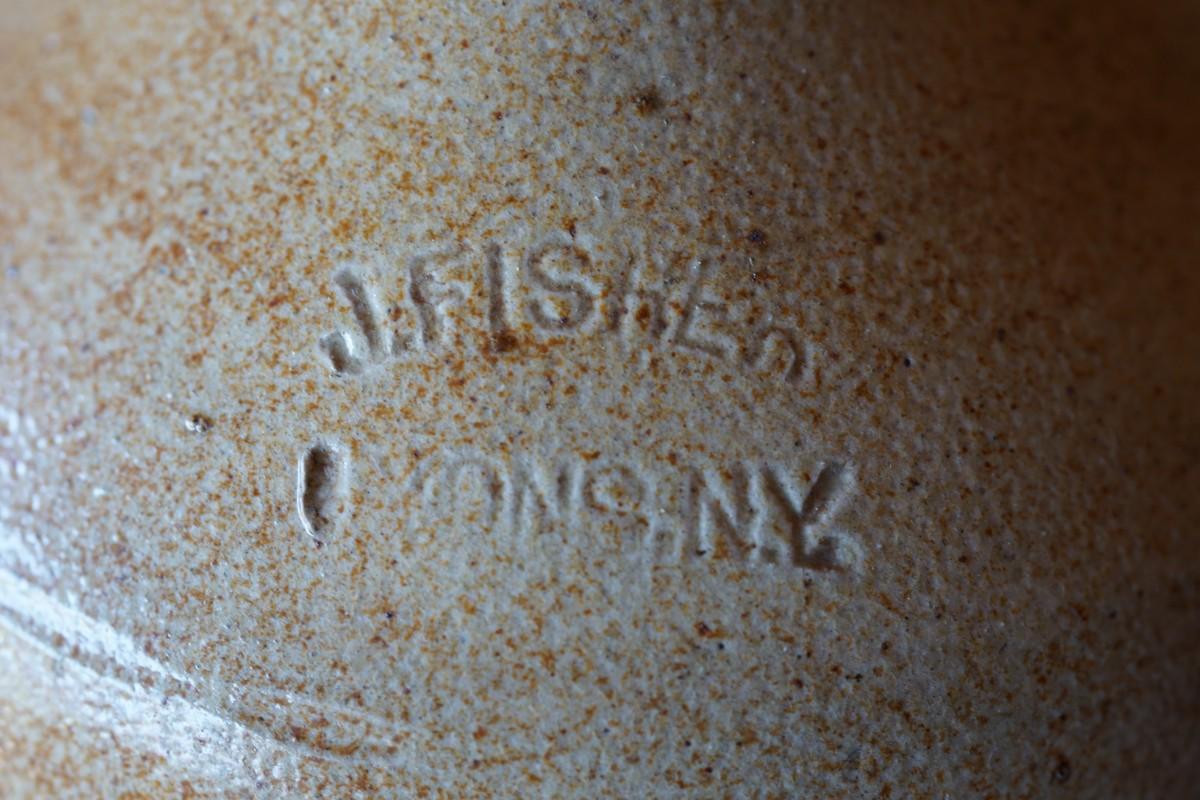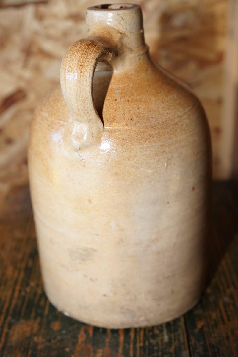 The jug of natural color and has an applied handle. New England . Lyons of New York. J. Fischer Co. 12" in height.