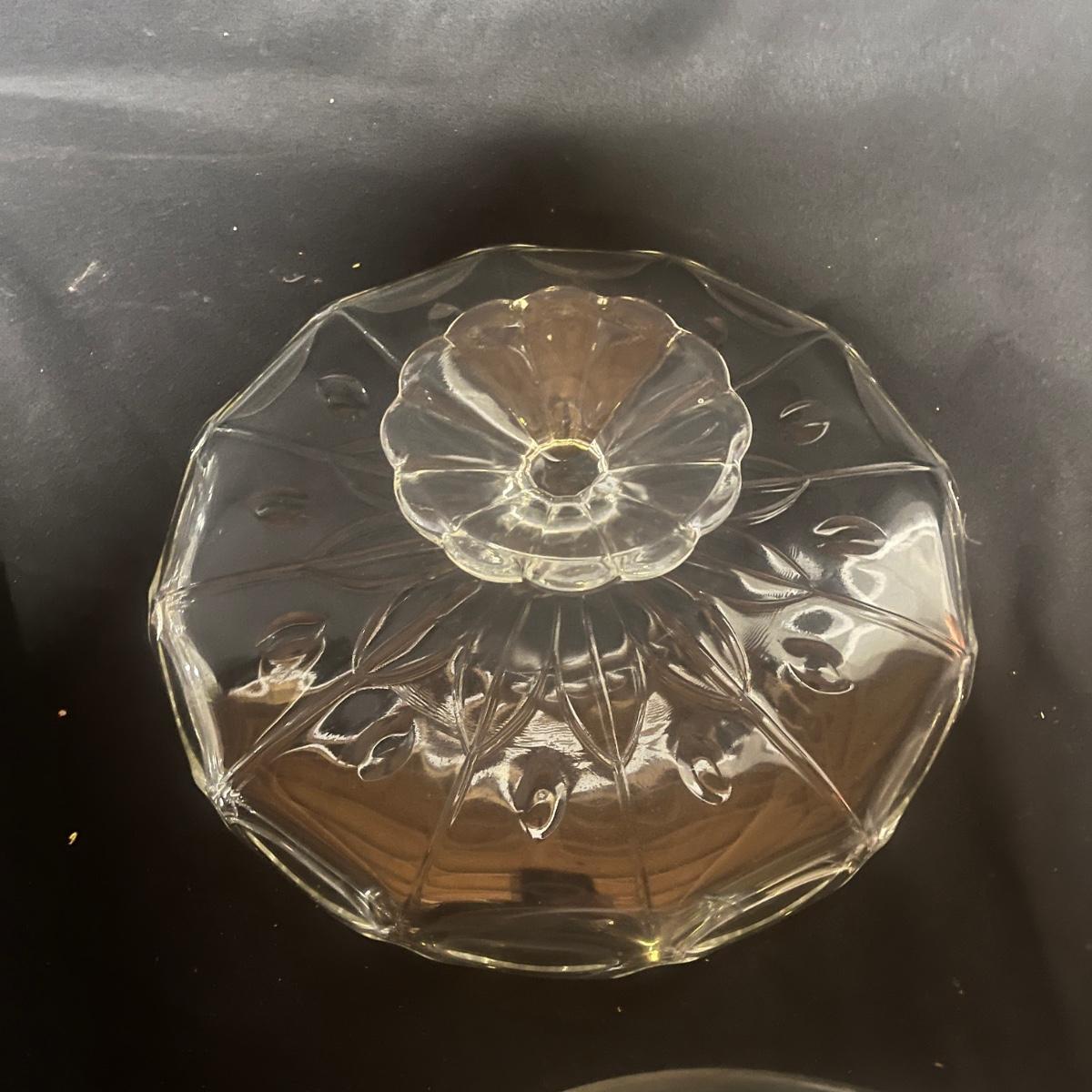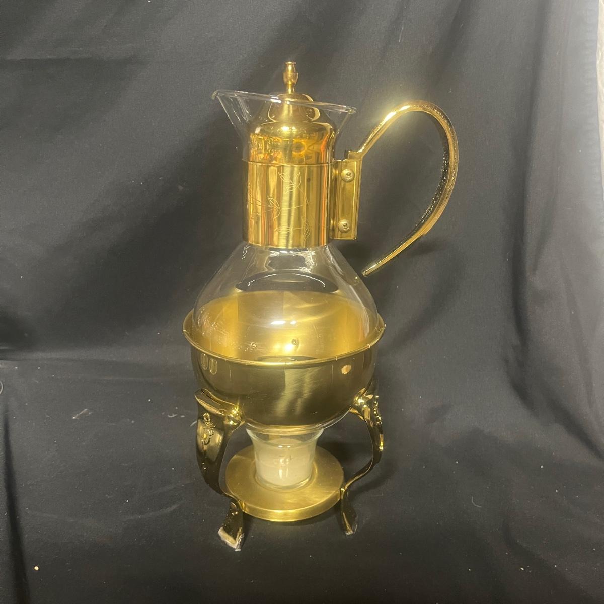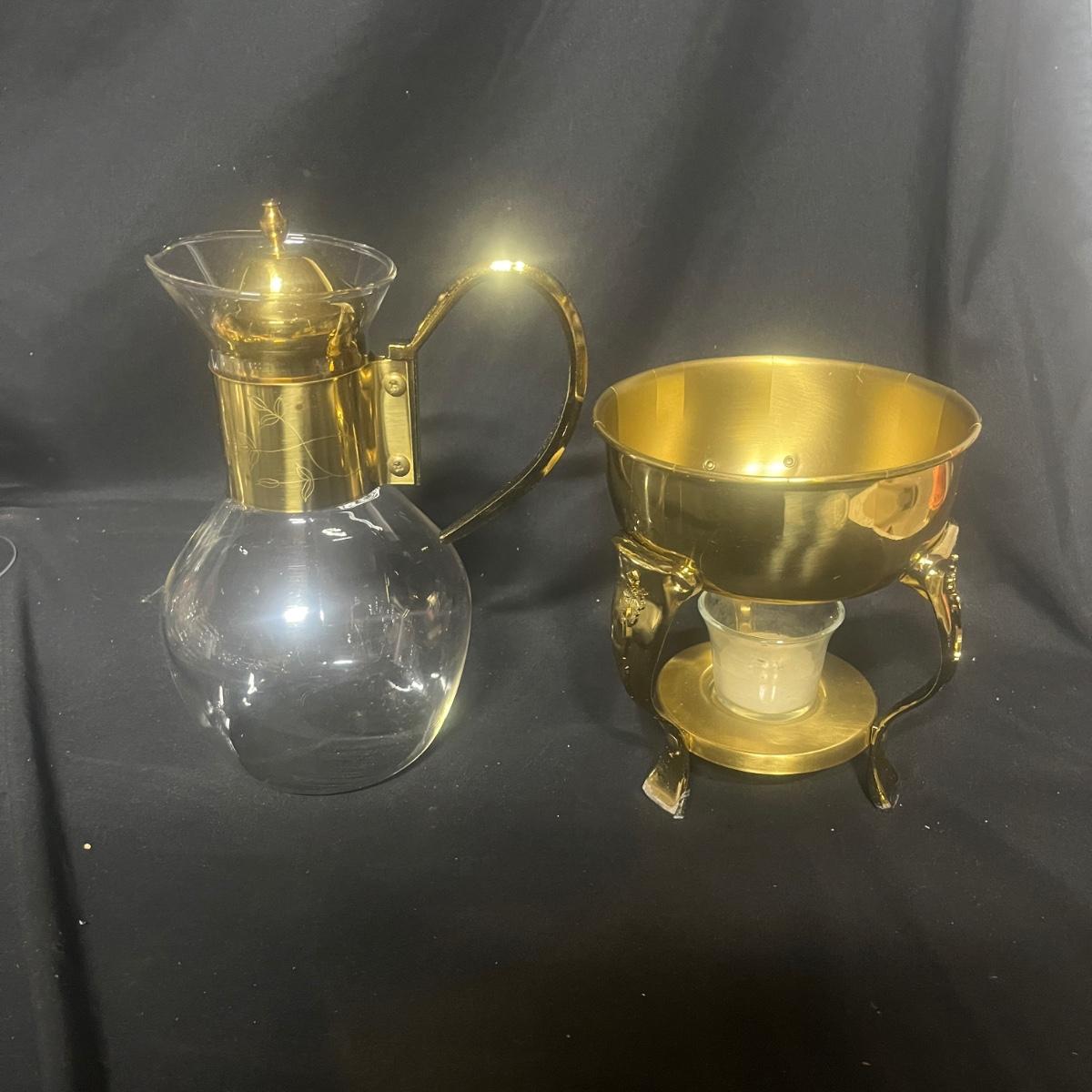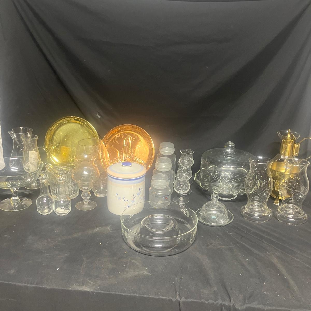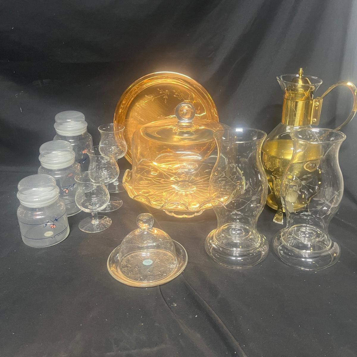 This collection of Princess House etched glass and more includes coffee pot, cake tray, cookie jar, candle holders, copper and brass trays, cruets, glasses, canister, ice bucket and more. Cake stand measures 12”D x 12”H. Many items are in their original boxes.