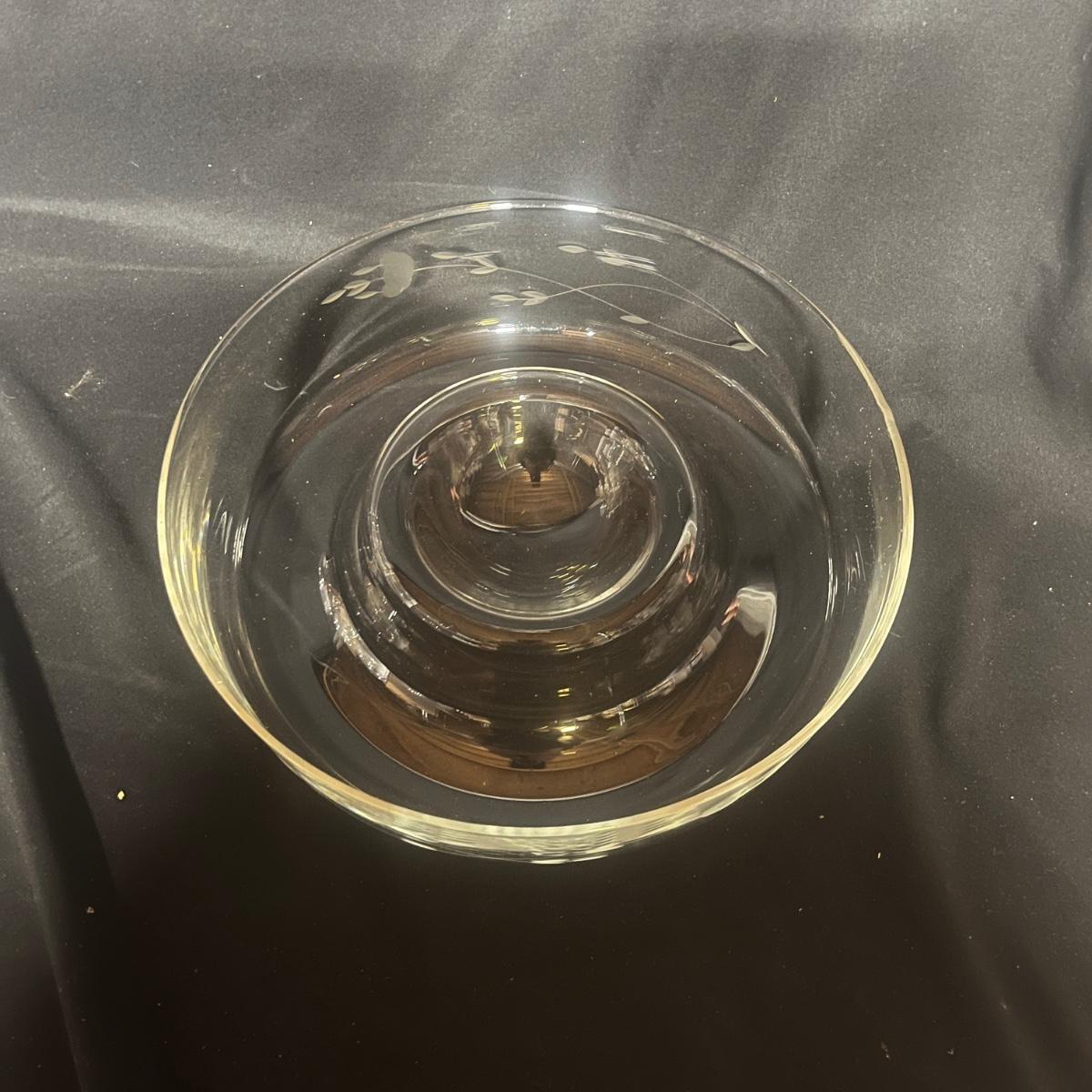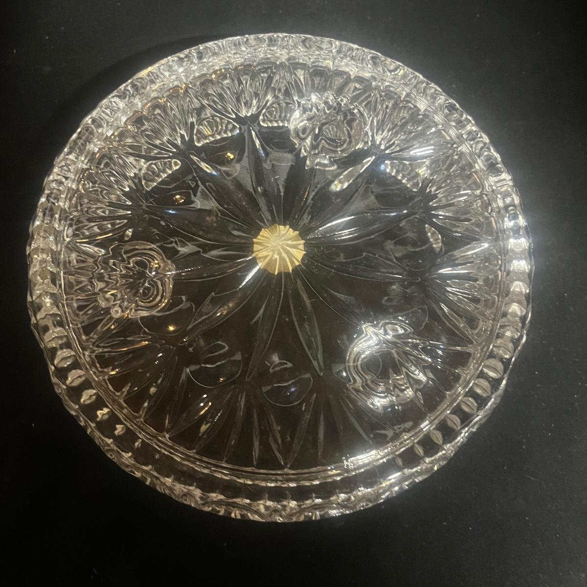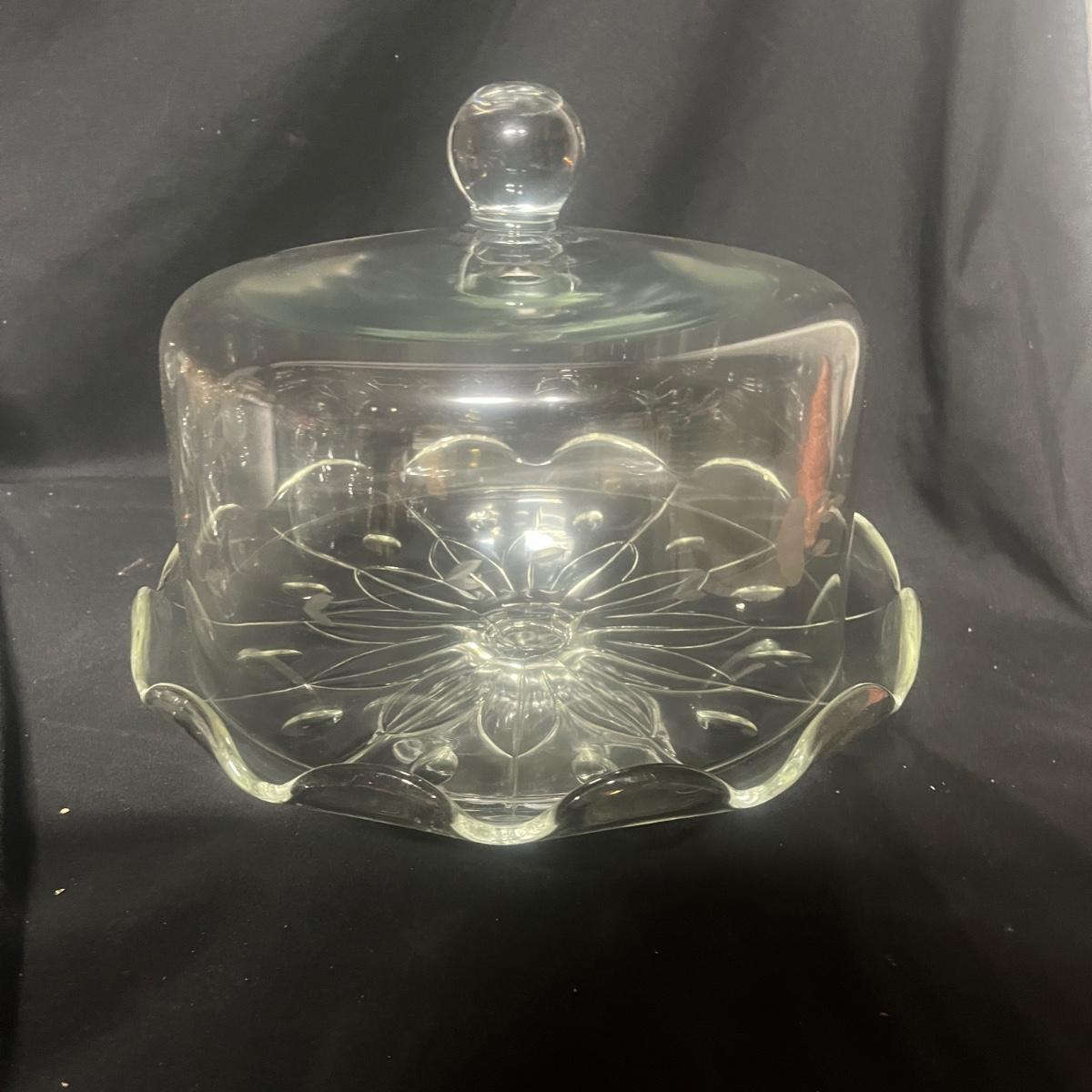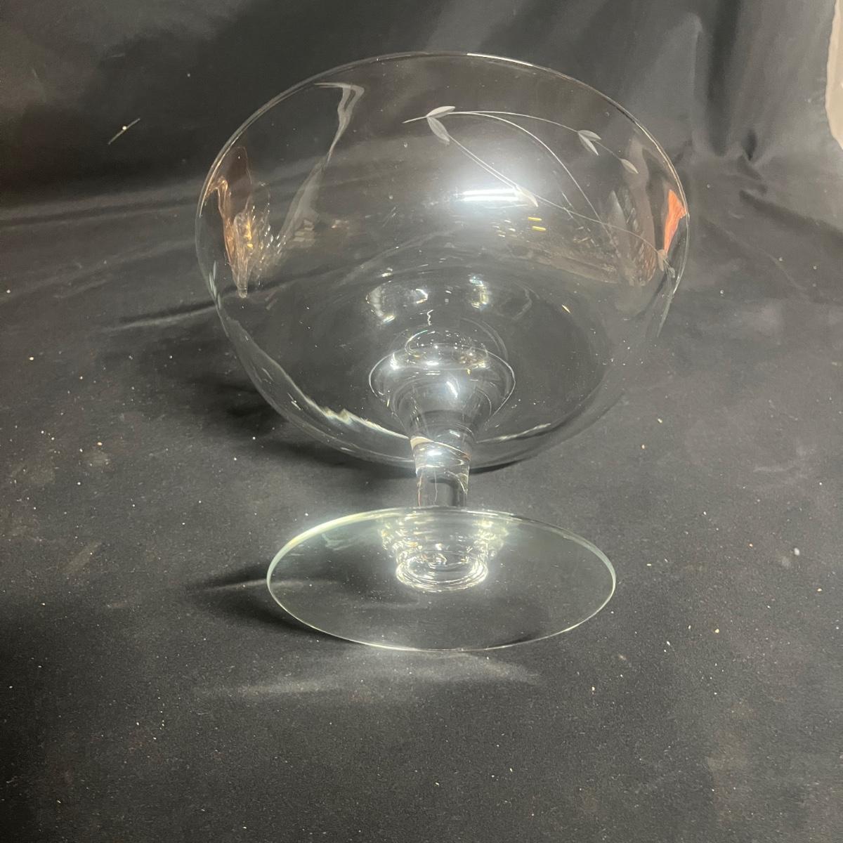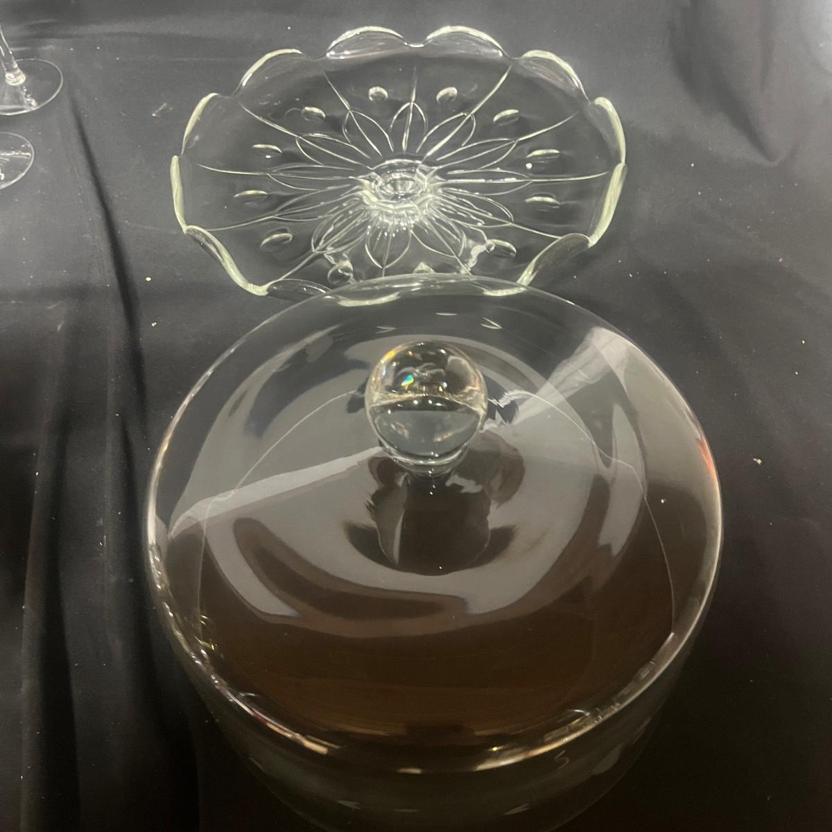 This collection of Princess House etched glass and more includes coffee pot, cake tray, cookie jar, candle holders, copper and brass trays, cruets, glasses, canister, ice bucket and more. Cake stand measures 12”D x 12”H. Many items are in their original boxes.