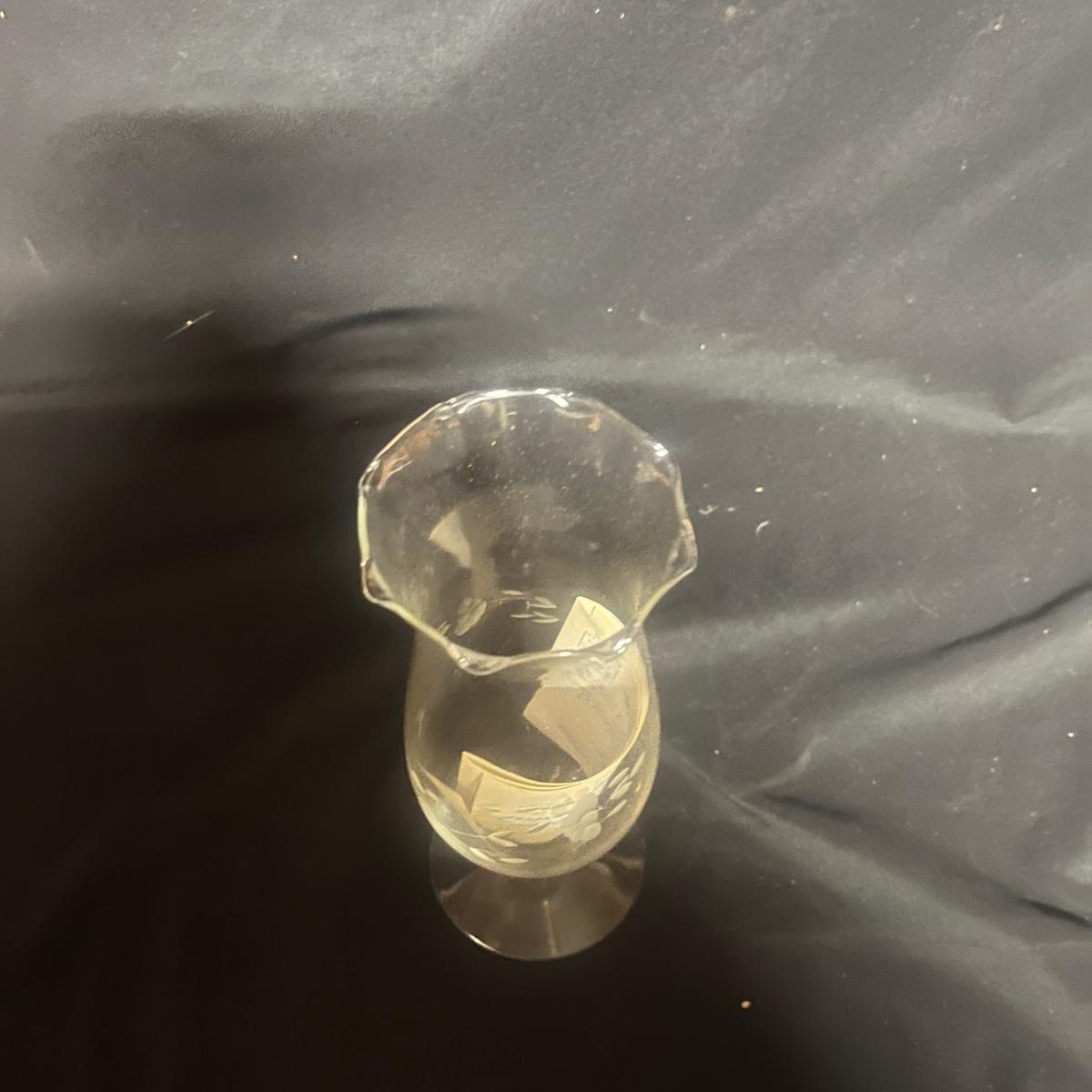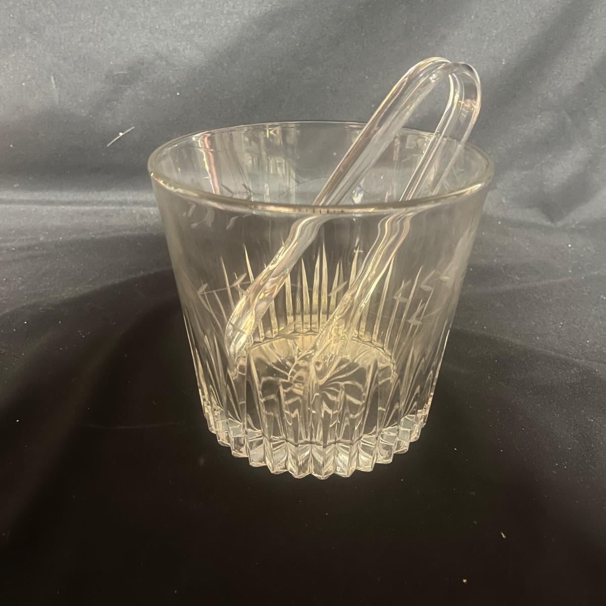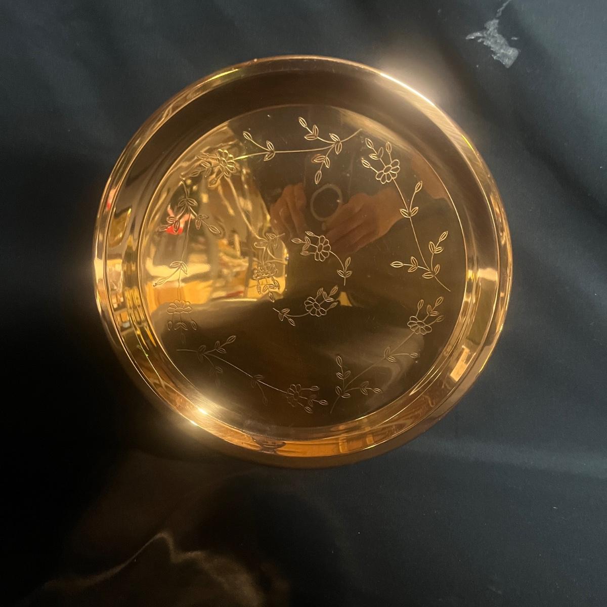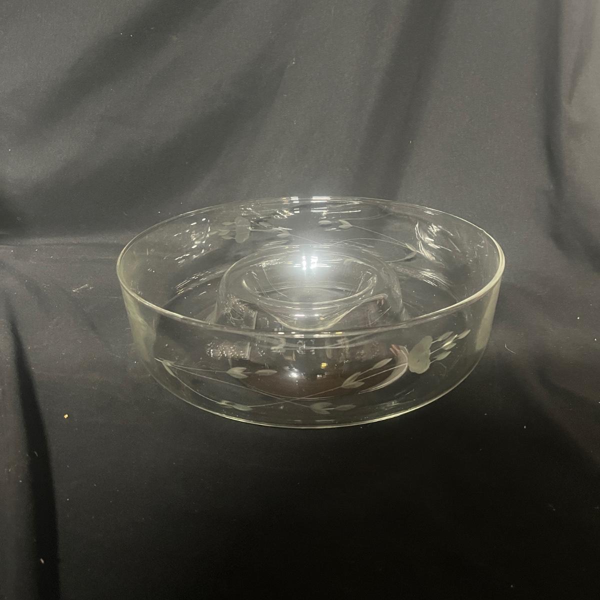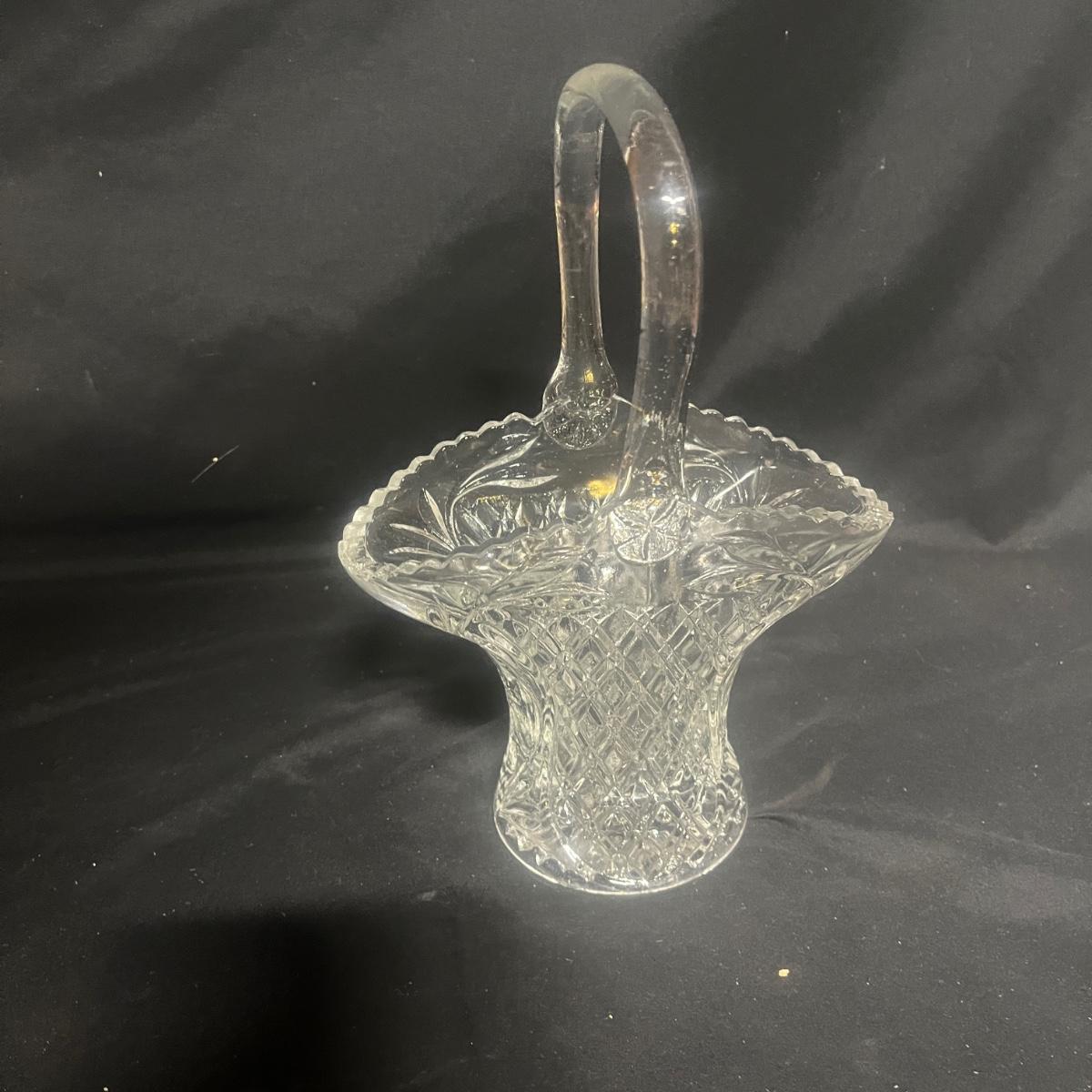This collection of Princess House etched glass and more includes coffee pot, cake tray, cookie jar, candle holders, copper and brass trays, cruets, glasses, canister, ice bucket and more. Cake stand measures 12”D x 12”H. Many items are in their original boxes.