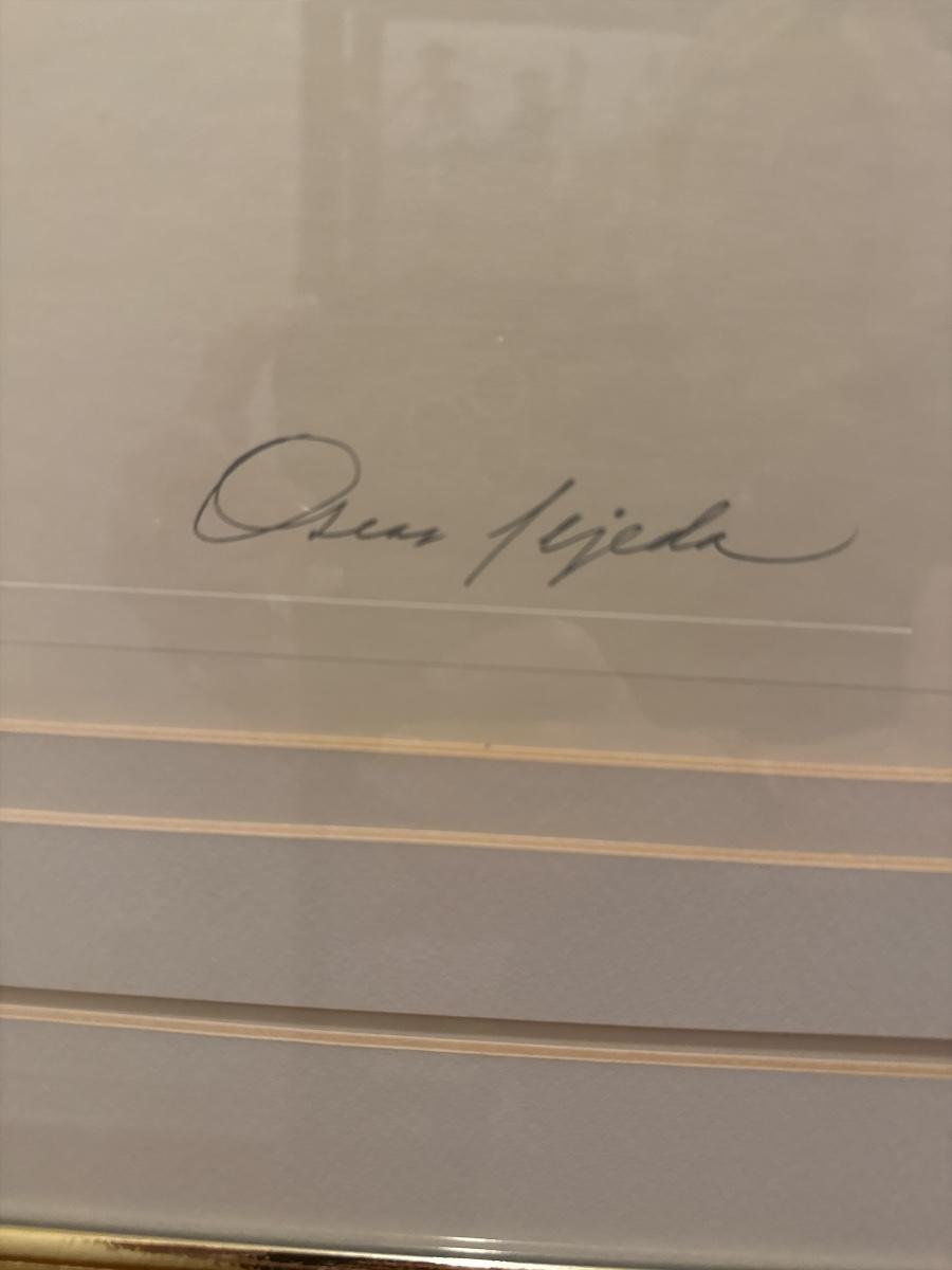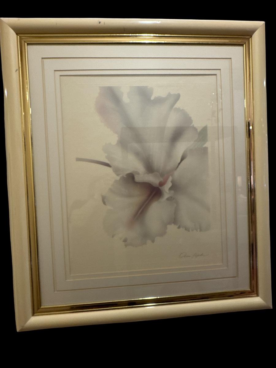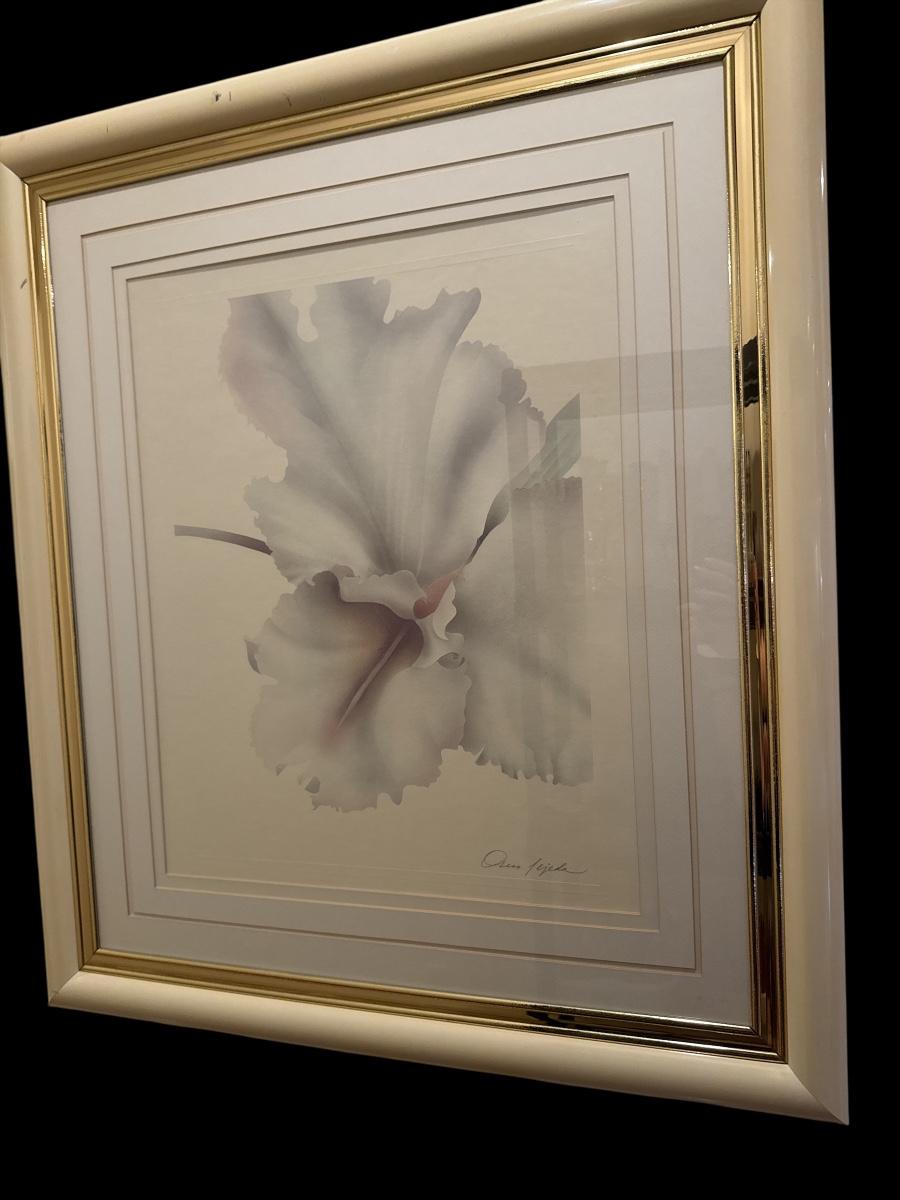 39” l x 33 1/2” Soft and elegant floral art print, featuring a delicate white iris with subtle pink and lavender tones. Set in a double mat and cream-colored frame with gold accents. Timeless and serene decor piece.