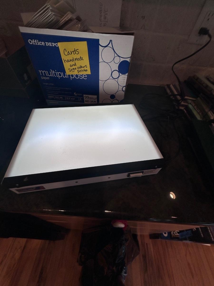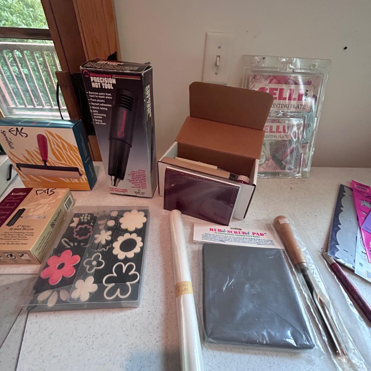 Lot includes two Speedball Brayers, two light boxes, metal stamps, four pad pucks, a precision hot tool, lots of stencils, embossing tools, two Gelli printing plates and more. Local pick up only.