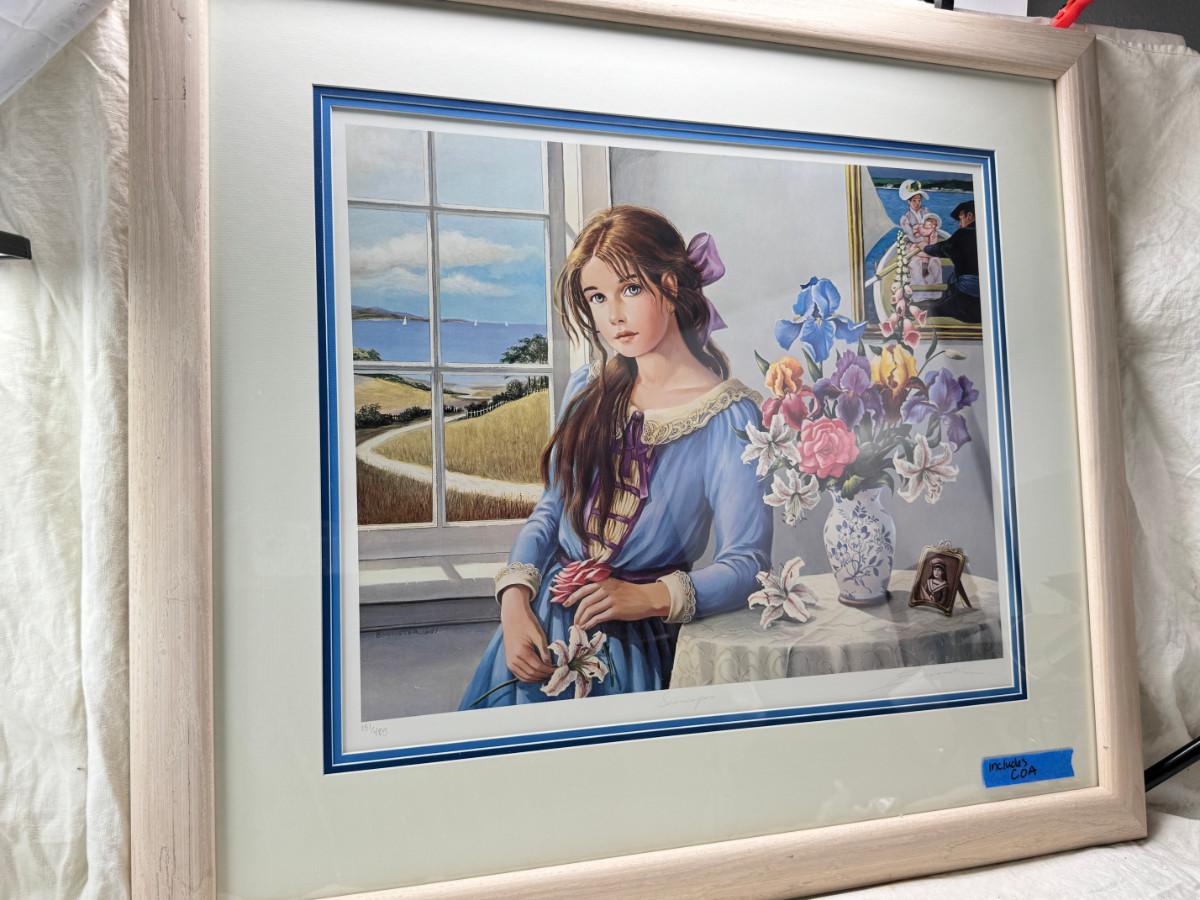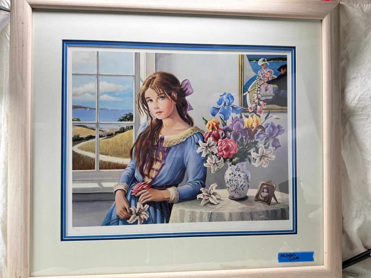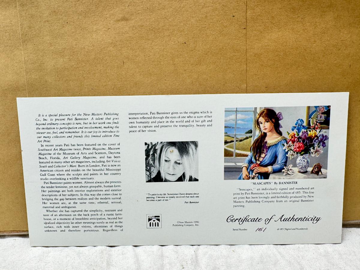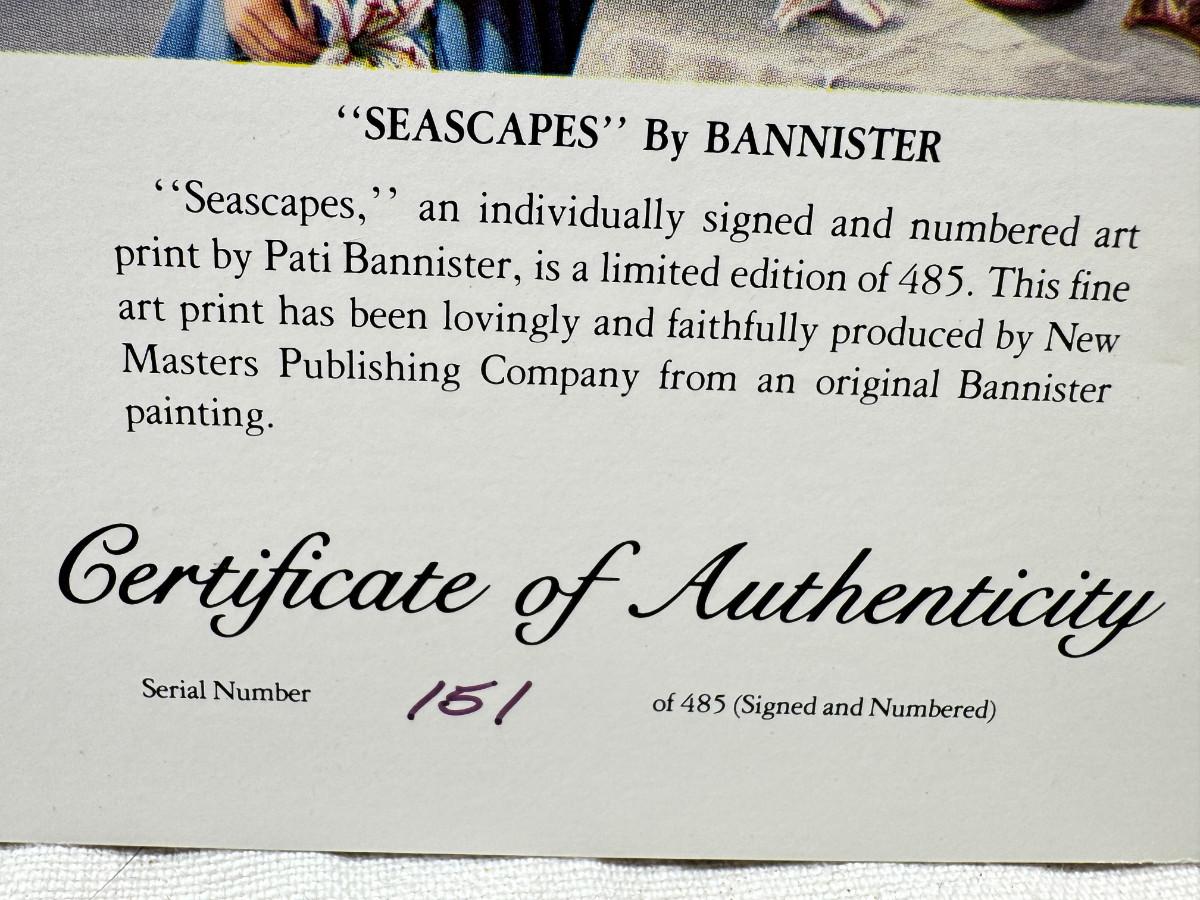 Large framed he image is a limited edition lithograph titled Seascapes by the late artist Patti Bannister. The print is signed and numbered, with an edition size of 485. It was created in 1990 and measures 21" x 17". Framed size is 20 X 24X2 No shipping