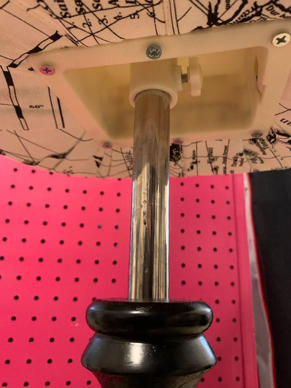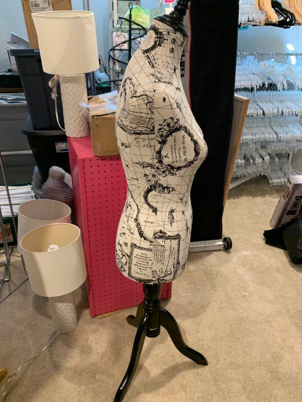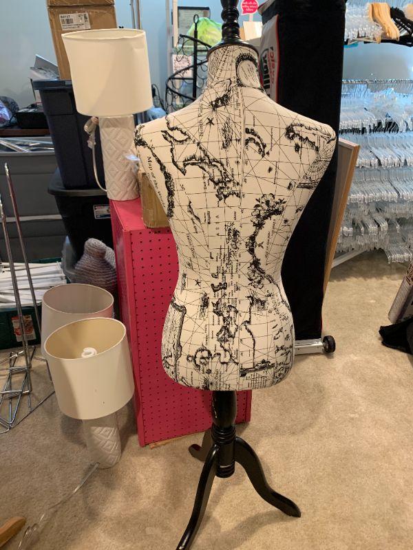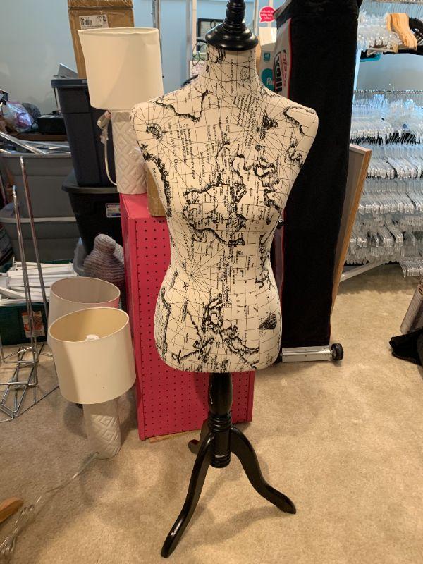 Printed map fabric female dress form with adjustable base. Base has a scratch as shown.