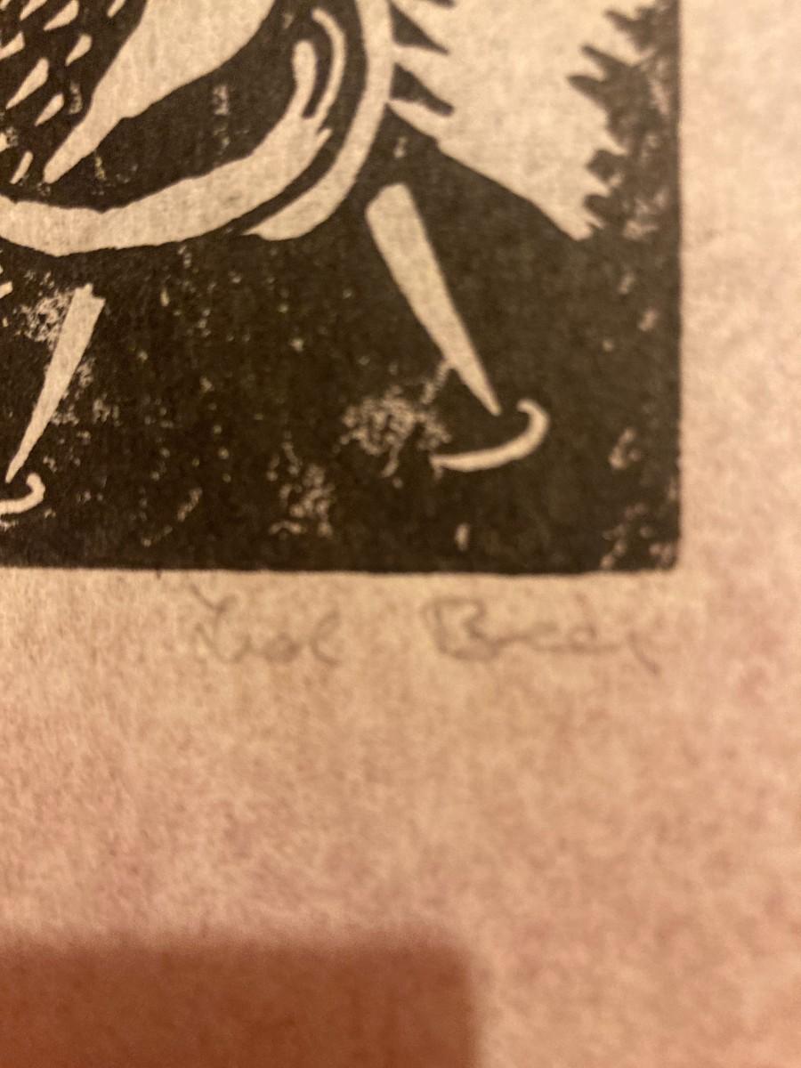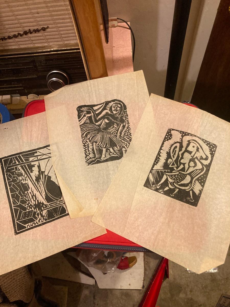 3 unframed lino prints on parchment paper, signed and numbered. Approximately 5" x 7"