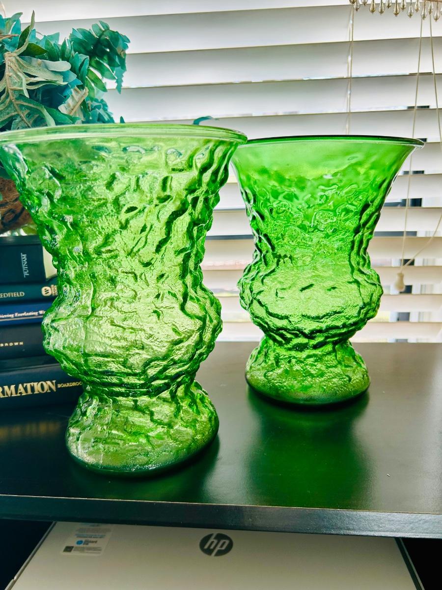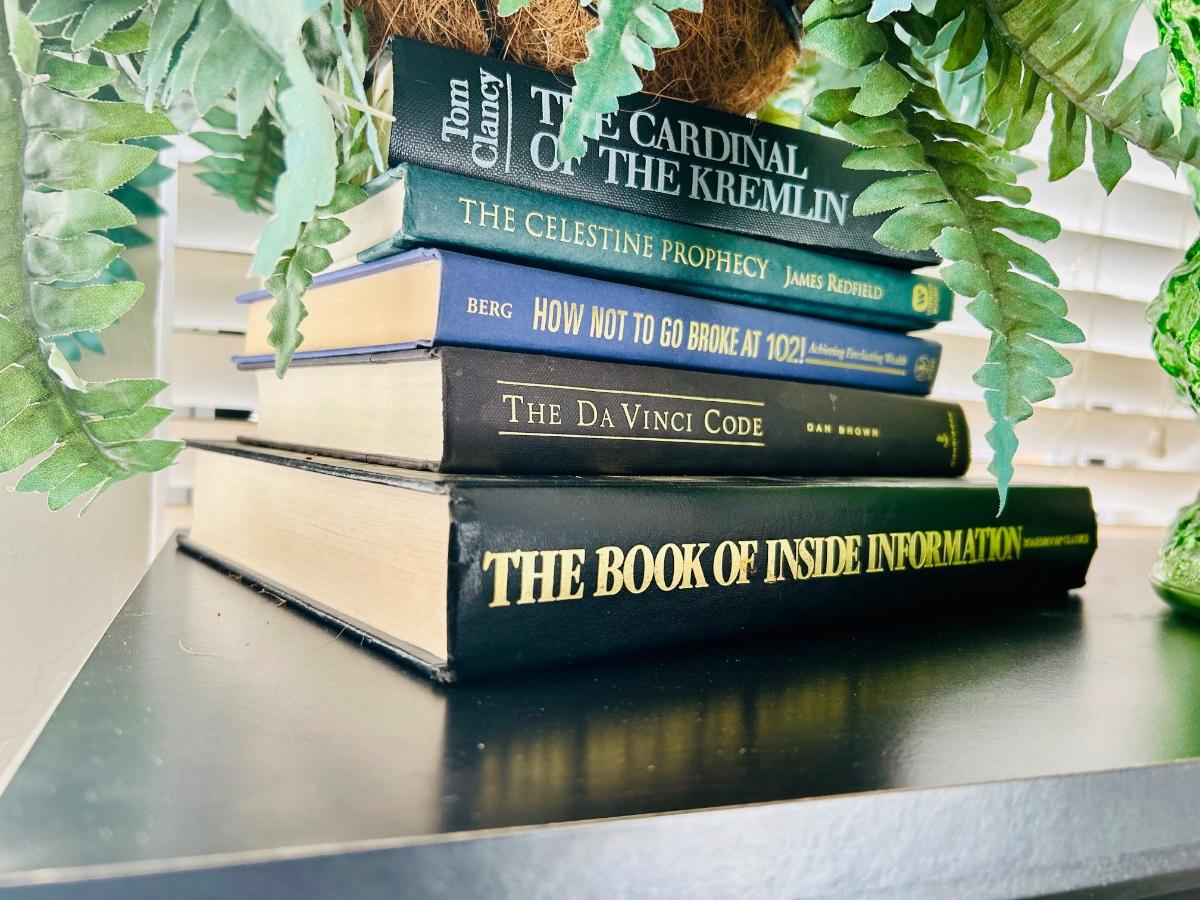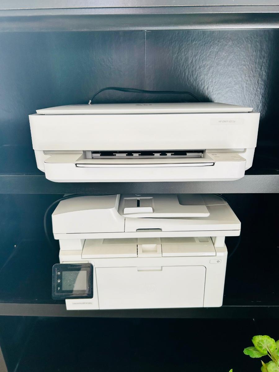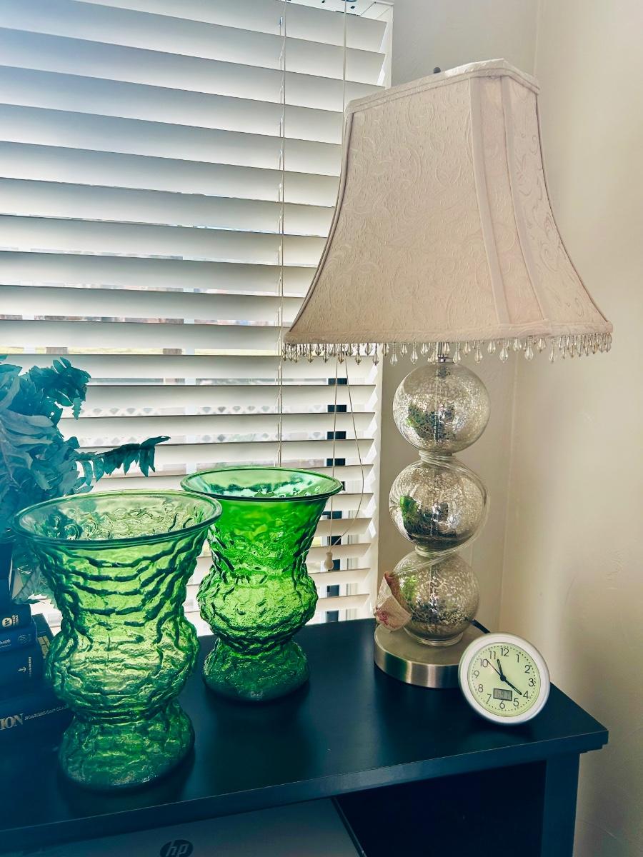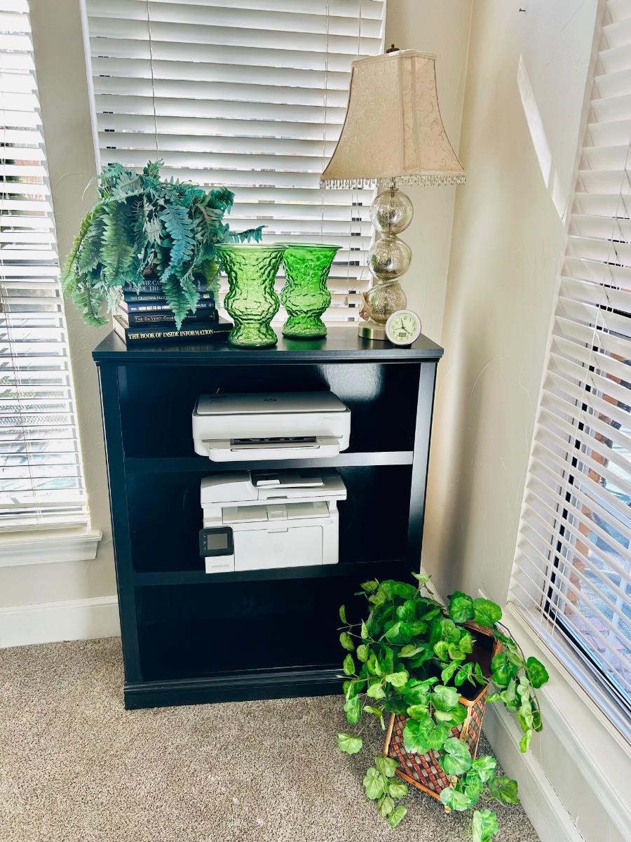 Black Bookcase with printers and Decor including Green glass , printers & more