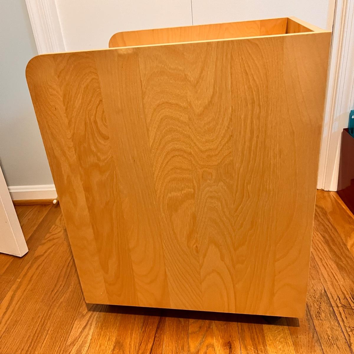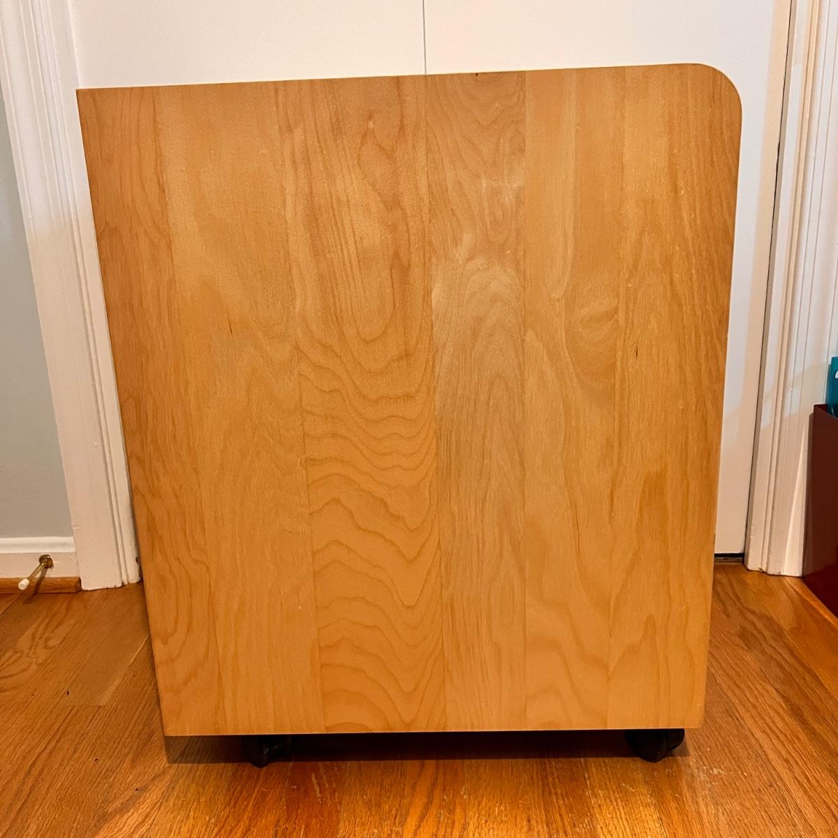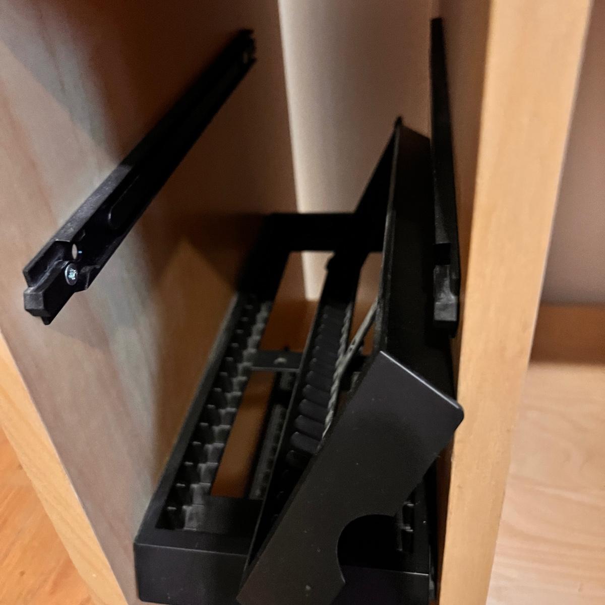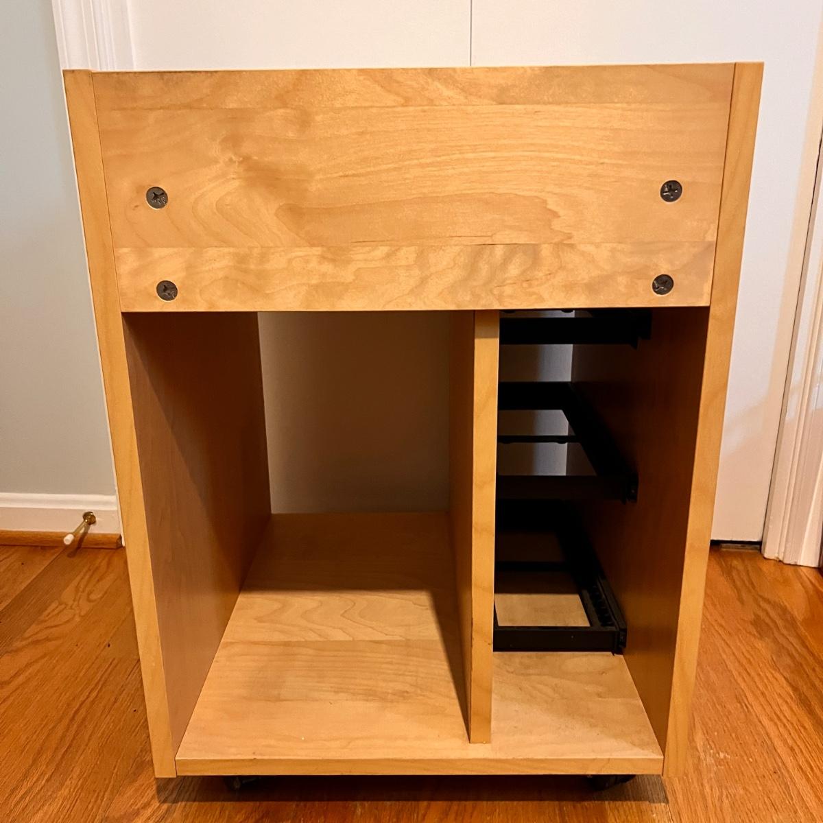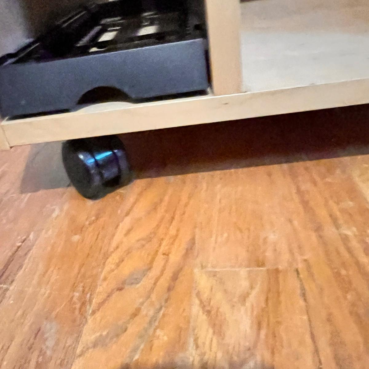 Comes with media storage drawers that can easily be removed. Roll easily. In good used condition.