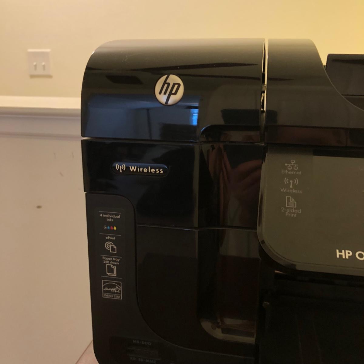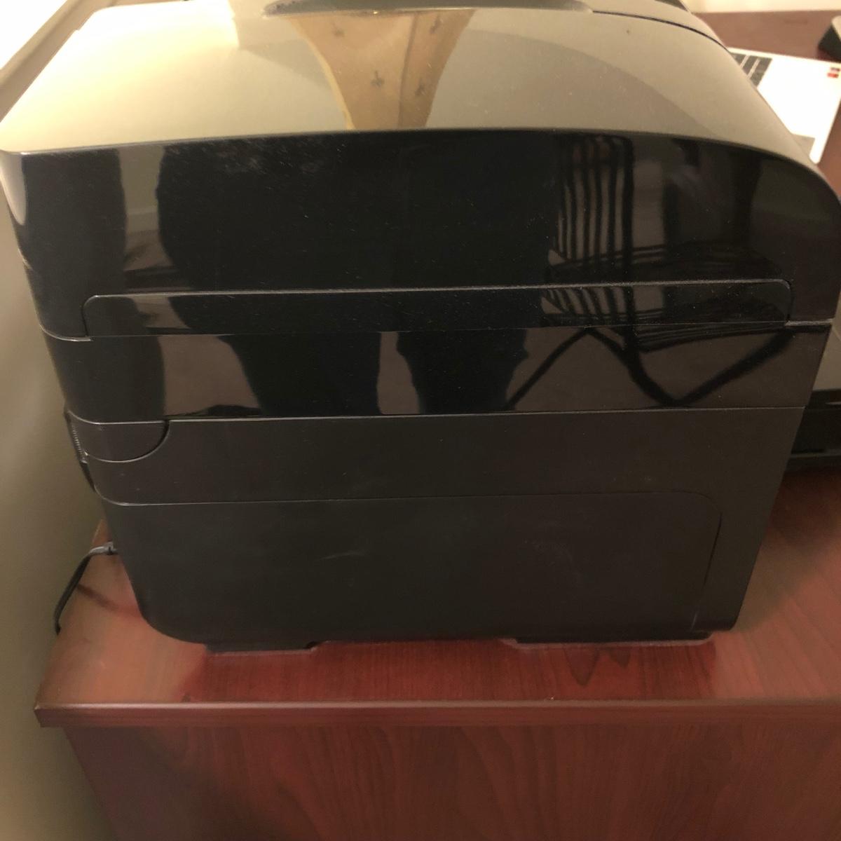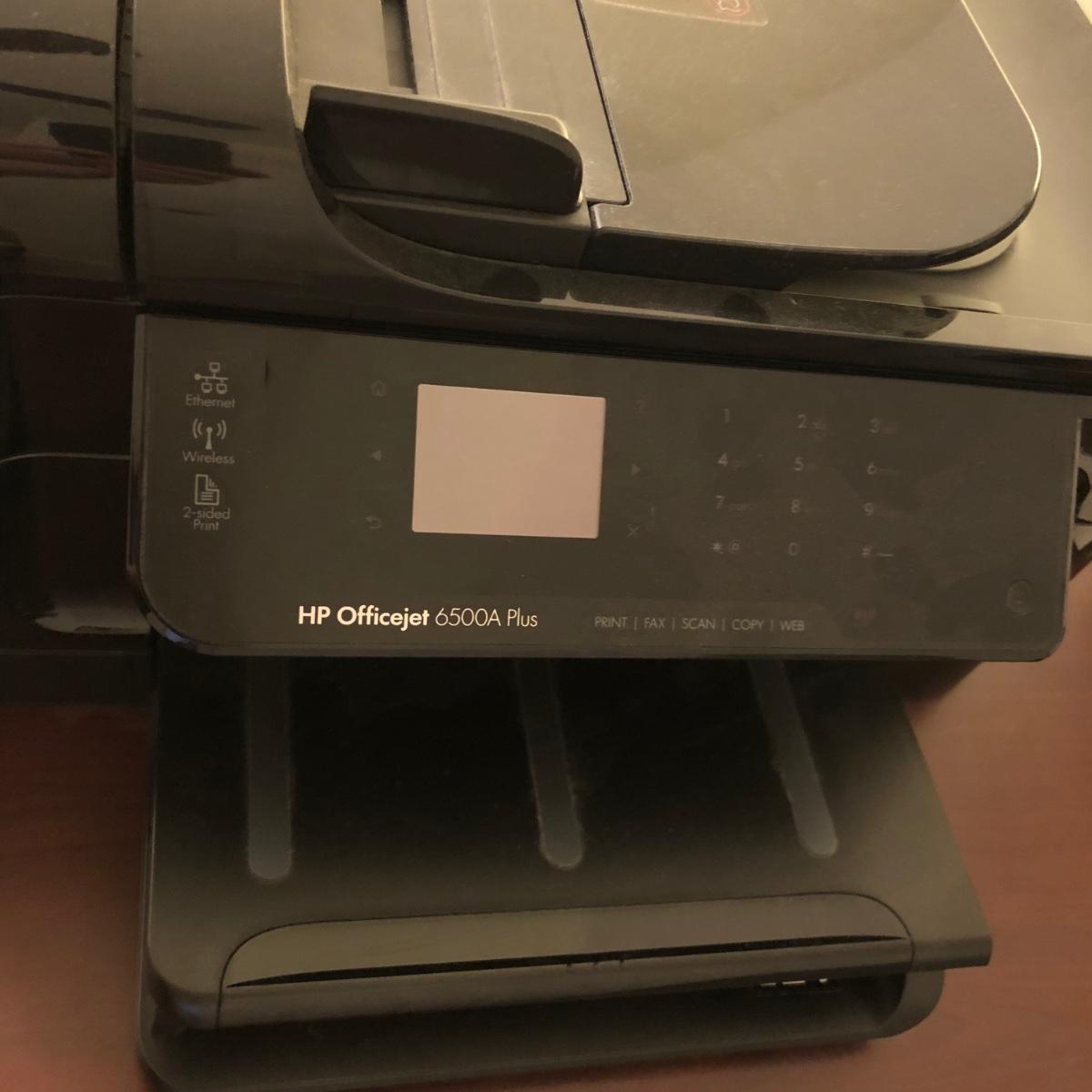 This HP Officejet 6500A Plus printer also faxes, scans, copies and has internet connection. It comes with a handbook and installation CD. It measures 18.5” x 10” x 16” and powered on and showed internet connection. Local pickup only.