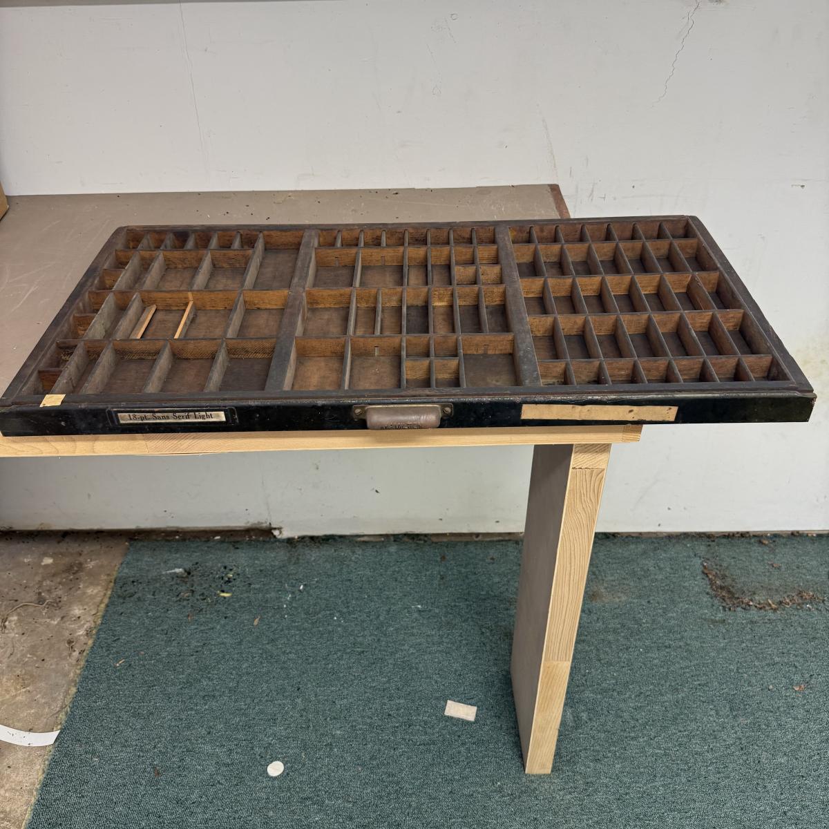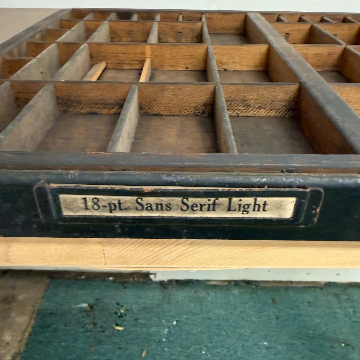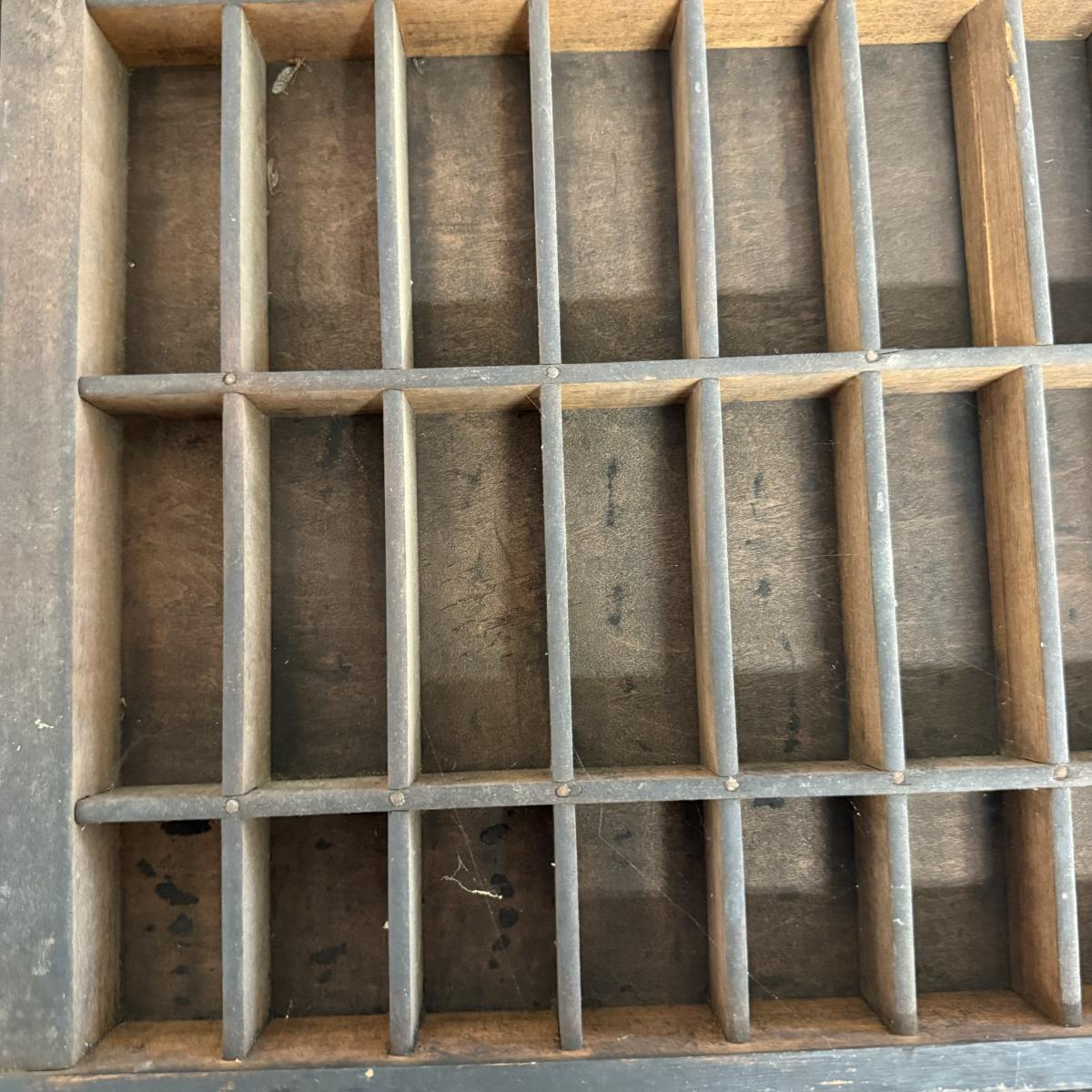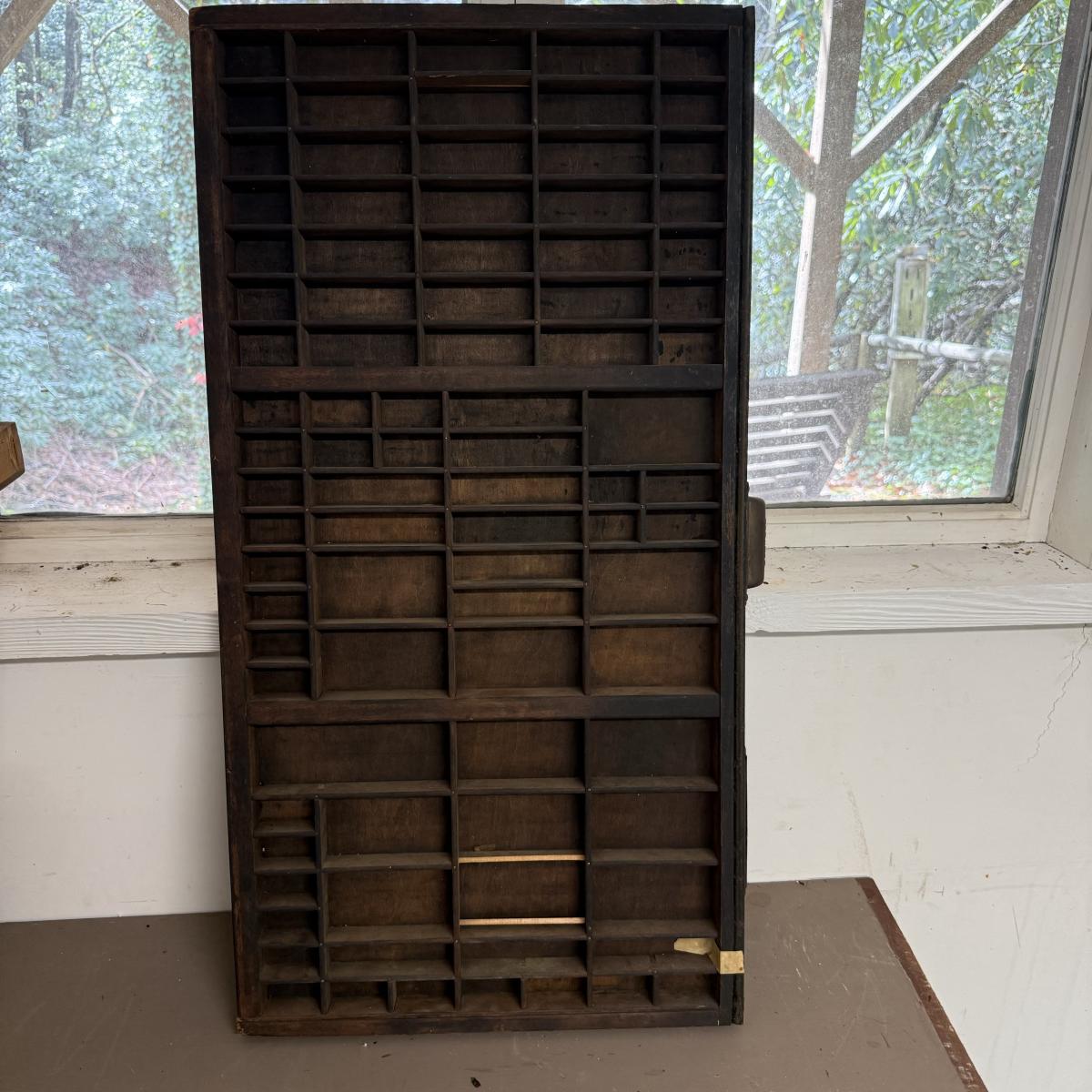 A vintage printer drawer letterpress tray measures 32” X 16.75” X 3.25”H. The wooden box container measures 4.25” X 24” X 1.5”H. Three wooden spools, the largest measures 2.24”D X 12”H.