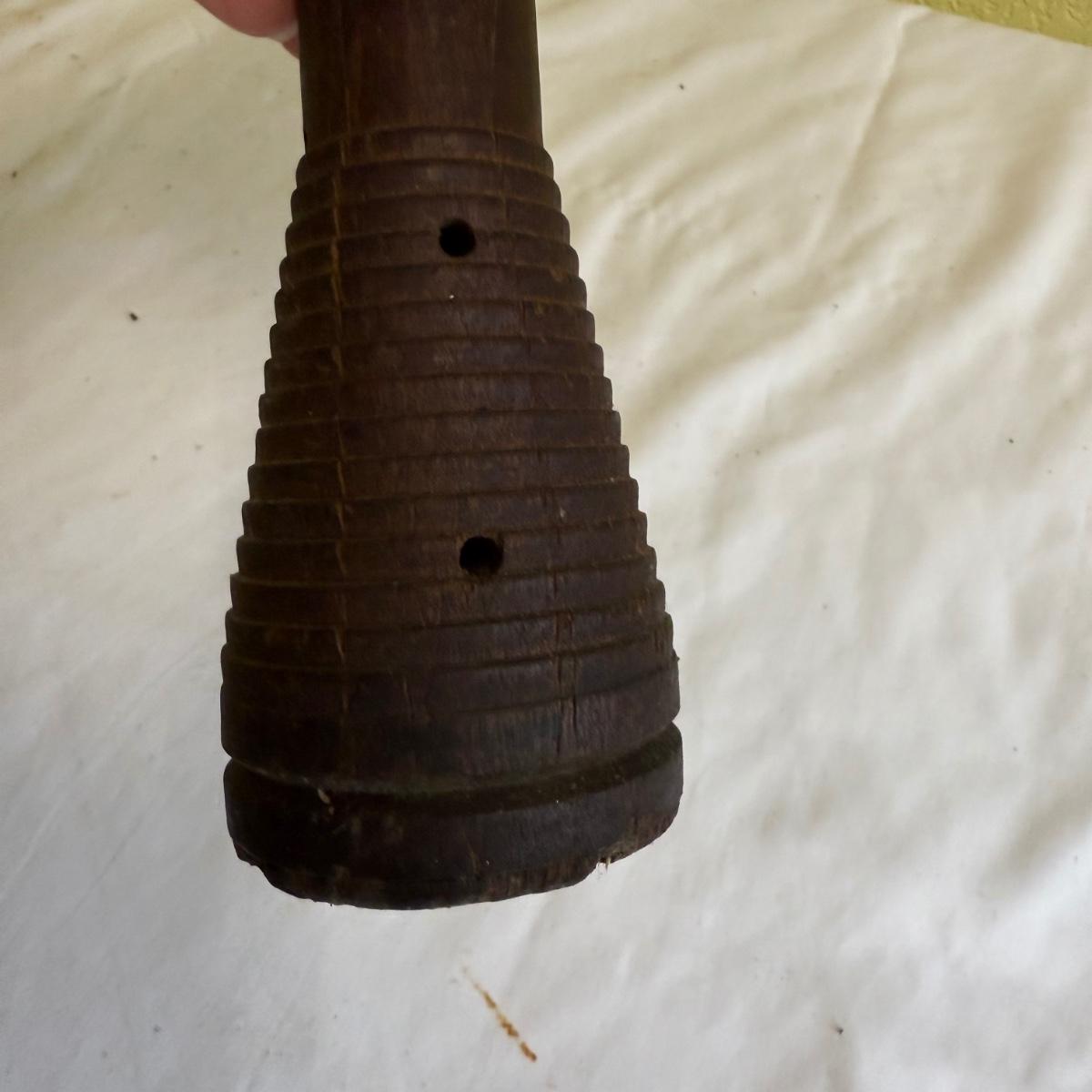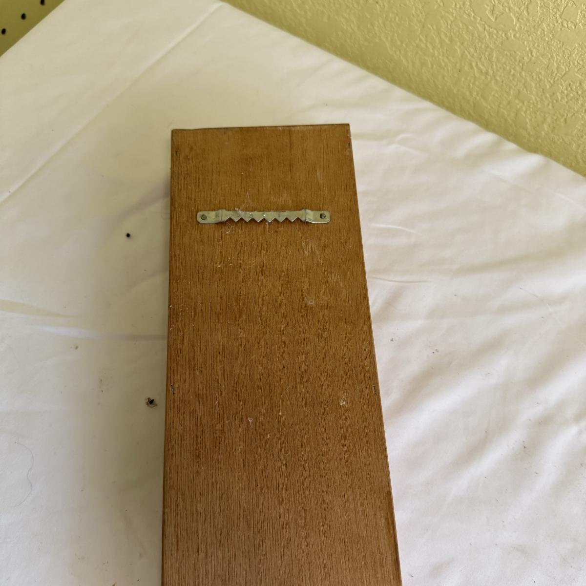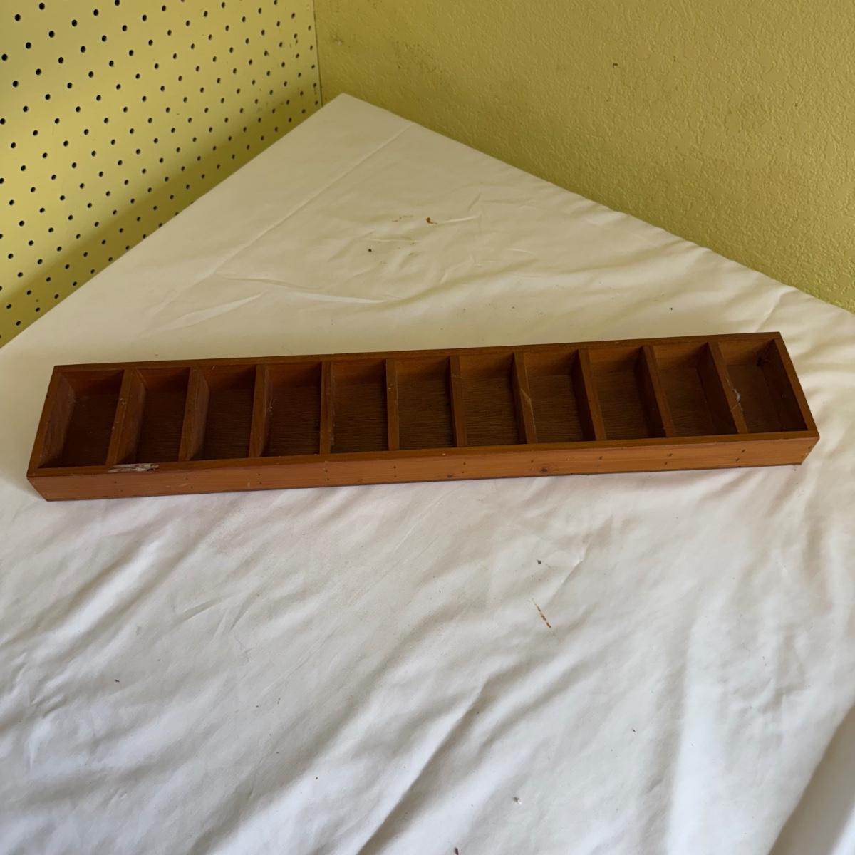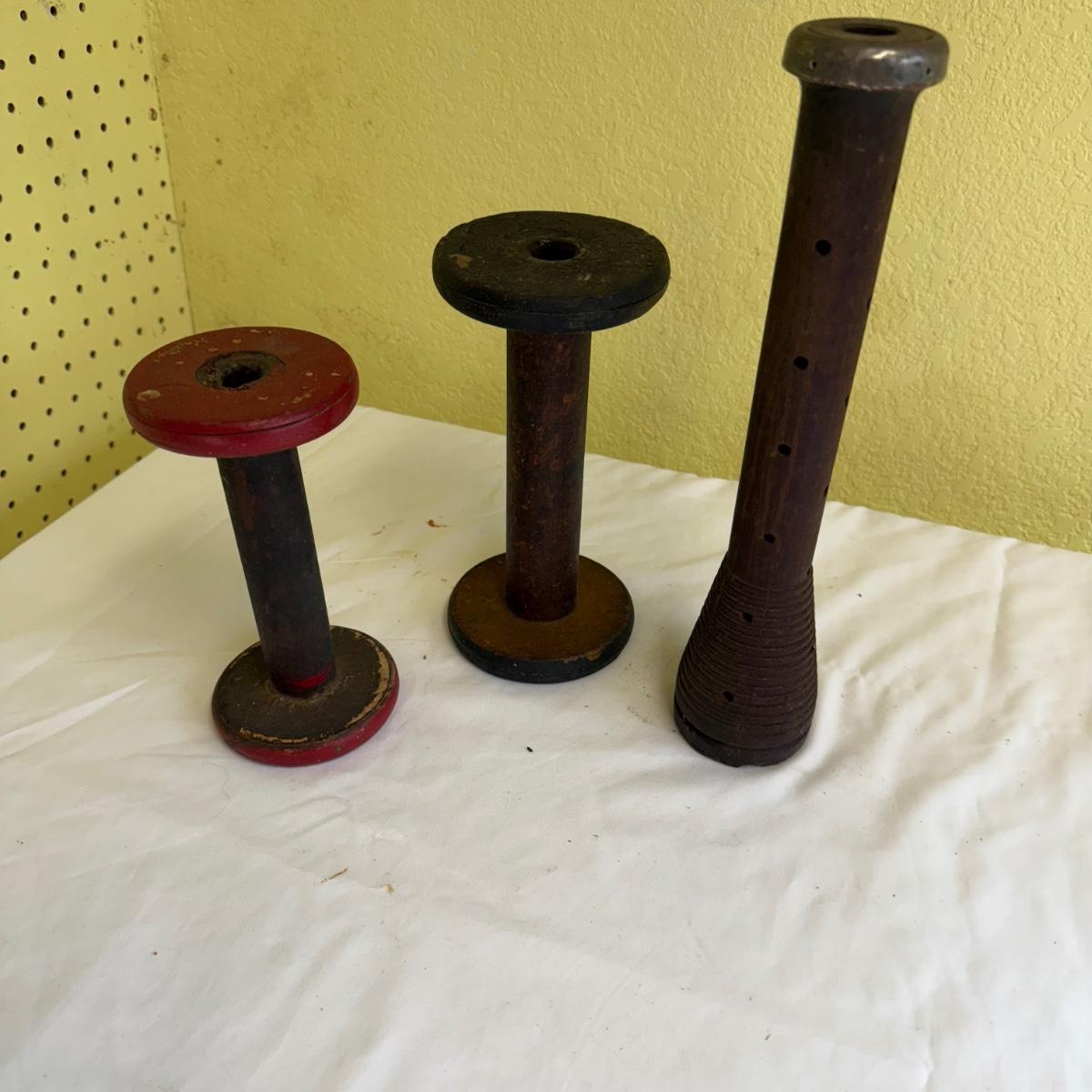 A vintage printer drawer letterpress tray measures 32” X 16.75” X 3.25”H. The wooden box container measures 4.25” X 24” X 1.5”H. Three wooden spools, the largest measures 2.24”D X 12”H.