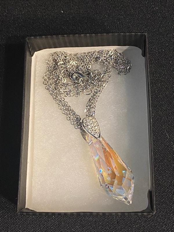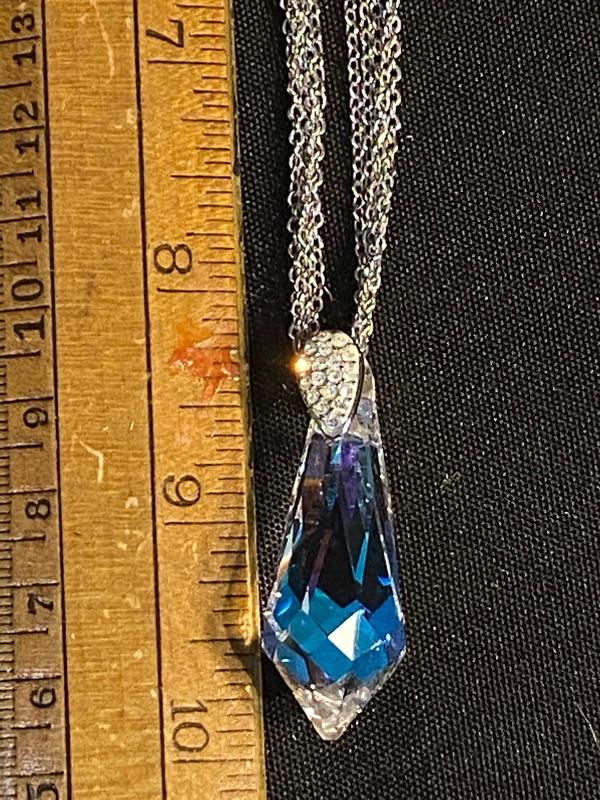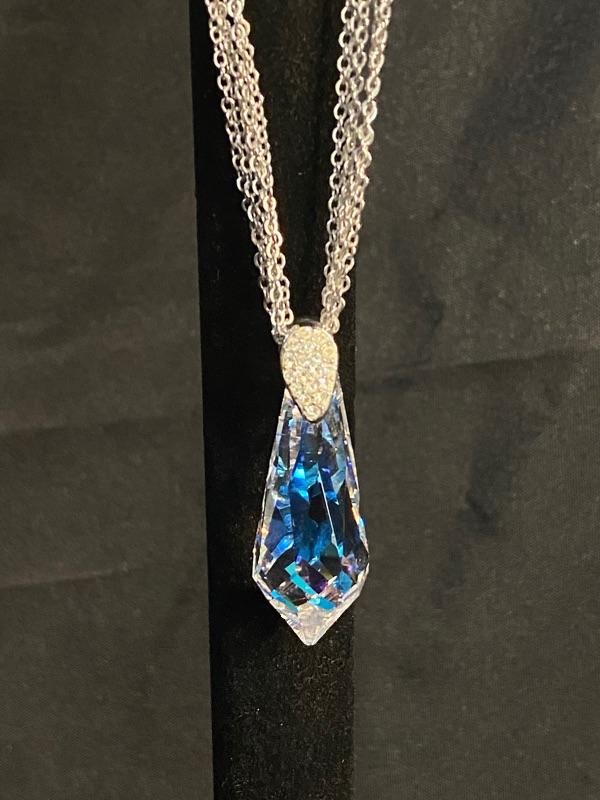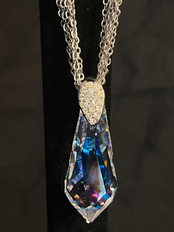 Beautiful Crystal Pendant Necklace. Prismatic, very reflective. Pave rhinestone loop. Multistrand silvertone necklace. Very pretty.