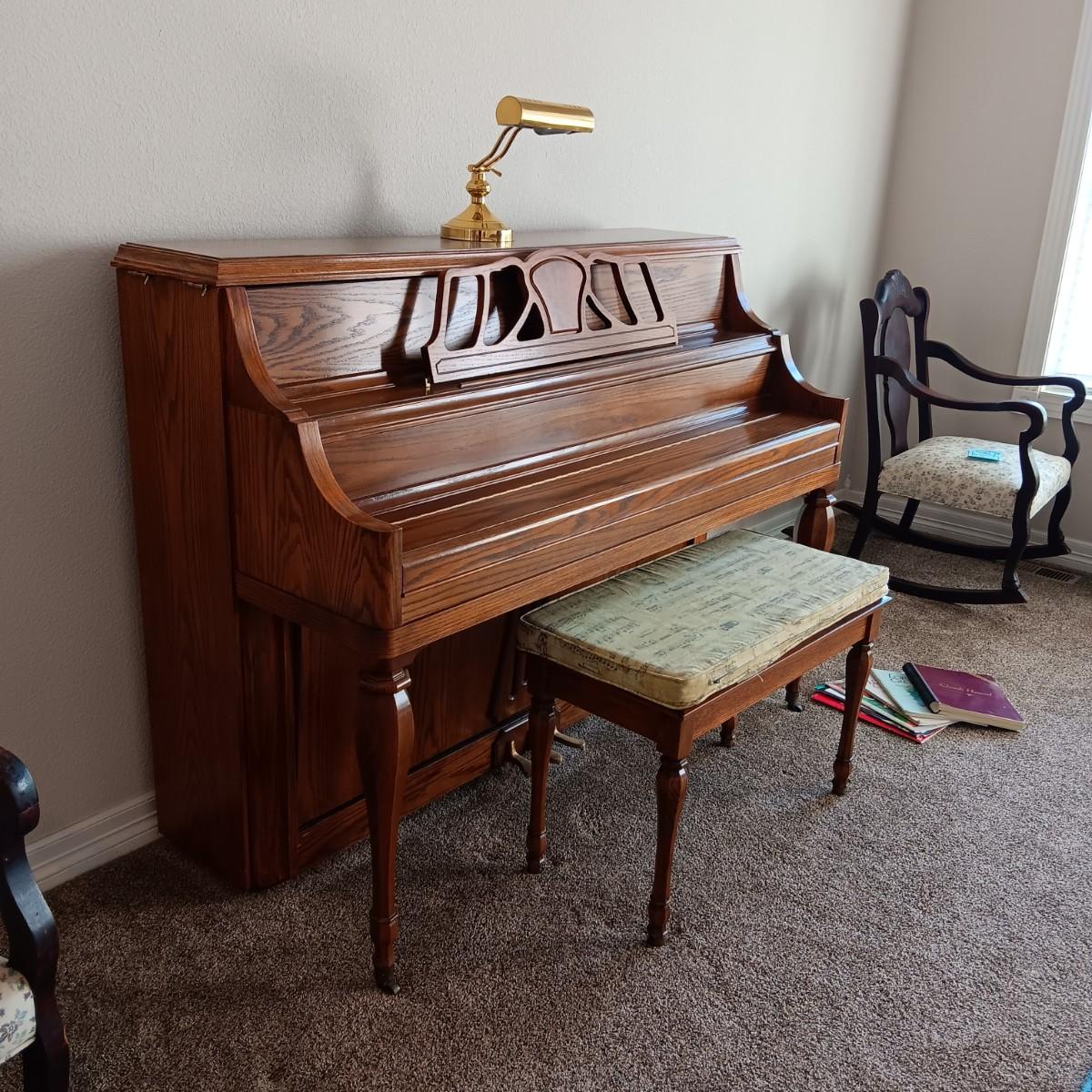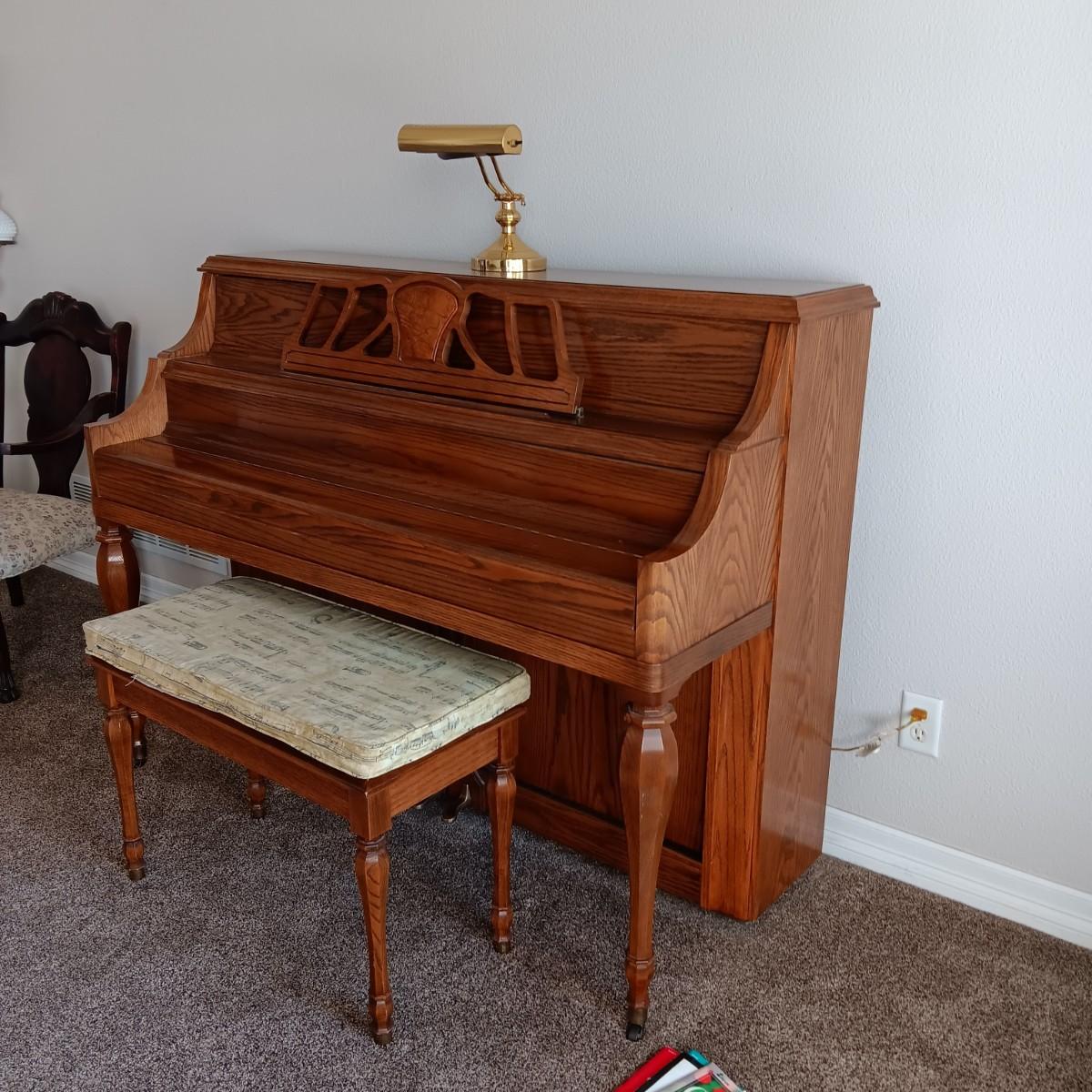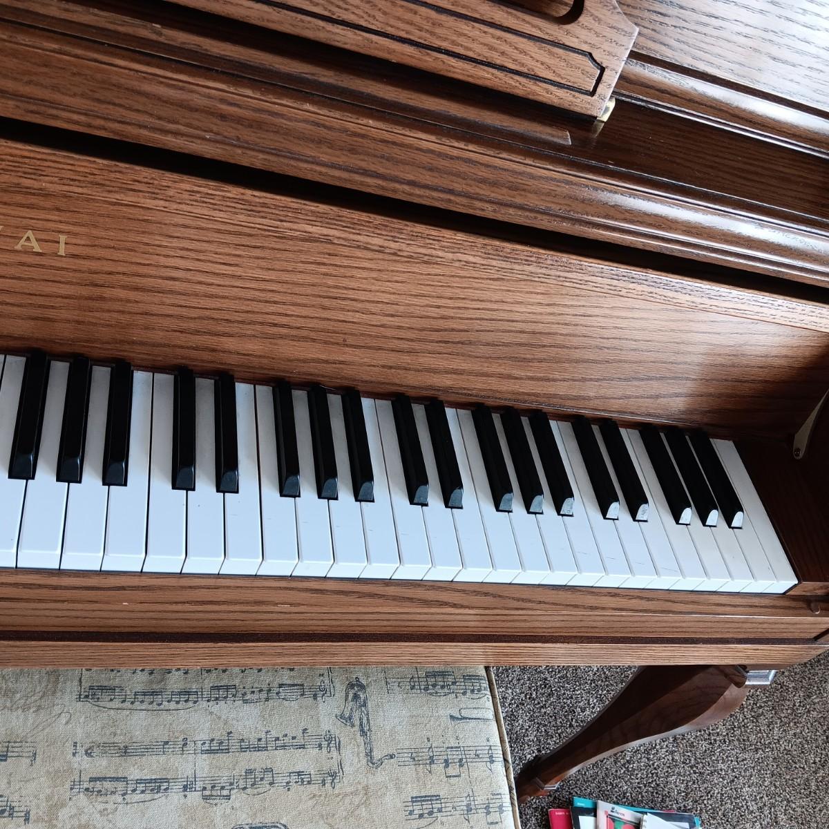 PRISTINE KAWAI PIANO W/ BENCH, SHEET MUSIC AND LAMP