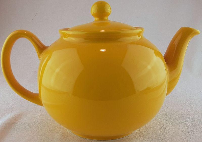 Yellow ceramic teapot from England. Measures 5.5in. tall including the lid. 9in. across handle to spout