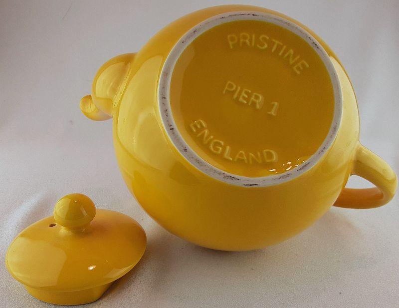 Yellow ceramic teapot from England. Measures 5.5in. tall including the lid. 9in. across handle to spout